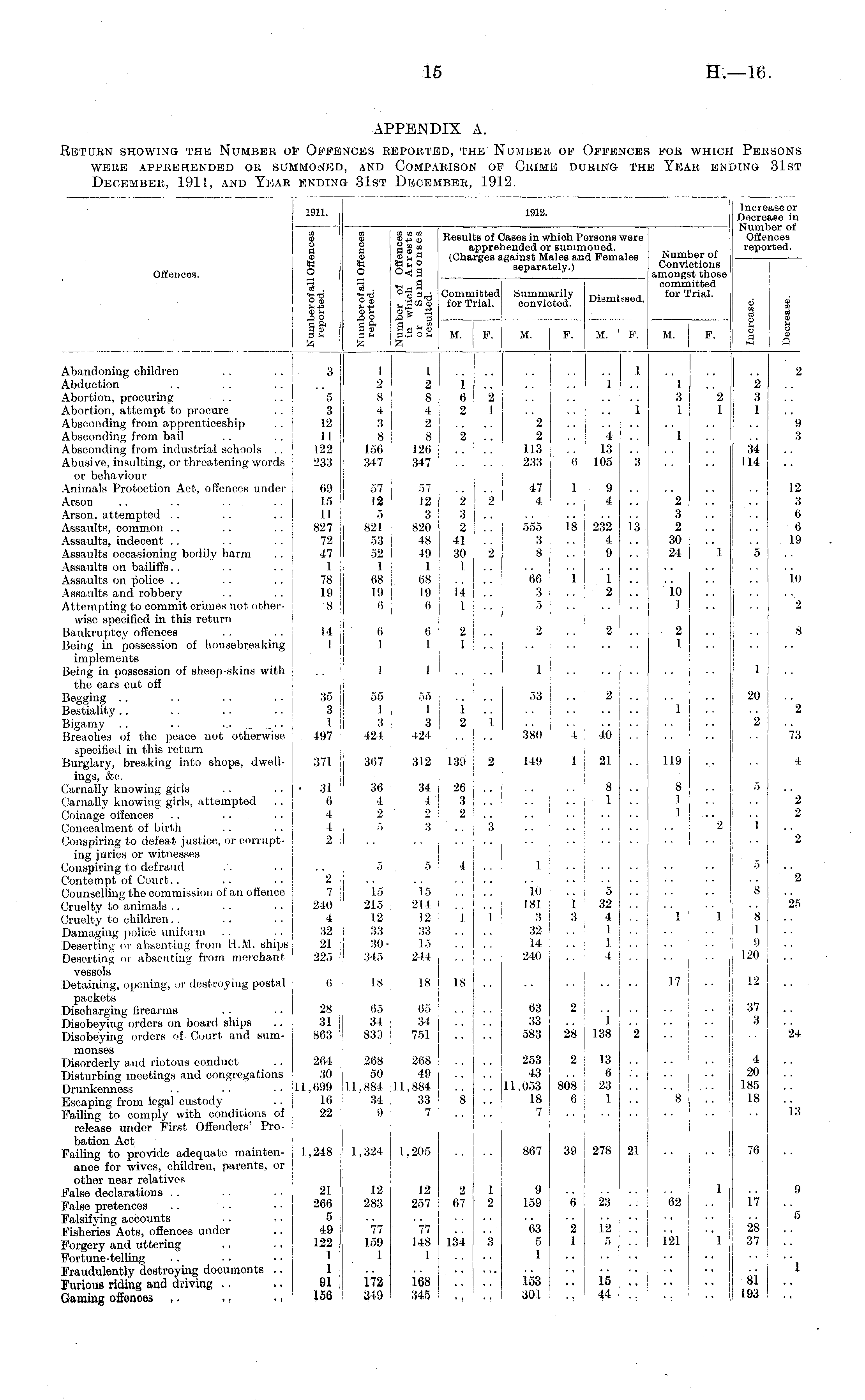APPENDIX A. Return showing the Number of Offences reported, the Number of Offences for which Persons were apprehended or summoned, and Comparison of Crime during the Year ending 31st December, 1911, and Year ending 31st December, 1912.