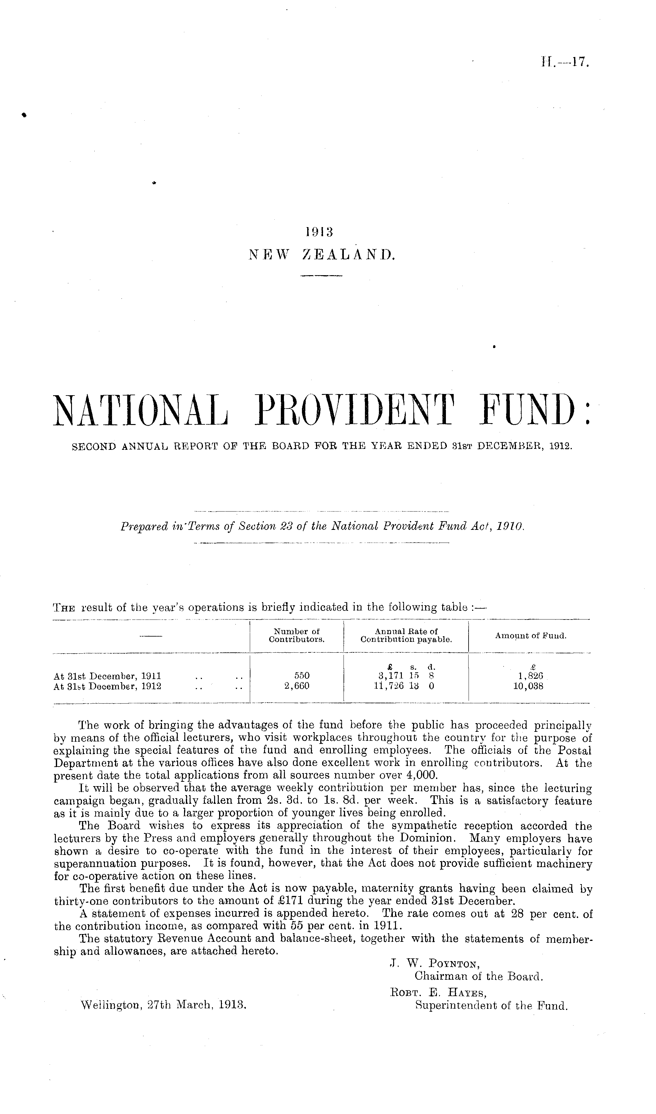 NATIONAL PROVIDENT FUND: SECOND ANNUAL REPORT OF THE BOARD FOR THE YEAR ENDED 31st DECEMBER, 1912.