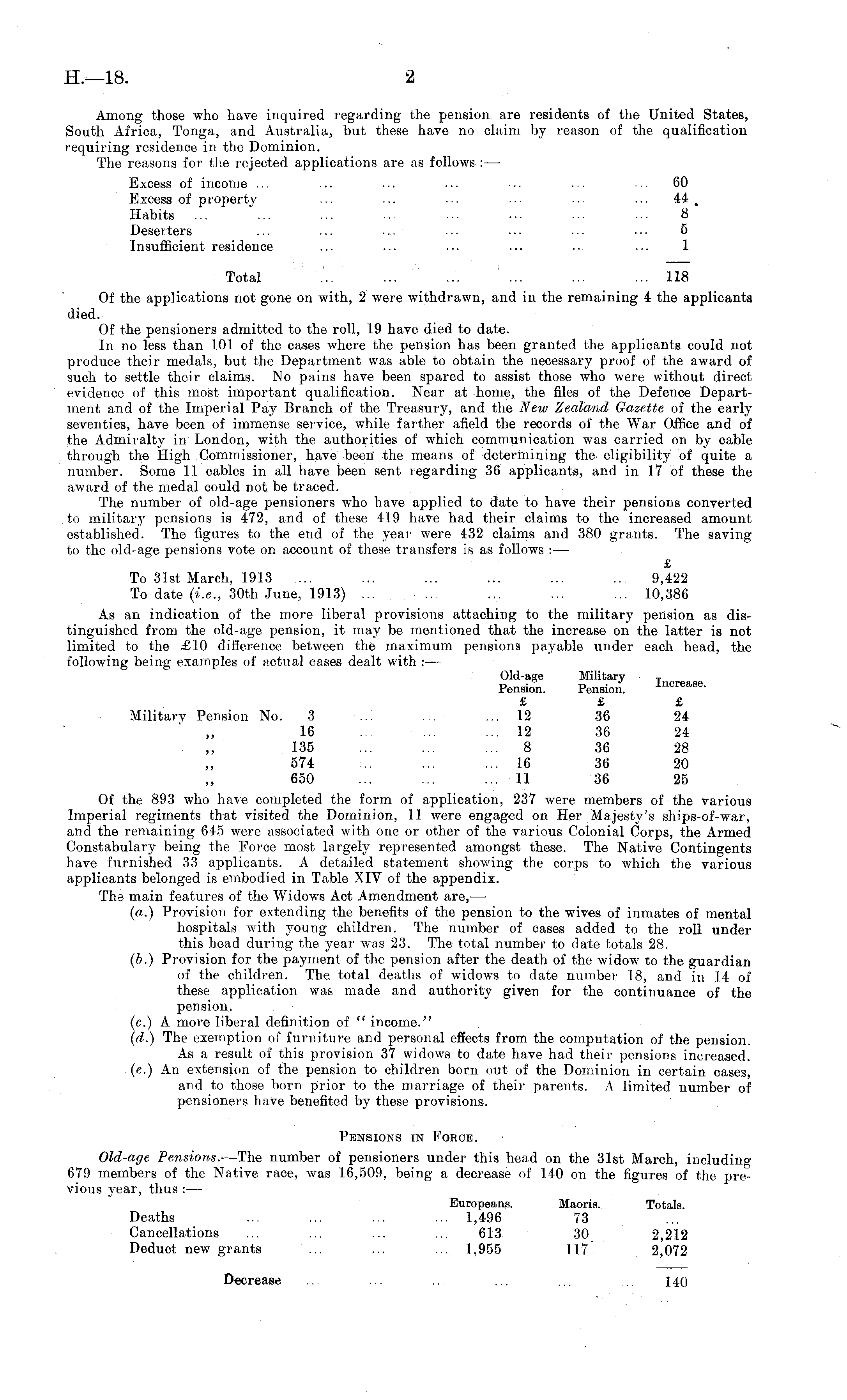 Among those who have inquired regarding the pension are residents of the United States, South Africa, Tonga, and Australia, but these have no claim by reason of the qualification requiring residence in the Dominion. The reasons for the rejected applications are as follows : — Excess of income ... ... ... ... ... ... ... 60 Excess of property ... ... ... .. ... ... 44 „ Habits ... ... ... ... •■■ ••■ ... ■■■ 8 Deserters ... ... ... ■•■ ... •■■ ••■ 5 Insufficient residence ... ... ... ... ... ... 1 Total ... ... ... 118 Of the applications not gone on with, 2 were withdrawn, and in the remaining 4 the applicants died. Of the pensioners admitted to the roll, 19 have died to date. In no less than 101 of the cases where the pension has been granted the applicants could not produce their medals, but the Department was able to obtain the necessary proof of the award of such to settle their claims. No pains have been spared to assist those who were without direct evidence of this most important qualification. Near at home, the files of the Defence Department and of the Imperial Pay Branch of the Treasury, and the New Zealand Gazette of the early seventies, have been of immense service, while farther afield the records of the War Office and of the Admiralty in London, with the authorities of which communication was carried on by cable through the High Commissioner, have been the means of determining the eligibility of quite a number. Some 11 cables in all have been sent regarding 36 applicants, and in 17 of these the award of the medal could not be traced. The number of old-age pensioners who have applied to date to have their pensions converted to military pensions is 472, and of these 419 have had their claims to the increased amount established. The figures to the end of the year were 432 claims and 380 grants. The saving to the old-age pensions vote on account of these transfers is as follows :— £ To 31st March, 1913 ... ... ... ... ... ... 9,422 To date (i.e., 30th June, 1913) ... ... ... ... ... 10,386 As an indication of the more liberal provisions attaching to the military pension as distinguished from the old-age pension, it may be mentioned that the increase on the latter is not limited to the £10 difference between the maximum pensions payable under each head, the following being examples of actual cases dealt with : — Old-age Military T Pension. Pension £ £ £ Military Pension No. 3 ... ... ... 12 36 24 16 ... ... ... 12 36 24 135 ... ... ... 8 36 28 574 :.. ... ... 16 36 20 650 ... ... ... 11 36 25 Of the 893 who have completed the form of application, 237 were members of the various Imperial regiments that visited the Dominion, 11 were engaged on Her Majesty's ships-of-war, and the remaining 645 were associated with one or other of the various Colonial Corps, the Armed Constabulary being the Force most largely represented amongst these. The Native Contingents have furnished 33 applicants. A detailed statement showing the corps to which the various applicants belonged is embodied in Table XIV of the appendix. The main features of the Widows Act Amendment are, — («.) Provision for extending the benefits of the pension to the wives of inmates of mental hospitals with young children. The number of cases added to the roll under this head during the year was 23. The total number to date totals 28. (b.) Provision for the payment of the pension after the death of the widow to the guardian of the children. The total deaths of widows to date number 18, and in 14 of these application was made and authority given for the continuance of the pension. (c.) A more liberal definition of " income." (d.) The exemption of furniture and personal effects from the computation of the pension. As a result of this provision 37 widows to date have had their pensions increased. (c.) An extension of the pension to children born out of the Dominion in certain cases, and to those born prior to the marriage of their parents. A limited number of pensioners have benefited by these provisions. Pensions in Force. Old-age Pensions. —The number of pensioners under this head on the 31st March, including 679 members of the Native race, was 16,509, being a decrease of 140 on the figures of the previous year, thus : — Europeans. Maoris. Totals. Deaths ... ... ... ... 1,496 73 Cancellations ... ... ... ... 613 30 2,212 Deduct new grants ... ... ... 1,955 117 2,072 Decrease ... ... ... ... ... .. 14()