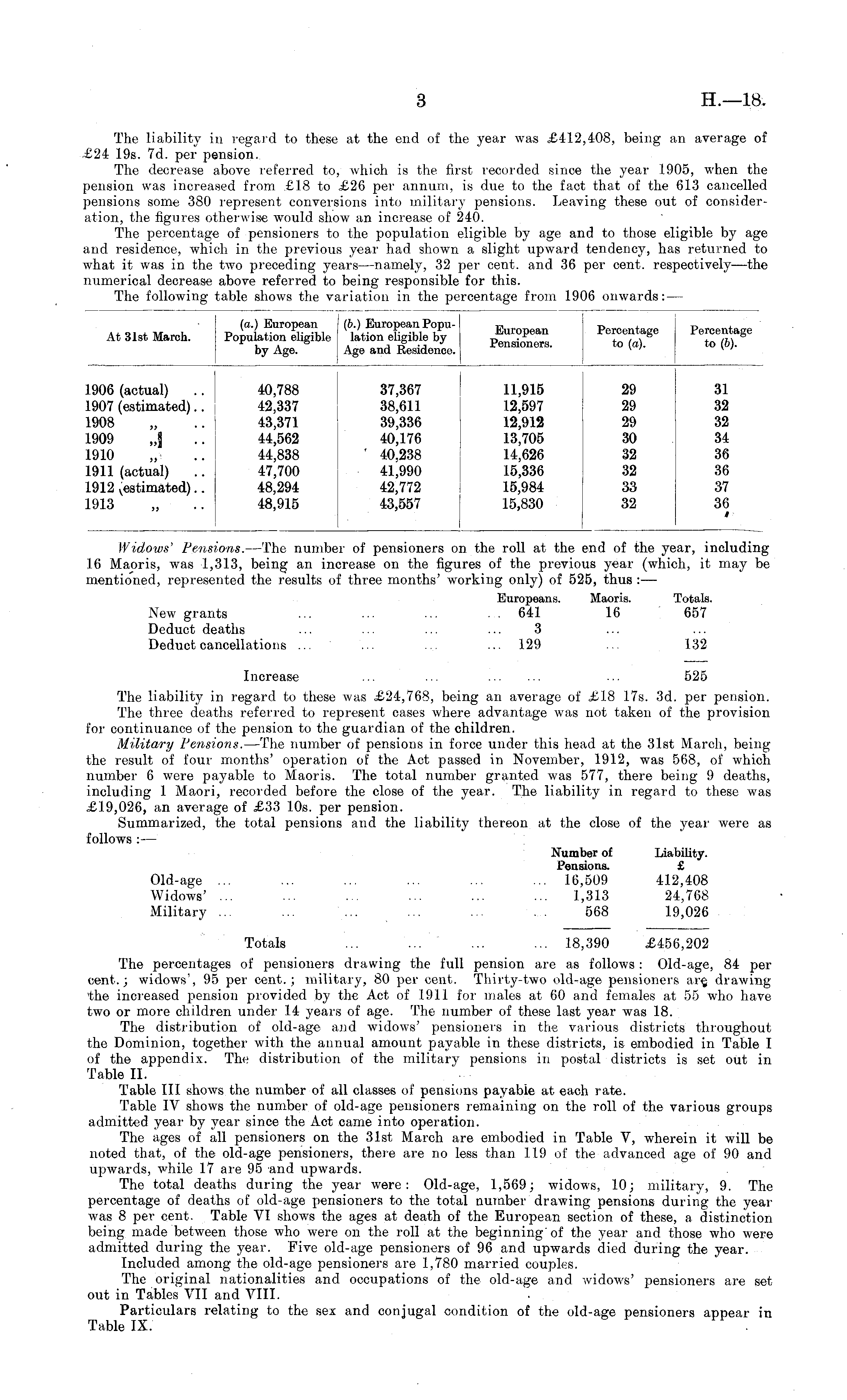 The liability in regard to these at the end of the year was £412,408, being an average of £24 19s. 7d. per pension. The decrease above referred to, which is the first recorded since the year 1905, when the pension was increased from £18 to £26 per annum, is due to the fact that of the 613 cancelled pensions some 380 represent conversions into military pensions. Leaving these out of consideration, the figures otherwise would show an increase of 240. The percentage of pensioners to the population eligible by age and to those eligible by age and residence, which in the previous year had shown a slight upward tendency, has returned to what it was in the two preceding years —namely, 32 per cent, and 36 per cent, respectively—the numerical decrease above referred to being responsible for this. The following table shows the variation in the percentage from 1906 onwards: —