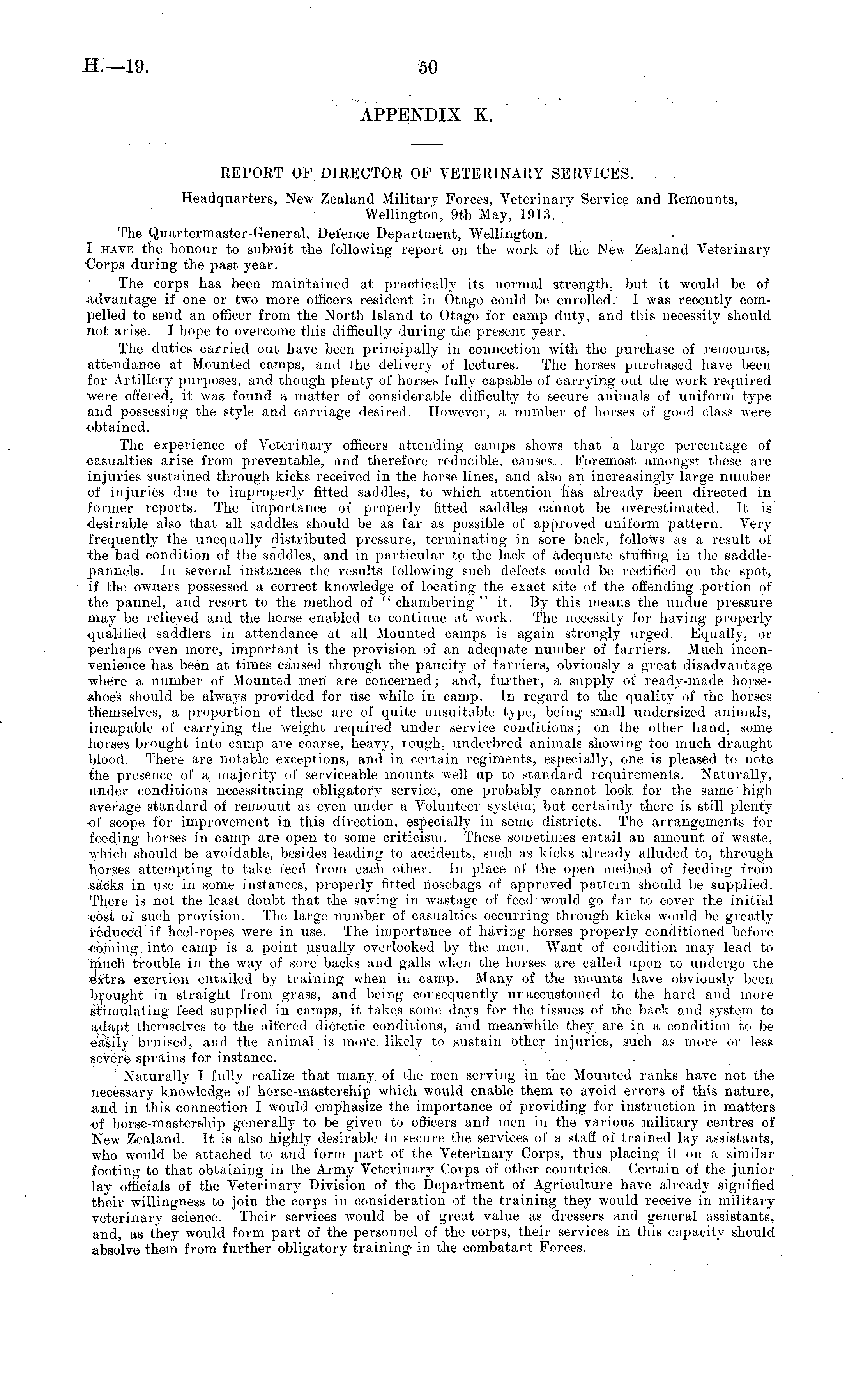 APPENDIX K. REPORT OF DIRECTOR OF VETERINARY SERVICES. Headquarters, New Zealand Military Forces, Veterinary Service and Remounts, Wellington, 9th May, 1913. The Quartermaster-General, Defence Department, Wellington. I have the honour to submit the following report on the work of the New Zealand Veterinary Corps during the past year. The corps has been maintained at practically its normal strength, but it would be of advantage if one or two more officers resident in Otago could be enrolled. I was recently compelled to send an officer from the North Island to Otago for camp duty, and this necessity should not arise. I hope to overcome this difficulty during the present year. The duties carried out have been principally in connection with the purchase of remounts, attendance at Mounted camps, and the delivery of lectures. The horses purchased have been for Artillery purposes, and though plenty of horses fully capable of carrying out the work required were offered, it was found a matter of considerable difficulty to secure animals of uniform type and possessing the style and carriage desired. However, a number of horses of good class were obtained. The experience of Veterinary officers attending camps shows that a large percentage of -casualties arise from preventable, and therefore reducible, causes.. Foremost amongst these are injuries sustained through kicks received in the horse lines, and also an increasingly large number of injuries due to improperly fitted saddles, to which attention has already been directed in former reports. The importance of properly fitted saddles cannot be overestimated. It is desirable also that all saddles should be as far as possible of approved uniform pattern. Very frequently the unequally distributed pressure, terminating in sore back, follows as a result of the bad condition of the saddles, and in particular to the lack of adequate stuffing in the saddlepannels. In several instances the results following such defects could be rectified on the spot, if the owners possessed a correct knowledge of locating the exact site of the offending portion of the pannel, and resort to the method of " chambering " it. By this means the undue pressure may be relieved and the horse enabled to continue at work. The necessity for having properly qualified saddlers in attendance at all Mounted camps is again strongly urged. Equally, or perhaps even more, important is the provision of an adequate number of farriers. Much inconvenience has been at times caused through the paucity of farriers, obviously a great disadvantage where a number of Mounted men are concerned; and, further, a supply of ready-made horseshoes should be provided for use while in camp. In regard to the quality of the horses themselves, a proportion of these are of quite unsuitable type, being small undersized animals, incapable of carrying the weight required under service conditions; on the other hand, some horses brought into camp are coarse, heavy, rough, underbred animals showing too much draught blood. There are notable exceptions, and in certain regiments, especially, one is pleased to note the presence of a majority of serviceable mounts well up to standard requirements. Naturally, under conditions necessitating obligatory service, one probably cannot look for the same high average standard of remount as even under a Volunteer system, but certainly there is still plenty of scope for improvement in this direction, especially in some districts. The arrangements for feeding horses in camp are open to some criticism. These sometimes entail an amount of waste, which should be avoidable, besides leading to accidents, such as kicks already alluded to, through horses attempting to take feed from each other. In place of the open method of feeding from sacks in use in some instances, properly fitted nosebags of approved pattern should be supplied. There is not the least doubt that the saving in wastage of feed would go far to cover the initial cost of such provision. The large number of casualties occurring through kicks would be greatly reduced if heel-ropes were in use. The importance of having horses properly conditioned before coming into camp is a point usually overlooked by the men. Want of condition may lead to much trouble in the way of sore backs and galls when the horses are called upon to undergo the extra exertion entailed by training when in camp. Many of the mounts have obviously been brought in straight from grass, and being . consequently unaccustomed to the hard and more stimulating feed supplied in camps, it takes some days for the tissues of the back and system to adapt themselves to the altered dietetic conditions, and meanwhile they are in a condition to be easily bruised, and the animal is more likely to sustain other injuries, such as more or less severe sprains for instance. Naturally I fully realize that many of the men serving in the Mounted ranks have not the necessary knowledge of horse-mastership which would enable them to avoid errors of this nature, and in this connection I would emphasize the importance of providing for instruction in matters of horse-mastership generally to be given to officers and men in the various military centres of New Zealand. It is also highly desirable to secure the services of a staff of trained lay assistants, who would be attached to and form part of the Veterinary Corps, thus placing it on a similar footing to that obtaining in the Army Veterinary Corps of other countries. Certain of the junior lay officials of the Veterinary Division of the Department of Agriculture have already signified their willingness to join the corps in consideration of the training they would receive in military veterinary science. Their services would be of great value as dressers and general assistants, and, as they would form part of the personnel of the corps, their services in this capacity should absolve them from further obligatory training- in the combatant Forces.