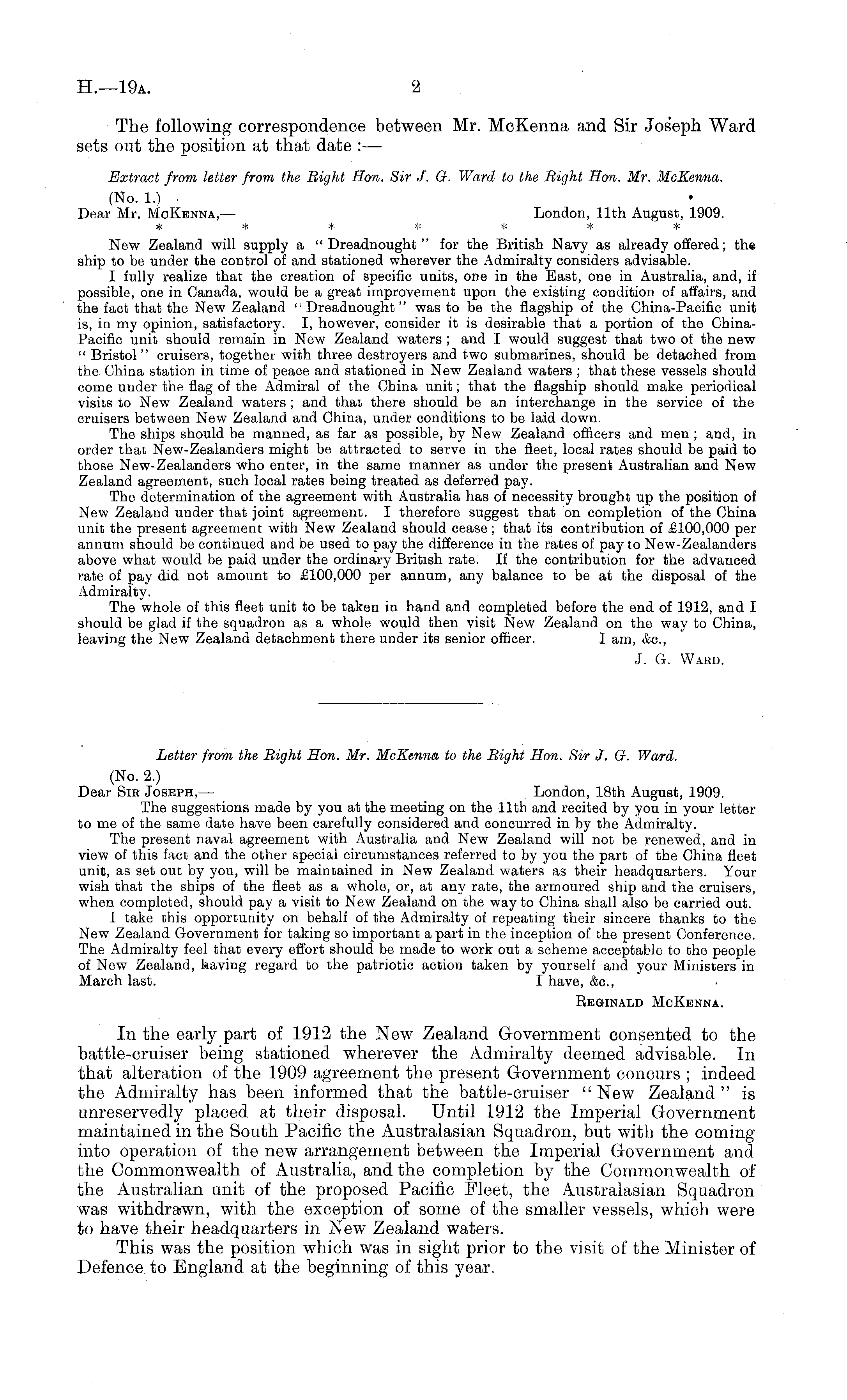 The following correspondence between Mr. McKenna and Sir Joseph Ward sets out the position at that date :— Extract from letter from the Bight Hon. Sir J. G. Ward to the Bight Hon. Mr. McKenna. (No. 1.) Dear Mr. McKenna,— London, 11th August, 1909. * * * * * * * New Zealand will supply a "Dreadnought" for the British Navy as already offered; the ship to be under the control of and stationed wherever the Admiralty considers advisable. I fully realize that the creation of specific units, one in the East, one in Australia, and, if possible, one in Canada, would be a great improvement upon the existing condition of affairs, and the fact that the New Zealand "Dreadnought" was to be the flagship of the China-Pacific unit is, in my opinion, satisfactory. I, however, consider it is desirable that a portion of the ChinaPacific unit should remain in New Zealand waters ; and I would suggest that two of the new " Bristol" cruisers, together with three destroyers and two submarines, should be detached from the China station in time of peace and stationed in New Zealand waters ; that these vessels should come under the flag of the Admiral of the China unit; that the flagship should make periodical visits to New Zealand waters ; and that there should be an interchange in the service of the cruisers between New Zealand and China, under conditions to be laid down. The ships should be manned, as far as possible, by New Zealand officers and men ; and, in order that New-Zealanders might be attracted to serve in the fleet, local rates should be paid to those New-Zealanders who enter, in the same manner as under the present Australian and New Zealand agreement, such local rates being treated as deferred pay. The determination of the agreement with Australia has of necessity brought up the position of New Zealand under that joint agreement. I therefore suggest that on completion of the China unit the present agreement with New Zealand should cease ; that its contribution of £100,000 per annum should be continued and be used to pay the difference in the rates of pay to New-Zealanders above what would be paid under the ordinary British rate. If the contribution for the advanced rate of pay did not amount to £100,000 per annum, any balance to be at the disposal of the Admiralty. The whole of this fleet unit to be taken in hand and completed before the end of 1912, and I should be glad if the squadron as a whole would then visit New Zealand on the way to China, leaving the New Zealand detachment there under its senior officer. I am, &c, J. G. Wabd.