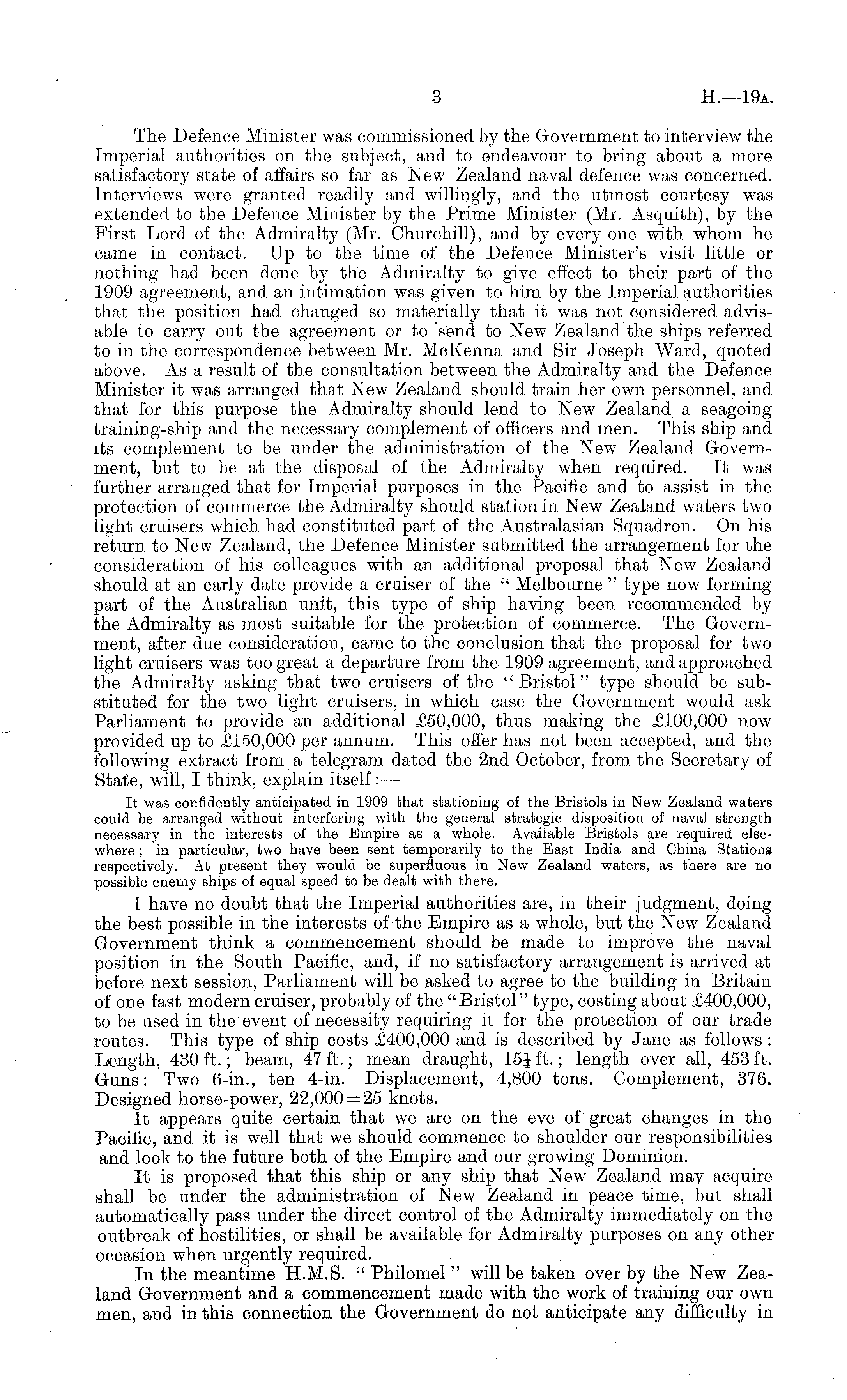 The Defence Minister was commissioned by the Government to interview the Imperial authorities on the subject, and to endeavour to bring about a more satisfactory state of affairs so far as New Zealand naval defence was concerned. Interviews were granted readily and willingly, and the utmost courtesy was extended to the Defence Minister by the Prime Minister (Mr. Asquith), by the First Lord of the Admiralty (Mr. Churchill), and by every one with whom he came in contact. Up to the time of the Defence Minister's visit little or nothing had been done by the Admiralty to give effect to their part of the 1909 agreement, and an intimation was given to him by the Imperial authorities that the position had changed so materially that it was not considered advisable to carry out the agreement or to send to New Zealand the ships referred to in the correspondence between Mr. McKenna and Sir Joseph Ward, quoted above. As a result of the consultation between the Admiralty and the Defence Minister it was arranged that New Zealand should train her own personnel, and that for this purpose the Admiralty should lend to New Zealand a seagoing training-ship and the necessary complement of officers and men. This ship and its complement to be under the administration of the New Zealand Government, but to be at the disposal of the Admiralty when required. It was further arranged that for Imperial purposes in the Pacific and to assist in the protection of commerce the Admiralty should station in New Zealand waters two light cruisers which had constituted part of the Australasian Squadron. On his return to New Zealand, the Defence Minister submitted the arrangement for the consideration of his colleagues with an additional proposal that New Zealand should at an early date provide a cruiser of the " Melbourne " type now forming part of the Australian unit, this type of ship having been recommended by the Admiralty as most suitable for the protection of commerce. The Government, after due consideration, came to the conclusion that the proposal for two light cruisers was too great a departure from the 1909 agreement, and approached the Admiralty asking that two cruisers of the "Bristol" type should be substituted for the two light cruisers, in which case the Government would ask Parliament to provide an additional i 250,000, thus making the i 2100,000 now provided up to £150,000 per annum. This offer has not been accepted, and the following extract from a telegram dated the 2nd October, from the Secretary of State, will, I think, explain itself:— It was confidently anticipated in 1909 that stationing of the Bristol s in New Zealand waters could be arranged without interfering with the general strategic disposition of naval strength necessary in the interests of the Empire as a whole. Available Bristols are required elsewhere ; in particular, two have been sent temporarily to the East India and China Stations respectively. At present they would be superfluous in New Zealand waters, as there are no possible enemy ships of equal speed to be dealt with there. I have no doubt that the Imperial authorities are, in their judgment, doing the best possible in the interests of the Empire as a whole, but the New Zealand Government think a commencement should be made to improve the naval position in the South Pacific, and, if no satisfactory arrangement is arrived at before next session, Parliament will be asked to agree to the building in Britain of one fast modern cruiser, probably of the "Bristol" type, costing about i 2400,000, to be used in the event of necessity requiring it for the protection of our trade routes. This type of ship costs J400,000 and is described by Jane as follows : Length, 430 ft.; beam, 47 ft.; mean draught, 15jft.; length over all, 453 ft. Guns: Two 6-in., ten 4-in. Displacement, 4,800 tons. Complement, 376. Designed horse-power, 22,000 =25 knots. It appears quite certain that we are on the eve of great changes in the Pacific, and it is well that we should commence to shoulder our responsibilities and look to the future both of the Empire and our growing Dominion. It is proposed that this ship or any ship that New Zealand may acquire shall be under the administration of New Zealand in peace time, but shall automatically pass under the direct control of the Admiralty immediately on the outbreak of hostilities, or shall be available for Admiralty purposes on any other occasion when urgently required. In the meantime H.M.S. " Philomel " will be taken over by the New Zealand Government and a commencement made with the work of training our own men, and in this connection the Government do not anticipate any difficulty in