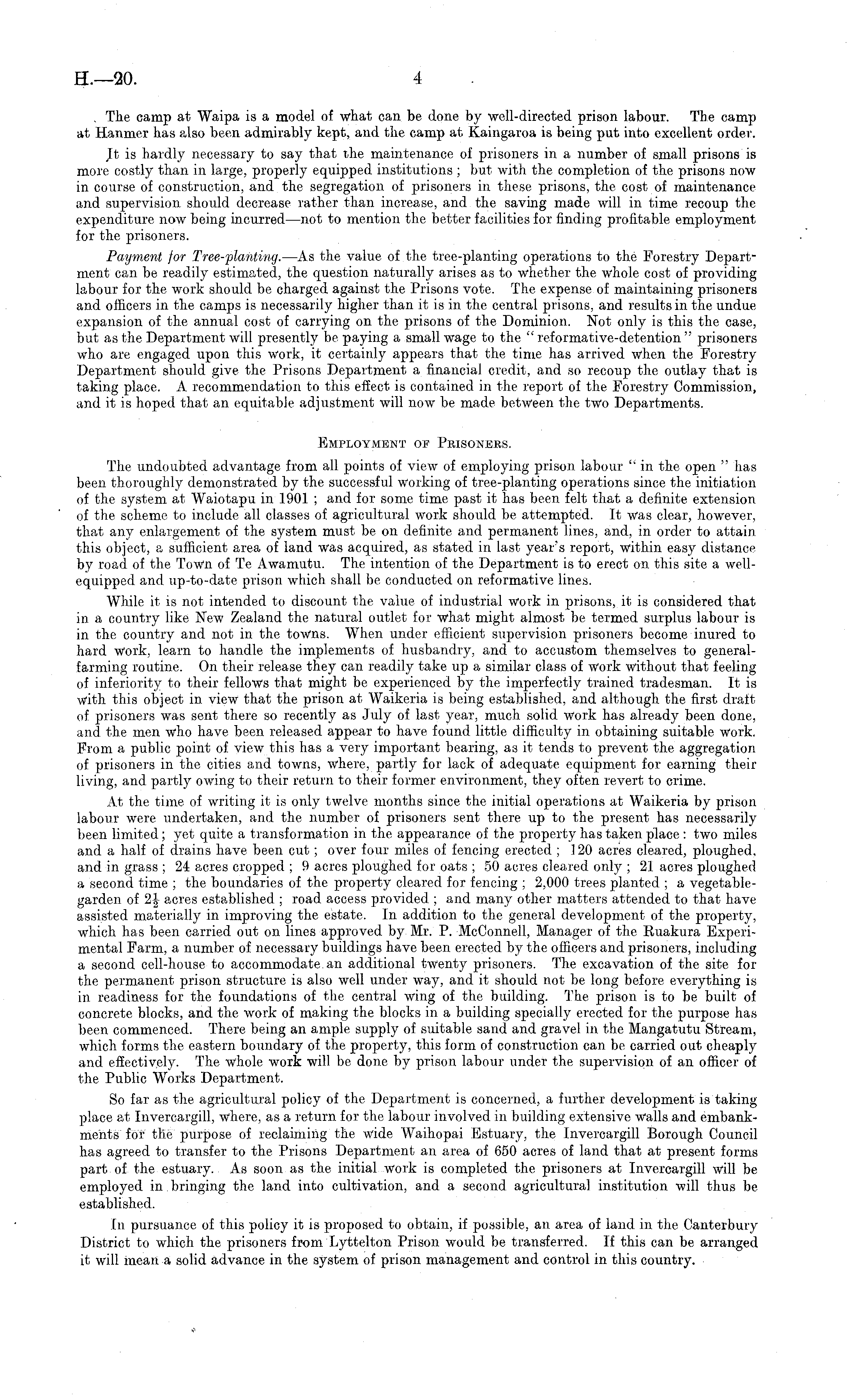 . The camp at Waipa is a model of what can be done by well-directed prison labour. The camp at Hanmer has also been admirably kept, and the camp at Kaingaroa is being put into excellent order. It is hardly necessary to say that the maintenance of prisoners in a number of small prisons is more costly than in large, properly equipped institutions ; but with the completion of the prisons now in course of construction, and the segregation of prisoners in these prisons, the cost of maintenance and supervision should decrease rather than increase, and the saving made will in time recoup the expenditure now being incurred—not to mention the better facilities for finding profitable employment for the prisoners. Payment for Tree-planting. —As the value of the tree-planting operations to the Forestry Department can be readily estimated, the question naturally arises as to whether the whole cost of providing labour for the work should be charged against the Prisons vote. The expense of maintaining prisoners and officers in the camps is necessarily higher than it is in the central prisons, and results in the undue expansion of the annual cost of carrying on the prisons of the Dominion. Not only is this the case, but as the Department will presently be. paying a small wage to the " reformative-detention " prisoners who are engaged upon this work, it certainly appears that the time has arrived when the Forestry Department should give the Prisons Department a financial credit, and so recoup the outlay that is taking place. A recommendation to this effect is contained in the report of the Forestry Commission, and it is hoped that an equitable adjustment will now be made between the two Departments. Employment of Prisoners. The undoubted advantage from all points of view of employing prison labour " in the open " has been thoroughly demonstrated by the successful working of tree-planting operations since the initiation of the system at Waiotapu in 1901 ; and for some time past it has been felt that a definite extension of the scheme to include all classes of agricultural work should be attempted. It was clear, however, that any enlargement of the system must be on definite and permanent lines, and, in order to attain this object, a sufficient area of land was acquired, as stated in last year's report, within easy distance by road of the Town of Te Awamutu. The intention of the Department is to erect on this site a wellequipped and up-to-date prison which shall be conducted on reformative lines. While it is not intended to discount the value of industrial work in prisons, it is considered that in a country like New Zealand the natural outlet for what might almost be termed surplus labour is in the country and not in the towns. When under efficient supervision prisoners become inured to hard Work, learn to handle the implements of husbandry, and to accustom themselves to generalfarming routine. On their release they can readily take up a similar class of work without that feeling of inferiority to their fellows that might be experienced by the imperfectly trained tradesman. It is with this object in view that the prison at Waikeria is being established, and although the first draft of prisoners was sent there so recently as July of last year, much solid work has already been done, and the men who have been released appear to have found little difficulty in obtaining suitable work. From a public point of view this has a very important bearing, as it tends to prevent the aggregation of prisoners in the cities and towns, where, partly for lack of adequate equipment for earning their living, and partly owing to their return to their former environment, they often revert to crime. At the time of writing it is only twelve months since the initial operations at Waikeria by prison labour were undertaken, and the number of prisoners sent there up to the present has necessarily been limited; yet quite a transformation in the appearance of the property has taken place : two miles and a half of drains have been cut; over four miles of fencing erected ; 120 acres cleared, ploughed, and in grass ; 24 acres cropped ; 9 acres ploughed for oats ; 50 acres cleared only ; 21 acres ploughed a second time ; the boundaries of the property cleared for fencing ; 2,000 trees planted ; a vegetablegarden of 2| acres established ; road access provided ; and many other matters attended to that have assisted materially in improving the estate. In addition to the general development of the property, which has been carried out on lines approved by Mr. P. McConnell, Manager of the Ruakura Experimental Farm, a number of necessary buildings have been erected by the officers and prisoners, including a second cell-house to accommodate.an additional twenty prisoners. The excavation of the site for the permanent prison structure is also well under way, and it should not be long before everything is in readiness for the foundations of the central wing of the building. The prison is to be built of concrete blocks, and the work of making the blocks in a building specially erected for the purpose has been commenced. There being an ample supply of suitable sand and gravel in the Mangatutu Stream, which forms the eastern boundary of the property, this form of construction can be, carried out cheaply and effectively. The whole work will be done by prison labour under the supervision of an officer of the Public Works Department. So far as the agricultural policy of the Department is concerned, a further development is taking place at Invercargill, where, as a return for the labour involved in building extensive walls and embankments for the purpose of reclaiming the wide Waihopai Estuary, the Invercargill Borough Council has agreed to transfer to the Prisons Department an area of 650 acres of land that at present forms part of the estuary. As soon as the initial work is completed the prisoners at Invercargill will be employed in bringing the land i