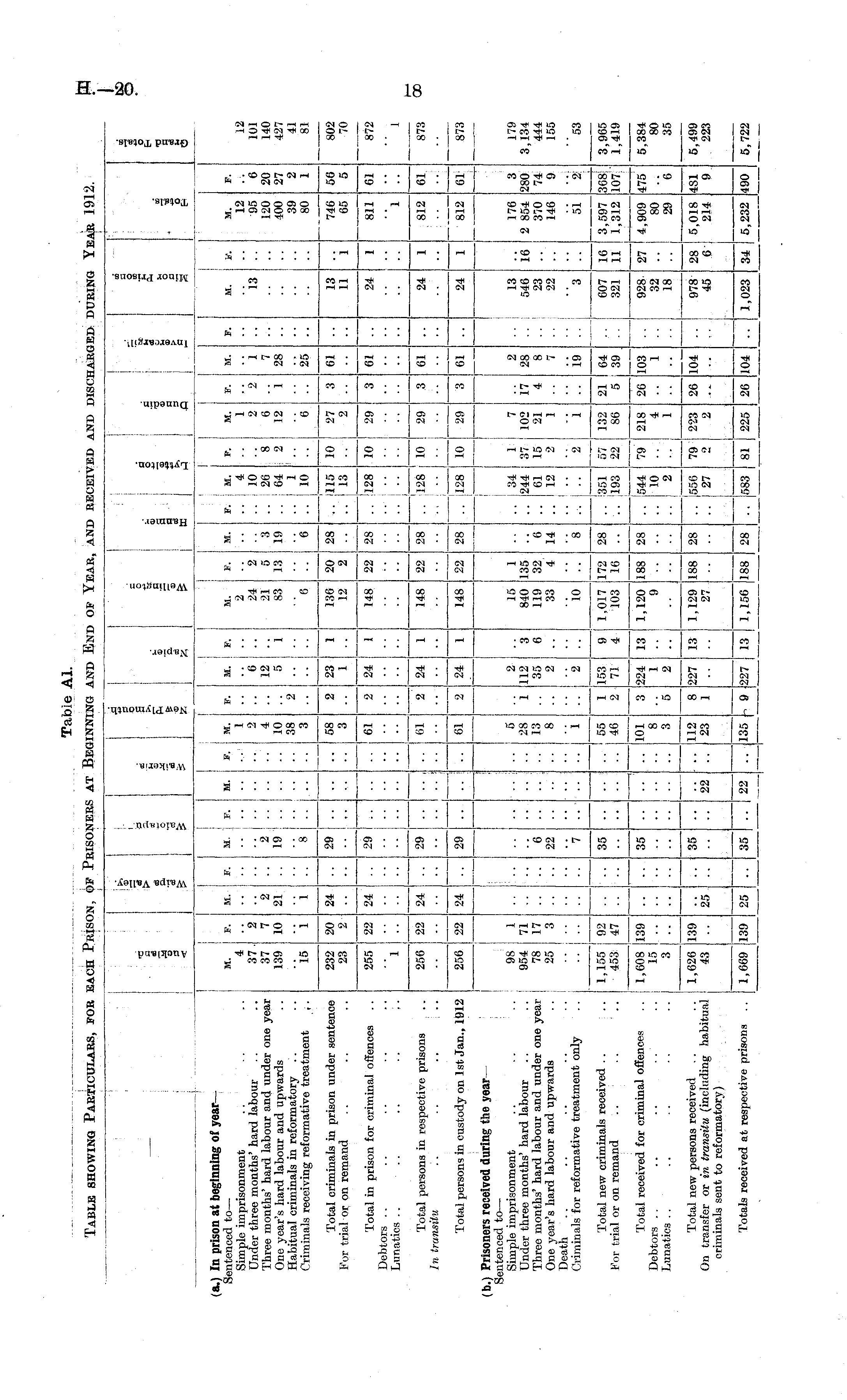 Table A1. Table showing Particulars, for each Prison, of Prisoners at Beginning and End of Year, and received and discharged during Year 1912.