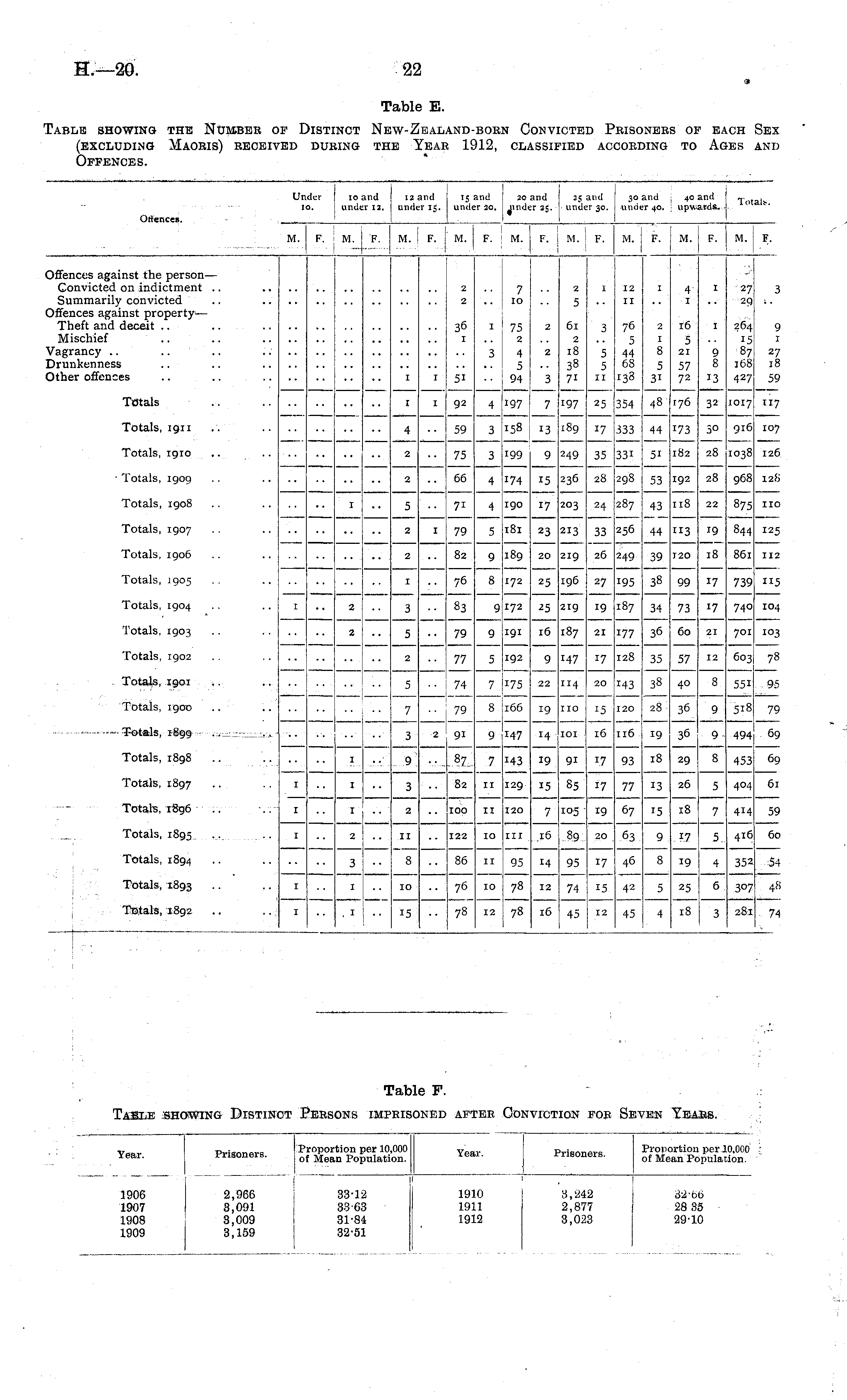 Table E. Table showing the Number of Distinct New-Zealand-born Convicted Prisoners of each Sex (excluding Maoris) received during the Year 1912, classified according to Ages and Offences.