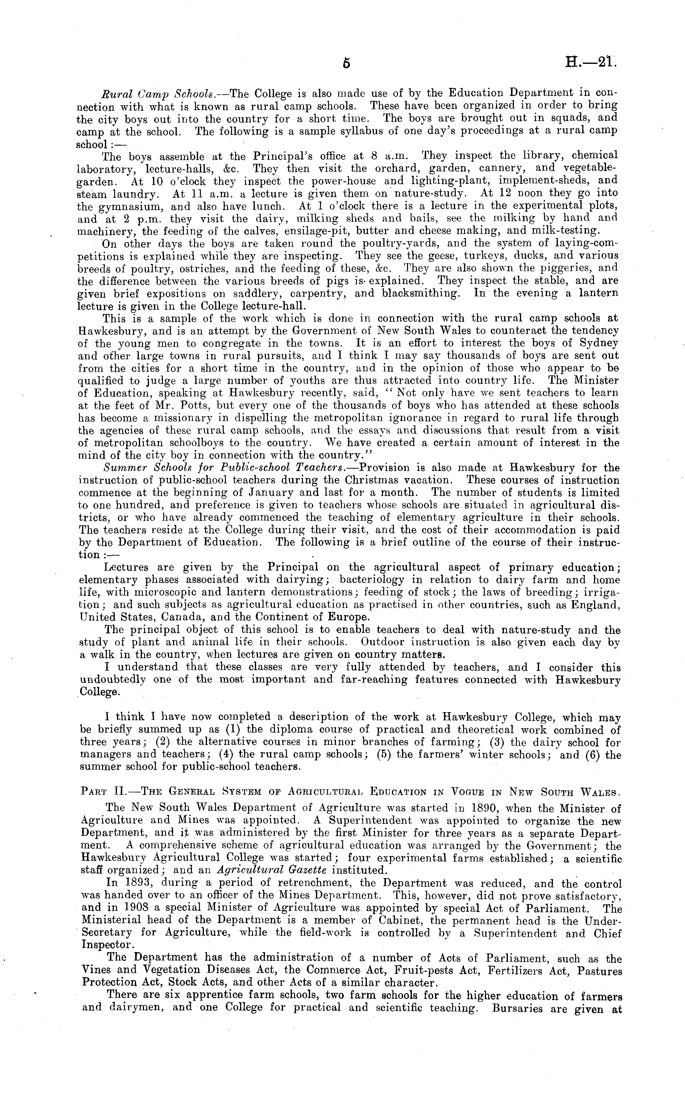 Rural Camp Schools. —The College is also made use of by the Education Department in connection with what is known as rural camp schools. These have been organized in order to bring the city boys out into the country for a short time. The boys are brought out in squads, and camp at the school. The following is a sample syllabus of one day's proceedings at a rural camp school :— The boys assemble at the Principal's office at 8 a.m. They inspect the library, chemical laboratory, lecture-halls, &c. They then visit the orchard, garden, cannery, and vegetablegarden. At 10 o'clock they inspect the power-house and lighting-plant, implement-sheds, and steam laundry. At 11 a.m. a lecture is given them on'nature-study. At 12 noon they go into the gymnasium, and also have lunch. At 1 o'clock there is a lecture in the experimental plots, and at 2 p.m. they visit the dairy, milking sheds and bails, see the milking by hand and machinery, the feeding of the calves, ensilage-pit, butter and cheese making, and milk-testing. On other days the boys are taken round the poultry-yards, and the system of laying-com-petitions is explained while they are inspecting. They see the geese, turkeys, ducks, and various breeds of poultry, ostriches, and the feeding of these, &c. They are also shown the piggeries, and the difference between the various breeds of pigs is- explained. They inspect the stable, and are given brief expositions on saddlery, carpentry, and blacksmithing. In the evening a lantern lecture is given in the College lecture-hall. This is a sample of the work which is done in connection with the rural camp schools at Hawkesbury, and is an attempt by the Government of New South Wales to counteract the tendency of the young men to congregate in the towns. It is an effort to interest the boys of Sydney and other large towns in rural pursuits, and I think I may say thousands of boys are sent out from the cities for a short time in the country, and in the opinion of those who appear to be qualified to judge a large number of youths are thus attracted into country life. The Minister of Education, speaking at Hawkesbury recently, said, "Not only have we sent teachers to learn at the feet of Mr. Potts, but every one of the thousands of boys who has attended at these schools has become a missionary in dispelling the metropolitan ignorance in regard to rural life through the agencies of these rural camp schools, and the essays and discussions that result from a visit of metropolitan schoolboys to the country. We have created a certain amount of interest in the mind of the city boy in connection with the country." Summer Schools for Public-school Teachers. —Provision is also made at Hawkesbury for the instruction of public-school teachers during the Christmas vacation. These courses of instruction commence at the beginning of January and last for a month. The number of students is limited to one hundred, and preference is given to teachers whose schools are situated in agricultural districts, or who have already commenced the teaching of elementary agriculture in their schools. The teachers reside at the College during their visit, and the cost of their accommodation is paid by the Department of Education. The following is a brief outline of the course of their instruction :— Lectures are given by the Principal on the agricultural aspect of primary education; elementary phases associated with dairying; bacteriology in relation to dairy farm and home life, with microscopic and lantern demonstrations; feeding of stock; the laws of breeding; irrigation; and such subjects as agricultural education as practised in other countries, such as England, United States, Canada, and the Continent of Europe. The principal object of this school is to enable teachers to deal with nature-study and the study of plant and animal life in their schools. Outdoor instruction is also given each day by a walk in the country, when lectures are given on country matters. I understand that these classes are very fully attended by teachers, and I consider this undoubtedly one of the most important and far-reaching features connected with Hawkesbury College. I think I have now completed a description of the work at Hawkesbury College, which maybe briefly summed up as (1) the diploma course of practical and theoretical work combined of three years; (2) the alternative courses in minor branches of farming; (3) the dairy school for managers and teachers; (4) the rural camp schools; (5) the farmers' winter schools; and (6) the summer school for public-school teachers. Part ll.—The General System of Agricultural Ehucation in Vorue in New South Wales. The New South Wales Department of Agriculture was started in 1890, when the Minister of Agriculture and Mines was appointed. A Superintendent was appointed to organize the new Department, and it was administered by the first Minister for three years as a separate Department. A comprehensive scheme of agricultural education was arranged by the Government; the Hawkesbury Agricultural College was started; four experimental farms established; a scientific staff organized; and an Agricultural Gazette instituted. In 1893, during a period of retrenchment, the Department was reduced, and the control was handed over to an officer of the Mines Department. This, however, did not prove satisfactory, and in 1908 a special Minister of Agriculture was, appointed by special Act of Parliament. The Ministerial head of the Department is a member of Cabinet, the permanent head is the Undersecretary for Agriculture, while the field-work is controlled by a Superintendent and Chief Inspector. The Department has the administration of a number of Acts of Parliament, such as the Vines and Vegetation Diseases Act, the Commerce Act, Fruit-pests Act, Fertilizers Act, Pastures Protection Act, Stock Acts, and other Acts of a similar character. There are six apprentice farm schools, two farm schools for the higher education 