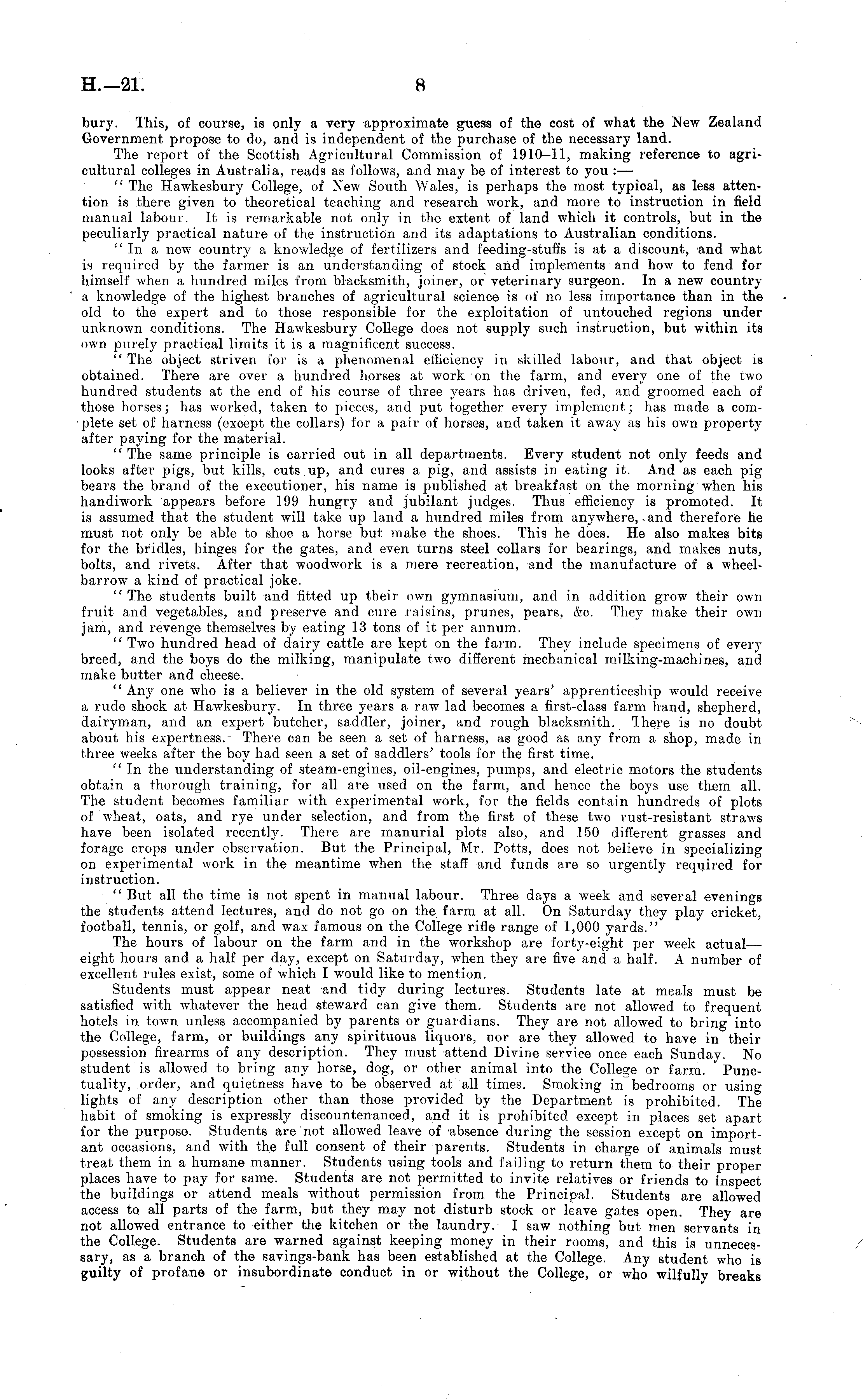 bury. Iliis, of course, is only a very approximate guess of the cost of what the New Zealand Government propose to do, and is independent of the purchase of the necessary land. The report of the Scottish Agricultural Commission of 1910-11, making reference to agricultural colleges in Australia, reads as follows, and may be of interest to you : — " The Hawkesbury College, of New South Wales, is perhaps the most typical, as less attention is there given to theoretical teaching and research work, and more to instruction in field manual labour. It is remarkable not only in the extent of land which it controls, but in the peculiarly practical nature of the instruction and its adaptations to Australian conditions. "In a new country a knowledge of fertilizers and feeding-stuffs is at a discount, and what is required by the farmer is an understanding of stock and implements and how to fend for himself when a hundred miles from blacksmith, joiner, or veterinary surgeon. In a new country a knowledge of the highest branches of agricultural science is of no less importance than in the old to the expert and to those responsible for the exploitation of untouched regions under unknown conditions. The Hawkesbury College does not supply such instruction, but within its own purely practical limits it is a magnificent success. " The object striven for is a phenomenal efficiency in skilled labour, and that object is obtained. There are over a hundred horses at work on the farm, and every one of the two hundred students at the end of his course of three years has driven, fed, and groomed each of those horses; has worked, taken to pieces, and put together every implement; has made a complete set of harness (except the collars) for a pair of horses, and taken it away as his own property after paying for the material. " The same principle is carried out in all departments. Every student not only feeds and looks after pigs, but kills, cuts up, and cures a pig, and assists in eating it. And as each pig bears the brand of the executioner, his name is published at breakfast on the morning when his handiwork appears before 199 hungry and jubilant judges. Thus efficiency is promoted. It is assumed that the student will take up land a hundred miles from anywhere, and therefore he must not only be able to shoe a horse but make the shoes. This he does. He also makes bits for the bridles, hinges for the gates, and even turns steel collars for bearings, and makes nuts, bolts, and rivets. After that woodwork is a mere recreation, and the manufacture of a wheelbarrow a kind of practical joke. " The students built and fitted up their own gymnasium, and in addition grow their own fruit and vegetables, and preserve and cure raisins, prunes, pears, &c. They make their own jam, and revenge themselves by eating 13 tons of it per annum. " Two hundred head of dairy cattle are kept on the farm. They include specimens of every breed, and the boys do the milking, manipulate two different mechanical milking-machines, and make butter and cheese. " Any one who is a believer in the old system of several years' apprenticeship would receive a rude shock at Hawkesbury. In three years a raw lad becomes a first-class farm hand, shepherd, dairyman, and an expert butcher, saddler, joiner, and rough blacksmith. There is no doubt about his expertness. There can be seen a set of harness, as good as any from a shop, made in three weeks after the boy had seen a set of saddlers' tools for the first time. " In the understanding of steam-engines, oil-engines, pumps, and electric motors the students obtain a thorough training, for all are used on the farm, and hence the boys use them all. The student becomes familiar with experimental work, for the fields contain hundreds of plots of wheat, oats, and rye under selection, and from the first of these two rust-resistant straws have been isolated recently. There are manurial plots also, and 150 different grasses and forage crops under observation. But the Principal, Mr. Potts, does not believe in specializing on experimental work in the meantime when the staff and funds are so urgently required for instruction. " But all the time is not spent in manual labour. Three days a week and several evenings the students attend lectures, and do not go on the farm at all. On Saturday they play cricket, football, tennis, or golf, and wax famous on the College rifle range of 1,000 yards." The hours of labour on the farm and in the workshop are forty-eight per week actual — eight hours and a half per day, except on Saturday, when they are five and a half. A number of excellent rules exist, some of which I would like to mention. Students must appear neat and tidy during lectures. Students late at meals must be satisfied with whatever the head steward can give them. Students are not allowed to frequent hotels in town unless accompanied by parents or guardians. They are not allowed to bring into the College, farm, or buildings any spirituous liquors, nor are they allowed to have in their possession firearms of any description. They must attend Divine service once each Sunday. No student is allowed to bring any horse, dog, or other animal into the College or farm. Punctuality, order, and quietness have to be observed at all times. Smoking in bedrooms or using lights of any description other than those provided by the Department is prohibited. The habit of smoking is expressly discountenanced, and it is prohibited except in places set apart for the purpose. Students are not allowed leave of absence during the session except on important occasions, and with the full consent of their parents. Students in charge of animals must treat them in a humane manner. Students using tools and failing to return them to their proper places have to pay for same. Students are not permitted to invite relatives or friends to inspect the buildings or attend meals without permission from the Principal. Students are allowed access to all parts 
