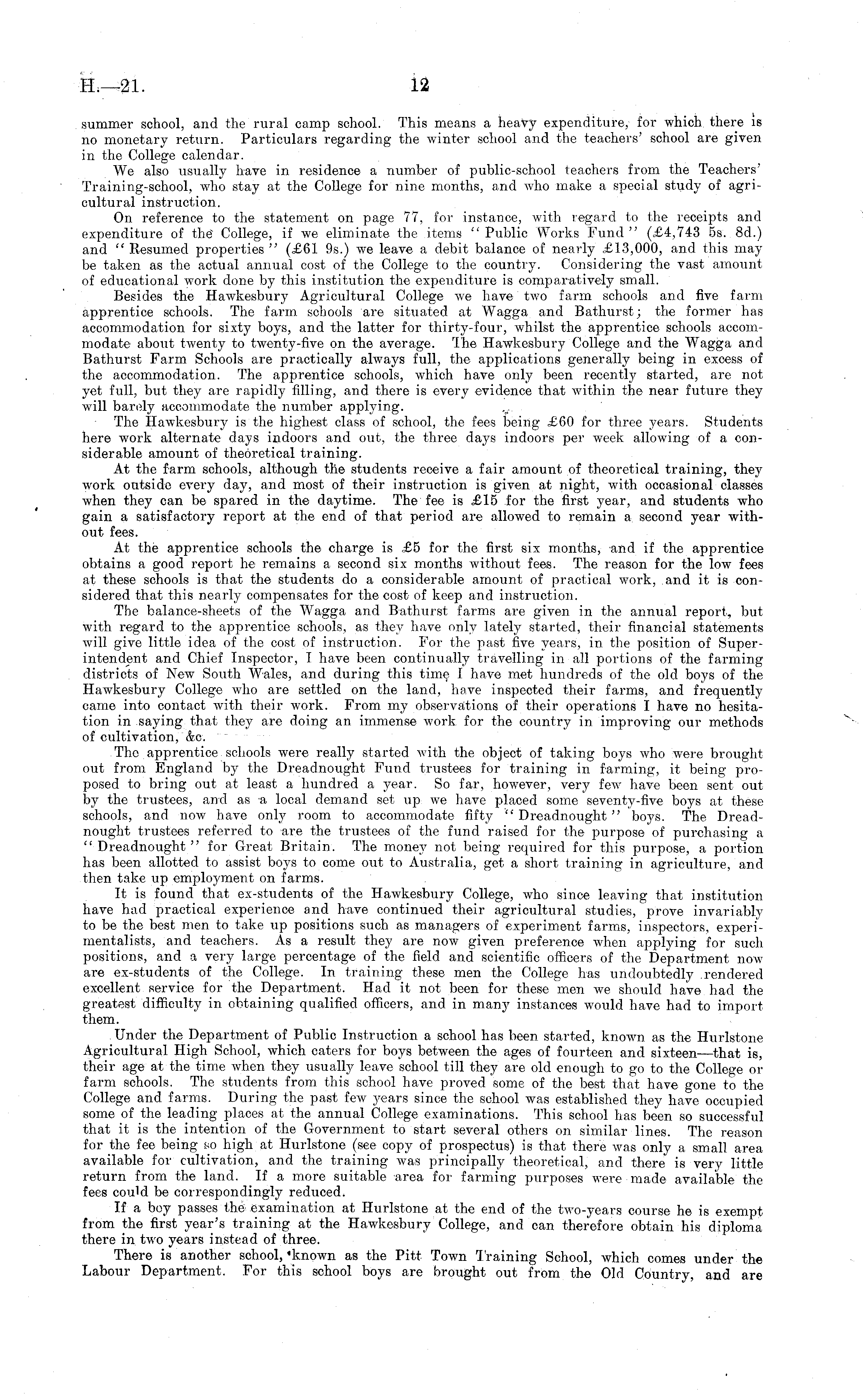 summer school, and the rural camp school. This means a heavy expenditure, for which there is no monetary return. Particulars regarding the winter school and the teachers' school are given in the College calendar. We also usually have in residence a number of public-school teachers from the Teachers' Training-school, who stay at the College for nine months, and who make a special study of agricultural instruction. On reference to the statement on page 77, for instance, with regard to the receipts and expenditure of the" College, if we eliminate the items " Public Works Fund " (£4,743 ss. Bd.) and " Resumed properties " (£6l 95.) we leave a debit balance of nearly £13,000, and this may be taken as the actual annual cost of the College to the country. Considering the vast amount of educational work done by this institution the expenditure is comparatively small. Besides the Hawkesbury Agricultural College we have two farm schools and five farm apprentice schools. The farm schools are situated at Wagga and Bathurst; the former has accommodation for sixty boys, and the latter for thirty-four, whilst the apprentice schools accommodate about twenty to twenty-five on the average. The Hawkesburj' College and the Wagga and Bathurst Farm Schools are practically always full, the applications generally being in excess of the accommodation. The apprentice schools, which have only been recentry started, are not yet full, but they are rapidly rilling, and there is every evidence that within the near future they will barely accommodate the number applying. The Hawkesbury is the highest class of school, the fees being £60 for three years. Students here work alternate days indoors and out, the three days indoors per week allowing of a considerable amount of theoretical training. At the farm schools, although the students receive a fair amount of theoretical training, they work outside every day, and most of their instruction is given at night, with occasional classes when they can be spared in the daytime. The fee is £15 for the first year, and students who gain a satisfactory report at the end of that period are allowed to remain a second year without fees. At the apprentice schools the charge is £5 for the first six months, and if the apprentice obtains a good report he remains a second six months without fees. The reason for the low fees at these schools is that the students do a considerable amount of practical work, and it is considered that this nearly compensates for the cost of keep and instruction. The balance-sheets of the Wagga and Bathurst farms are given in the annual report, but with regard to the apprentice schools, as they have only lately started, their financial statements will give little idea of the cost of instruction. For the past five years, in the position of Superintendent and Chief Inspector, T have been continually travelling in all portions of the farming districts of New South Wales, and during this time I have met hundreds of the old boys of the Hawkesbury College who are settled on the land, have inspected their farms, and frequently came into contact with their work. From my observations of their operations I have no hesitation in saying that they are doing an immense work for the country in improving our methods of cultivation, &c. The apprentice schools were really started with the object of taking boys who were brought out from England by the Dreadnought Fund trustees for training in farming, it being proposed to bring out at least a hundred a year. So far, however, very few have been sent out by the trustees, and as a local demand set up we have placed some seventy-five boys at these schools, and now have only room to accommodate fifty " Dreadnought " boys. The Dreadnought trustees referred to are the trustees of the fund raised for the purpose of purchasing a "Dreadnought" for Great Britain. The money not being required for this purpose, a portion has been allotted to assist boys to come out to Australia, get a short training in agriculture, and then take up employment on farms. It is found that ex-students of the Hawkesbury College, who since leaving that institution have had practical experience and have continued their agricultural studies, prove invariably to be the best men to take up positions such as managers of experiment farms, inspectors, experimentalists, and teachers. As a result they are now given preference when applying for such positions, and a very large percentage of the field and scientific officers of the Department now are ex-students of the College. In training these men the College has undoubtedly rendered excellent service for the Department. Had it not been for these men we should have had the greatest difficulty in obtaining qualified officers, and in many instances would have had to import them. . Under the Department of Public Instruction a school has been started, known as the Hurlstone Agricultural High School, which caters for boys between the ages of fourteen and sixteen —that is, their age at the time when they usually leave school till they are old enough to go to the College or farm schools. The students from this school have proved some of the best that have gone to the College and farms. During the past few r j-ears since the school was established they have occupied some of the leading places at the annual College examinations. This school has been so successful that it is the intention of the Government to start several others on similar lines. The reason for the fee being fco high at Hurlstone (see copy of prospectus) is that there was only a small area available for cultivation, and the training was principally theoretical, and there" is very little return from the land. If a more suitable area for farming purposes were made available the fees could be correspondingly reduced. If a boy passes the examination at Hurlstone at the end of the two-years course he is exempt from the first year's training at the Hawkesbury Colle