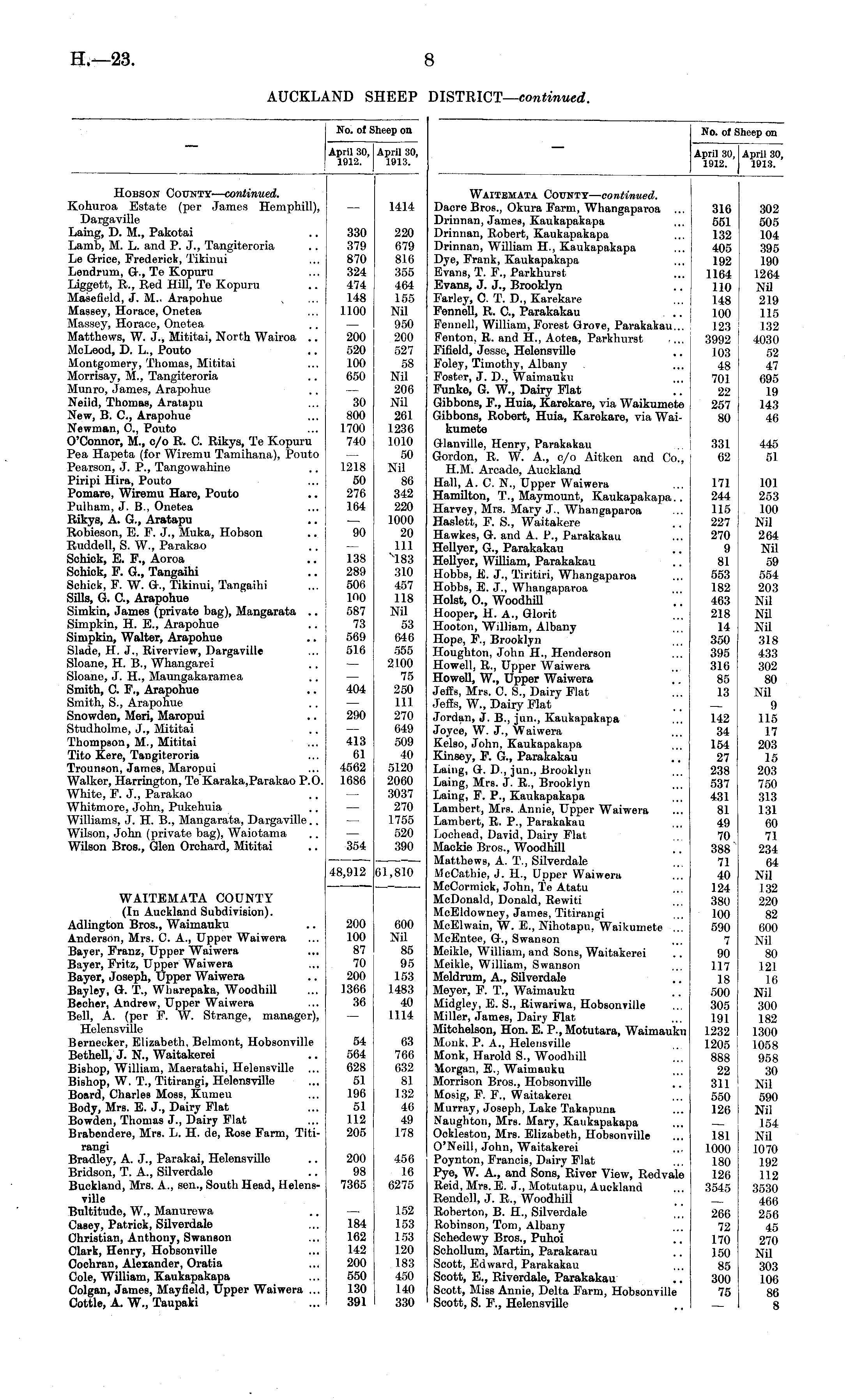 No. of Sheep on April 30, April 30, 1912. 1913. Waitemata County— continued. Dacre Bros., Okura Farm, Whangaparoa ... Drinnan, James, Kaukapakapa Drinnan, Robert, Kaukapakapa Drinnan, William H., Kaukapakapa Dye, Frank, Kaukapakapa Evans, T. F., Parkhurst Evans, J. J., Brooklyn Farley, C. T. D., Karekare Fennell, R. C, Parakakau Fennell, William, Forest Grove, Parakakau... Penton, R. and H., Aotea, Parkhurst Fifield, Jesse, Helensville Foley, Timothy, Albany Foster, J. D., Waimauku Funke, G. W., Dairy Flat Gibbons, F., Huia, Karekare, via Waikumete Gibbons, Robert, Huia, Karekare, via Waikumete Glanville, Henry, Parakakau Gordon, R. W. A., c/o Aitken and Co., H.M. Arcade, Auckland Hall, A. C. N., Upper Waiwera Hamilton, T., Maymount, Kaukapakapa.. Harvey, Mrs. Mary J., Whangaparoa Haslett, F. S., Waitakere Hawkes, G. and A. P., Parakakau Hellyer, G., Parakakau Hellyer, William, Parakakau Hobbs, E. J., Tiritiri, Whangaparoa Hobbs, E. J., Whangaparoa Hoist, 0., Woodhill Hooper, H. A., Glorit Hooton, William, Albany Hope, F., Brooklyn Houghton, John H., Henderson Howell, R., Upper Waiwera Howell, W., Upper Waiwera Jeffs, Mrs. C. S., Dairy Flat Jeffs, W., Dairy Flat Jordan, J. B., jun., Kaukapakapa Joyce, W. J., Waiwera Kelso, John, Kaukapakapa Kinsey, F. G., Parakakau Laing, G. D., jun., Brooklyn Laing, Mrs. J. R., Brooklyn Laing, F. P., Kaukapakapa Lambert, Mrs. Annie, Upper Waiwera Lambert, R. P., Parakakau Lochead, David, Dairy Flat Mackie Bros., Woodhill Matthews, A. T., Silverdale McCathie, J. H., Upper Waiwera McCormick, John, Te Atatu McDonald, Donald, Rewiti McEldowney, James, Titirangi McElwain, W. E., Nihotapu, Waikumete ... McEntee, G., Swanson Meikle, William, and Sons, Waitakerei Meikle, William, Swanson Meldrum, A., Silverdale Meyer, F. T., Waimauku Midgley, E. S., Riwariwa, Hobsonville Miller, James, Dairy Flat Mitchelson, Hon. E. P., Motutara, Waimauku Monk, P. A., Helensville Monk, Harold S., Woodhill Morgan, E. ; Waimauku Morrison Bros., Hobsonville Mosig, F. F., Waitakerei Murray, Joseph, Lake Takapuna Naughton, Mrs. Mary, Kaukapakapa Ockleston, Mrs. Elizabeth, Hobsonville O'Neill, John, Waitakerei Poynton, Francis, Dairy Flat Pye, W. A., and Sons, River View, Redvale Reid, Mrs.E. J., Motutapu, Auckland Rendell, J. R., Woodhill Roberton, B. H., Silverdale Robinson, Tom, Albany Schedewy Bros., Puhoi Scholium, Martin, Parakarau Scott, Edward, Parakakau Scott, E., Riverdale, Parakakau Scott, Miss Annie, Delta Farm, Hobsonville Scott, S. F., Helensville 316 551 132 405 192 1164 110 148 100 123 3992 103 48 701 22 257 80 331 62 171 244 115 227 270 9 81 553 182 463 218 14 350 395 316 85 13 142 34 154 27 238 537 431 81 49 70 388* 71 40 124 380 100 590 7 90 117 18 500 305 191 1232 1205 888 22 I 311 550 126 302 505 104 395 190 1264 Nil 219 115 132 4030 52 47 695 19 143 46 445 51 101 253 100 Nil 264 Nil 59 554 203 Nil Nil Nil 318 433 302 80 Nil 9 115 17 203 15 203 750 313 131 60 71 234 64 Nil 132 220 82 600 Nil 80 121 16 Nil 300 182 1300 1058 958 30 Nil 590 Nil 154 Nil 1070 192 112 3530 466 256 45 270 Nil 303 106 86 8 181 1000 180 126 3545 266 72 170 150 85 300 75