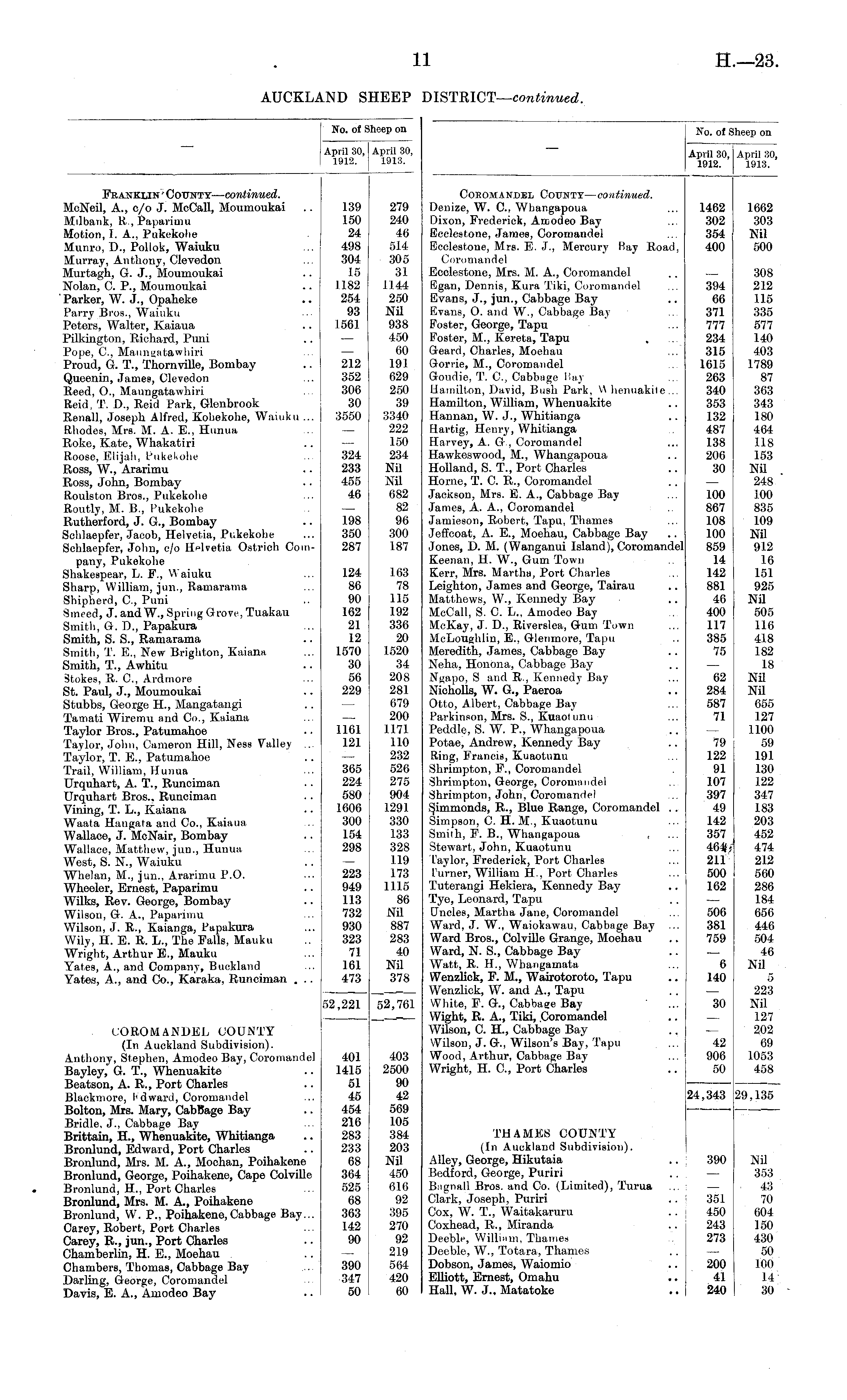 No. of Sheep on April 30, April 30, 1912. 1913. COEOMANDEL County— continued. Denize, W. C, Whangapoua Dixon, Frederick, Amodeo Bay Ecclestone, James, Coromandel Ecclestone, Mrs. E. J., Mercury Bay Road, Coromandel Ecclestone, Mrs. M. A., Coromandel Egan, Dennis, Kura Tiki, Coromandel Evans, J., jun., Cabbage Bay Evans, 0. and W., Cabbage Bay Poster, George, Tapu Poster, M., Kereta, Tapu Geard, Charles, Moehau Gorrie, M., Coromandel Goudie, T. C, Cabbage Hay Hamilton, David, Bush Park, V\ henuakite... Hamilton, William, Whenuakite Hannan, W. J., Whitianga Hartig, Henry, Whitianga Harvey, A. G , Coromandel Hawkeswood, M., Whangapoua HoUand, S. T., Port Charles Home, T. C. R., Coromandel Jackson, Mrs. E. A., Cabbage Bay James, A. A., Coromandel Jamieson, Robert, Tapu, Thames Jeffcoat, A. E., Moehau, Cabbage Bay Jones, D. M. (Wanganui Island), Coromandel Keenan, H. W., Gum Town Kerr, Mrs. Martha, Port Charles Leighton, James and George, Tairau Matthews, W., Kennedy Bay McCall, S. C. L., Amodeo Bay McKay, J. D., Riverslea, Gum Town McLoughlin, E., Glenmore, Tapu Meredith, James, Cabbage Bay Neha, Honona, Cabbage Bay Ngapo, S and R., Kennedy Bay Nicholls, W. G., Paeroa Otto, Albert, Cabbage Bay Parkinson, Mrs. S., Kuaotunu Peddle, S. W. P., Whangapoua Potae, Andrew, Kennedy Bay Ring, Francie, Kuaotunu Shrimpton, F., Coromandel Shrimpton, George, Coromandel Shrimpton, John, Coromandel S,immonds, R., Blue Range, Coromandel .. Simpson, C. H. M., Kuaotunu Smith, F. B., Whangapoua Stewart, John, Kuaotunu Taylor, Frederick, Port Charles Turner, William H , Port Charles Tuterangi Hekiera, Kennedy Bay Tye, Leonard, Tapu Uncles, Martha Jane, Coromandel Ward, J. W., Waiokawau, Cabbage Bay Ward Bros., Colville Grange, Moehau Ward, N. S., Cabbage Bay Watt, R. H., Whangamata Wenzliek, F. M., Wairotoroto, Tapu Wenzliek, W. and A., Tapu White, F. G., Cabbaee Bay Wight, R. A., Tiki, Coromandel Wilson, C. H., Cabbage Bay Wilson, J. G., Wilson's Bay, Tapu Wood, Arthur, Cabbage Bay Wright, H. C, Port Charles 1462 302 354 400 394 66 371 777 234 315 1615 263 340 353 132 487 138 206 30 100 867 108 100 859 14 142 881 46 400 117 385 75 1662 303 Nil 500 308 212 115 335 577 140 403 1789 87 363 343 180 464 118 153 Nil 248 100 835 109 Nil 912 16 151 925 Nil 505 116 418 182 18 Nil Nil 655 127 1100 59 191 130 122 347 183 203 452 474 212 560 286 184 656 446 504 46 Nil 5 223 Nil 127 202 69 1053 458 62 284 587 71 79 122 91 107 397 49 142 357 46*; 211 500 162 506 381 759 6 140 30 42 906 50 24,343 29,135 THAMES COUNTY (In Auckland Subdivision). Alley, George, Hikutaia Bedford, George, Puriri Bagnall Bros, and Co. (Limited), Turua Clark, Joseph, Puriri Cox, W. T., Waitakaruru Coxhead, R., Miranda Deeble, William, Thames Deeble, W., Totara, Thames Dobson, James, Waiomio Elliott, Ernest, Omahu Hall, W. J.. Matatoke 390 351 450 243 273 Nil 353 43 70 604 150 430 50 100 14 30 200 41 240