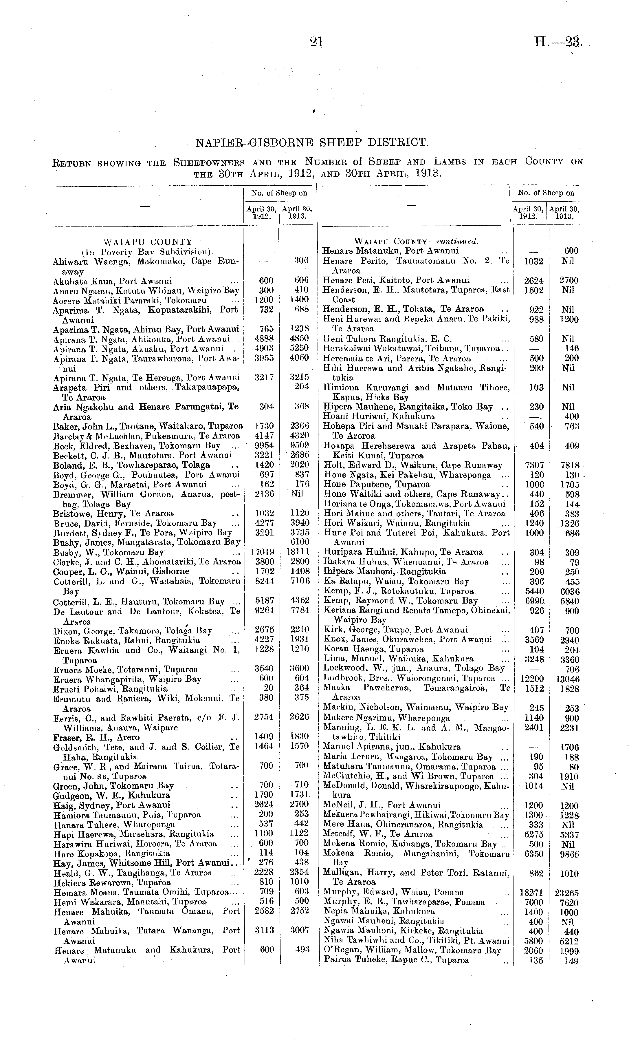 NAPIER-GISBORNE SHEEP DISTRICT. Return showing the Sheepowners and the Number of Sheep and Lambs in each County on the 30th April, 1912, and 30th April, 1913.