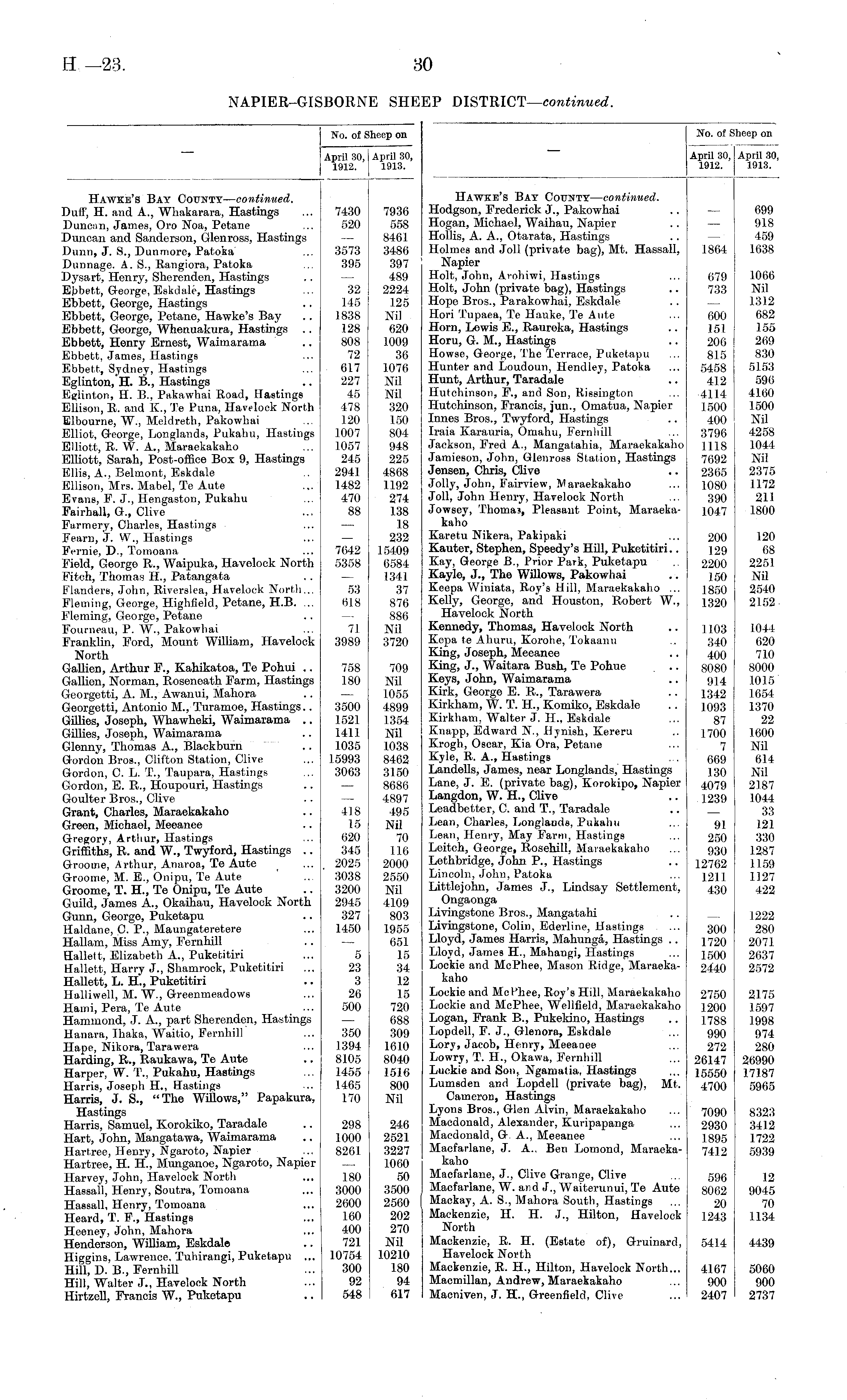 No. of i iheep on April 30, 1912. April 30, 1913. Hawke's Bay County— continued. Hodgson, Frederick J., Pakowhai Hogan, Michael, Waihau, Napier Hollis, A. A., Otarata, Hastings Holmes and Joll (private bag), Mt. Hassall, Napier Holt, John, Arohiwi, Hastings Holt, John (private bag), Hastings Hope Bros., Parakowhai, Eskdale Hori Tupaea, Te Hauke, Te Aute Horn, Lewis E., Raureka, Hastings Horu, G. M., Hastings Howse, George, The Terrace, Puketapu Hunter and Loudoun, Hendley, Patoka Hunt, Arthur, Taradale Hutchinson, F., and Son, Rissington Hutchinson, Francis, jun., Omatua, Napier Innes Bros., Twyford, Hastings Iraia Karauria, Omahu, Fernhill Jackson, Fred A., Mangafahia, Maraekakaho Jamieson, John, Glenross Station, Hastings Jensen, Chris, Clive Jolly, John, Fairview, Maraekakaho Joll, John Henry, Havelock North Jowsey, Thoma3, Pleasant Point, Maraekakaho Karetu Nikera, Pakipaki Kauter, Stephen, Speedy's Hill, Puketitiri.. Kay, George B., Prior Park, Puketapu Kayle, J., The Willows, Pakowhai Keepa Winiata, Roy's Hill, Maraekakaho ... Kelly, George, and Houston, Robert W., Havelock North Kennedy, Thomas, Havelock North Kepa te A hum, Korohe, Tokaanu King, Joseph, Meeanee King, J., Waitara Bush, Te Pohue Keys, John, Waimarama Kirk, George E. R., Tarawera Kirkham, W. T. H., Komiko, Eskdale Kirkham, Walter J. H., Eskdale Knapp, Edward N., llynish, Kereru Krogh, Oscar, Kia Ora, Petane Kyle, R. A., Hastings Landells, James, near Longlands, Hastings Lane, J. E. (private bag), Korokipo, Napier Langdon, W. H., Clive Leadbetter, C. and T., Taradale Lean, Charles, Longlands, Pukahu Lean, Henry, May Farm, Hastings Leitch, George, Rosehill, Maraekakaho Lethbridge, John P., Hastings Lincoln, John, Patoka Littlejohn, James J., Lindsay Settlement, Ongaonga Livingstone Bros., Mangatahi Livingstone, Colin, Ederline, Hastings Lloyd, James Harris, Mahunga, Hastings .. Lloyd, James H., Mahangi, Hastings Lockie and McPhee, Mason Ridge, Maraekakaho Lockie and McPhee, Roy's Hill, Maraekakaho Lockie and McPhee, Wellfield, Maraekakaho Logan, Frank B., Pukekino, Hastings Lopdell, F. J., Glenora, Eskdale Lory, Jacob, Henry, Meeanee Lowry, T. H., Okawa, Fernhill Luckie and Son, Ngamatia, Hastings Lumsden and Lopdell (private bag), Mt. Cameron, Hastings Lyons Bros., Glen Alvin, Maraekakaho Macdonald, Alexander, Kuripapanga Macdonald, G. A., Meeanee Macfarlane, J. A., Ben Lomond, Maraekakaho Macfarlane, J., Clive Grange, Clive Macfarlane, W. and J., Waiterunui, Te Aute Mackay, A. S., Mahora South, Hastings Mackenzie, H. H. J., Hilton, Havelock North Mackenzie, R. H. (Estate of), Gruinard, Havelock North Mackenzie, R. H., Hilton, Havelock North... Macmillan, Andrew, Maraekakaho Macniven, J. H., Greenfield, Clive 1864 679 733 600 151 206 815 5458 412 4114 1500 400 3796 1118 7692 2365 1080 390 1047 200 129 2200 150 1850 1320 1103 340 400 8080 914 1342 1093 87 1700 7 669 130 4079 1239 699 918 459 1638 1066 Nil 1312 682 155 269 830 j 5153 596 4160 1500 Nil 4258 1044 Nil 2375 1172 211 1800 120 68 2251 Nil 2540 2152 1044 620 710 8000 1015 1654 1370 22 1600 Nil 614 Nil 2187 1044 33 121 330 1287 1159 1127 422 91 250 930 12762 1211 430 300 1720 1500 2440 1222 280 2071 2637 2572 2750 1200 1788 990 272 26147 15550 4700 2175 1597 1998 974 280 26990 17187 5965 7090 2930 1895 7412 8323 3412 1722 5939 596 8062 20 1243 12 9045 70 1134 5414 4439 4167 900 2407 5060 900 2737