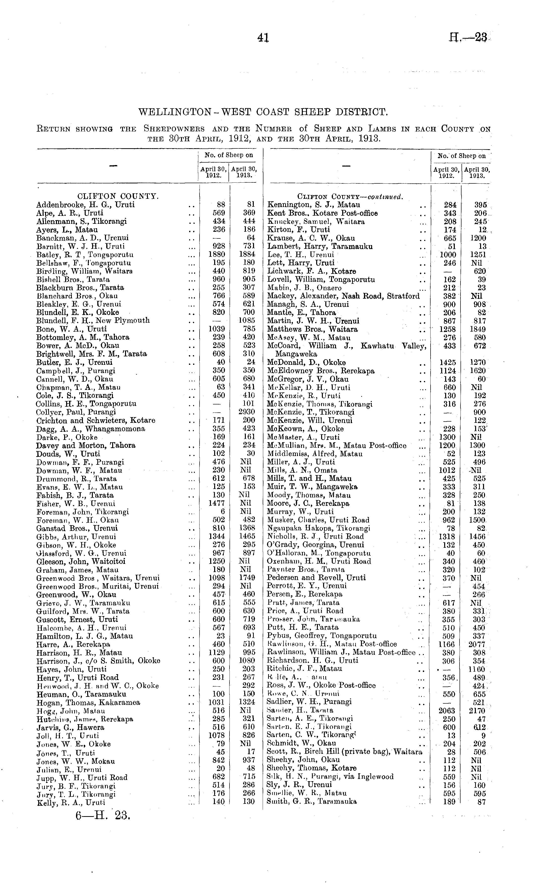 WELLINGTON-WEST COAST SHEEP DISTRICT. Return showing the Sheepowners and the Number of Sheep and Lambs in each County on the 30th April, 1912, and the 30th April, 1913.