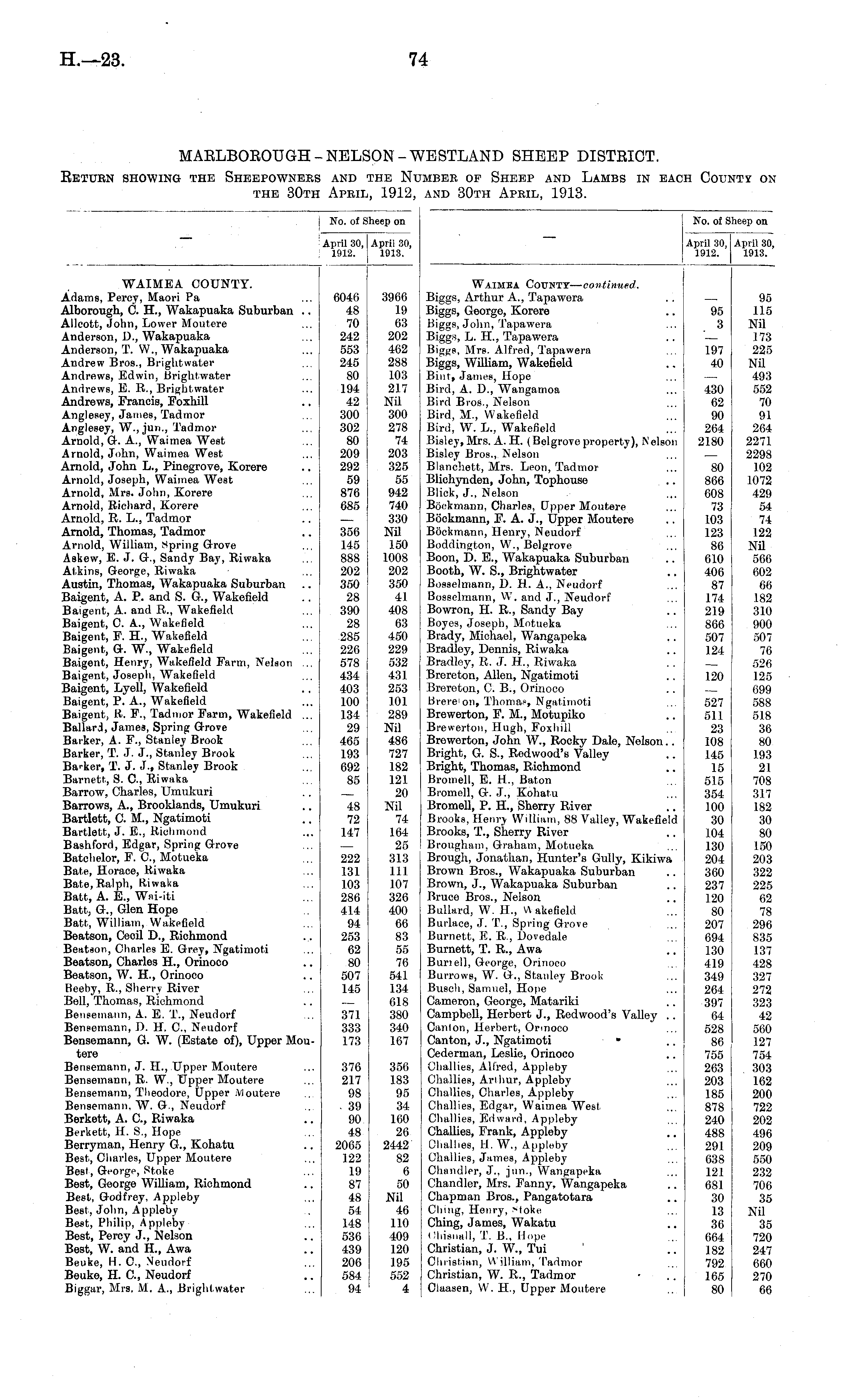 MARLBOROUGH-NELSON-WESTLAND SHEEP DISTRICT. Return showing the Sheepowners and the Number of Sheep and Lambs in each County on the 30th April, 1912, and 30th April, 1913.