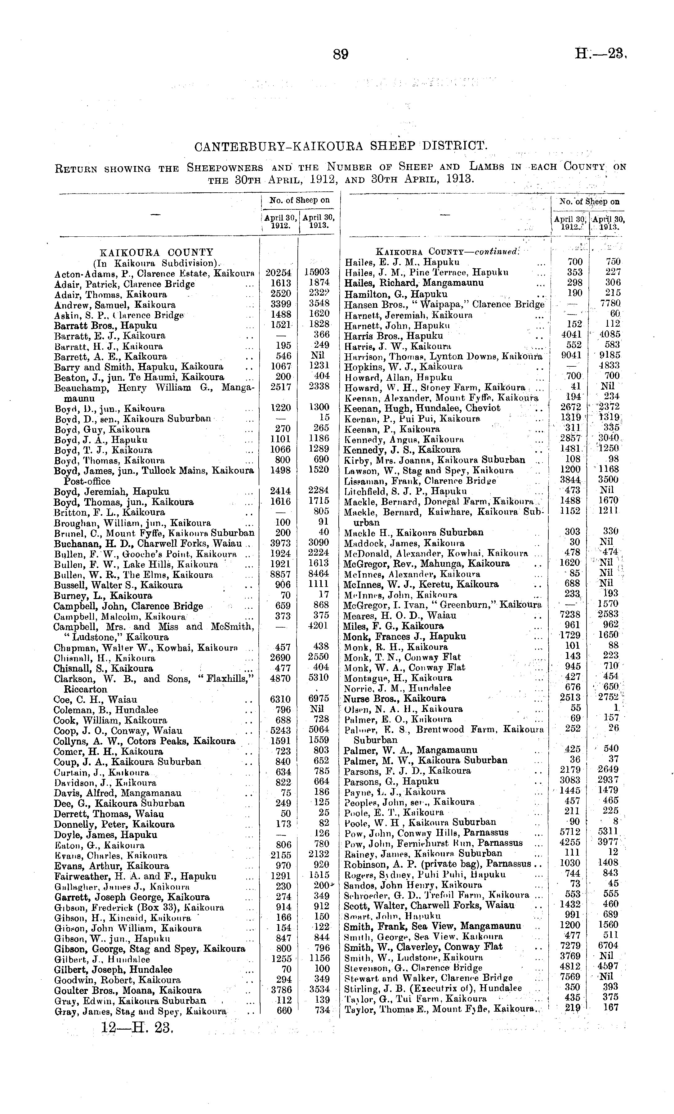 CANTERBURY-KAIKOURA SHEEP DISTRICT. Return showing the Sheepowners and the Number of Sheep and Lambs in each County on the 30th April, 1912, and 30th April, 1913.