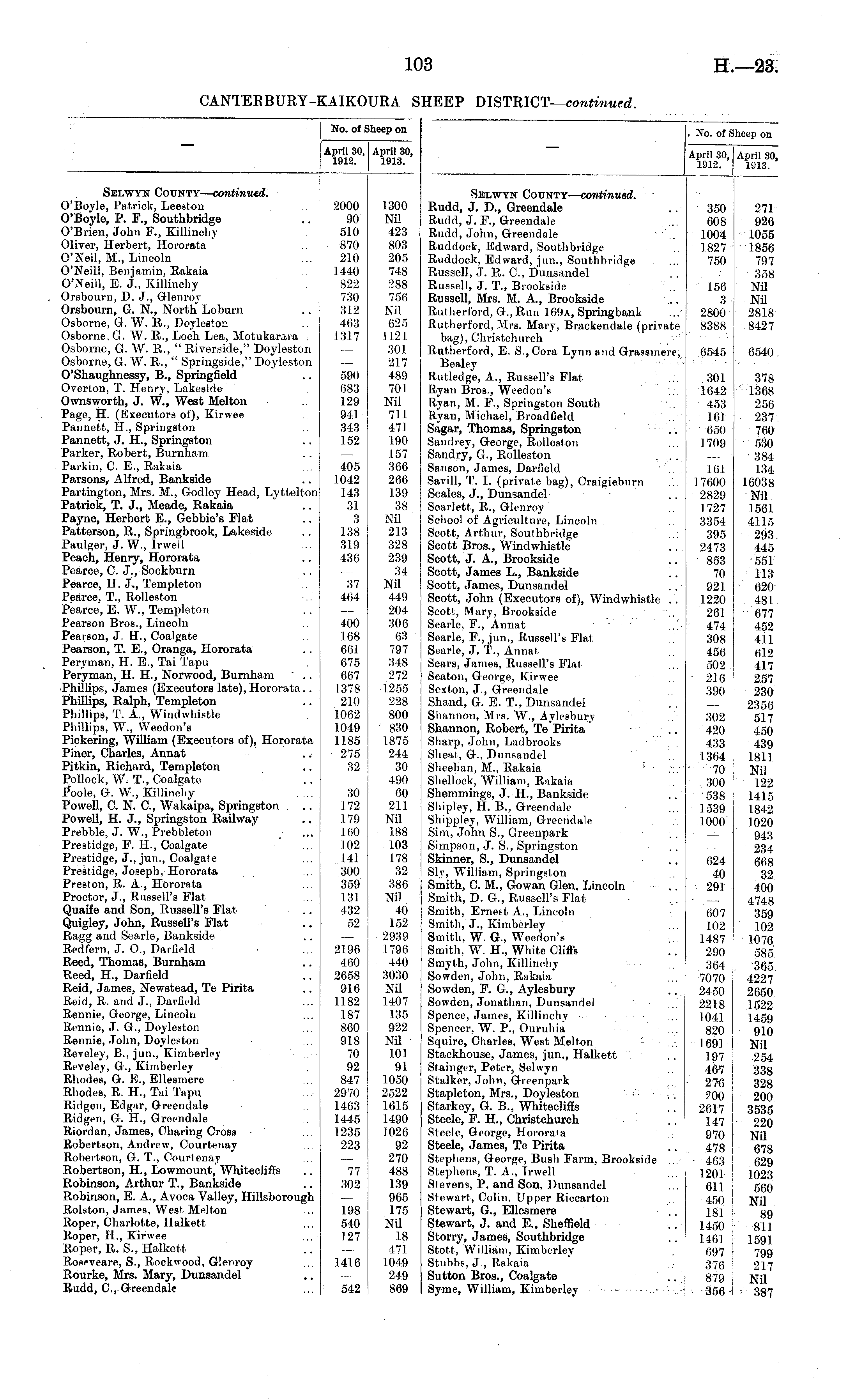 , No. of Sheep on April 30, April 30, 1912. 1913. Selwyn County— continued. Rudd, J. D., Greendale Rudd, J. F., Greendale Rudd, John, Greendale Ruddock, Edward, Southbridge Ruddock, Edward, jun., Southbridge Russell, J. R. C., Dunsandel Russell, J. T., Brookside Russell, Mrs. M. A., Brookside Rutherford, G., Run 169a, Springbank Rutherford, Mrs. Mary, Brackendale (private bag), Christchurch Rutherford, E. S.,Cora Lynn and Grassmere, Bealey Rutledge, A., RusseU's Flat Ryan Bros., Weedon's ... Ryan, M. F., Springston South Ryan, Michael, Broadfield Sagar, Thomas, Springston Sandrey, George, Rolleston Sandry, G., Rolleston .. Sanson, James, Darfield Savill, T. I. (private bag), Oraigieburn Scales, J., Dunsandel Scarlett, R., Glenroy School of Agriculture, Lincoln Scott, Arthur, Southbridge Scott Bros., Windwhistle Scott, J. A., Brookside Scott, James L., Bankside Scott, James, Dunsandel Scott, John (Executors of), Windwhistle . . Scott, Mary, Brookside Searle, F., Annat .! Searle, F., jun., Russell's Flat Searle, J. T., Annat Sears, James, RusseU's Flat Seaton, George, Kirwee Sexton, J., Greendale Shand, G. E. T., Dunsandel Shannon, Mrs. W., Aylesbury Shannon, Robert, Te Pirita Sharp, John, Ladbrooks Sheat, G., Dunsandel Sheehan, M., Rakaia ' Shellock, William, Rakaia Shemmings, J. H., Bankside Shipley, H. B., Greendale Shippley, William, Greendale Sim, John S., Greenpark Simpson, J. S., Springston Skinner, S., Dunsandel Sly, William, Springston Smith, C. M., Gowan Glen. Lincoln Smith, D. G., Russell's FlatSmith, Ernest A., Lincoln Smith, J., Kimberley Smith, W. G., Weedon's Smith, W. H., White Cliffs Smyth, John, Killinchy Sowden, John, Rakaia Sowden, F. G., Aylesbury Sowden, Jonathan, Dunsandel Spence, James, Killinchy .., Spencer, W. P., Ouruhia Squire, Charles, West Melton : Stackhouse, James, jun., Halkett Stainger, Peter, Selwyn Stalker, John, Greenpark Stapleton, Mrs., Doyleston Starkey, G. B., Whitecliffs Steele, F. H., Christchurch Steele, George, Hororata Steele, James, Te Pirita Stephens, George, Bush Farm, Brookside ... Stephens, T. A., Irwell Stevens, P. and Son, Dunsandel Stewart, Colin. Upper Riccarton Stewart, G, EUesmere Stewart, J. and E., Sheffield Storry, James, Southbridge Stott, William, Kimberley Stubbs, J, R,akaia Sutton Bros., Coalgate .. Syme, William, Kimberley - -- 350 608 1004 1827 750 156 3 2800 8388 6545 301 1642 453 161 650 1709 161 17600 2829 1727 3354 395 2473 853 70 921 1220 261 474 308 456 502 216 390 302 420 433 1364 70 300 538 1539 1000 271 926 1055 1856 797 358 NU NU 2818 8427 6540 378 1368 256 237 760 530 384 134 16038 Nil. 1561 4115 293 445 551 113 620 481 677 452 411 612 417 2.57 230 2356 517 450 439 1811 Nil 122 1415 1842 1020 943 234 668 32 400 4748 359 102 1076 585 365 4227 2650 1522 1459 910 Nil 254 338 328 200 3535 220 Nil 678 629 1023 560 Nil 89 811 1591 799 217 Nil 387 624 40 291 607 102 1487 290 364 7070 2450 2218 1041 820 1691 I 197 467 ] 276 ! ?00 2617 147 970 478 463 I 1201 611 450 181 1450 1461 ; 697 S 376 : 879 356 -I