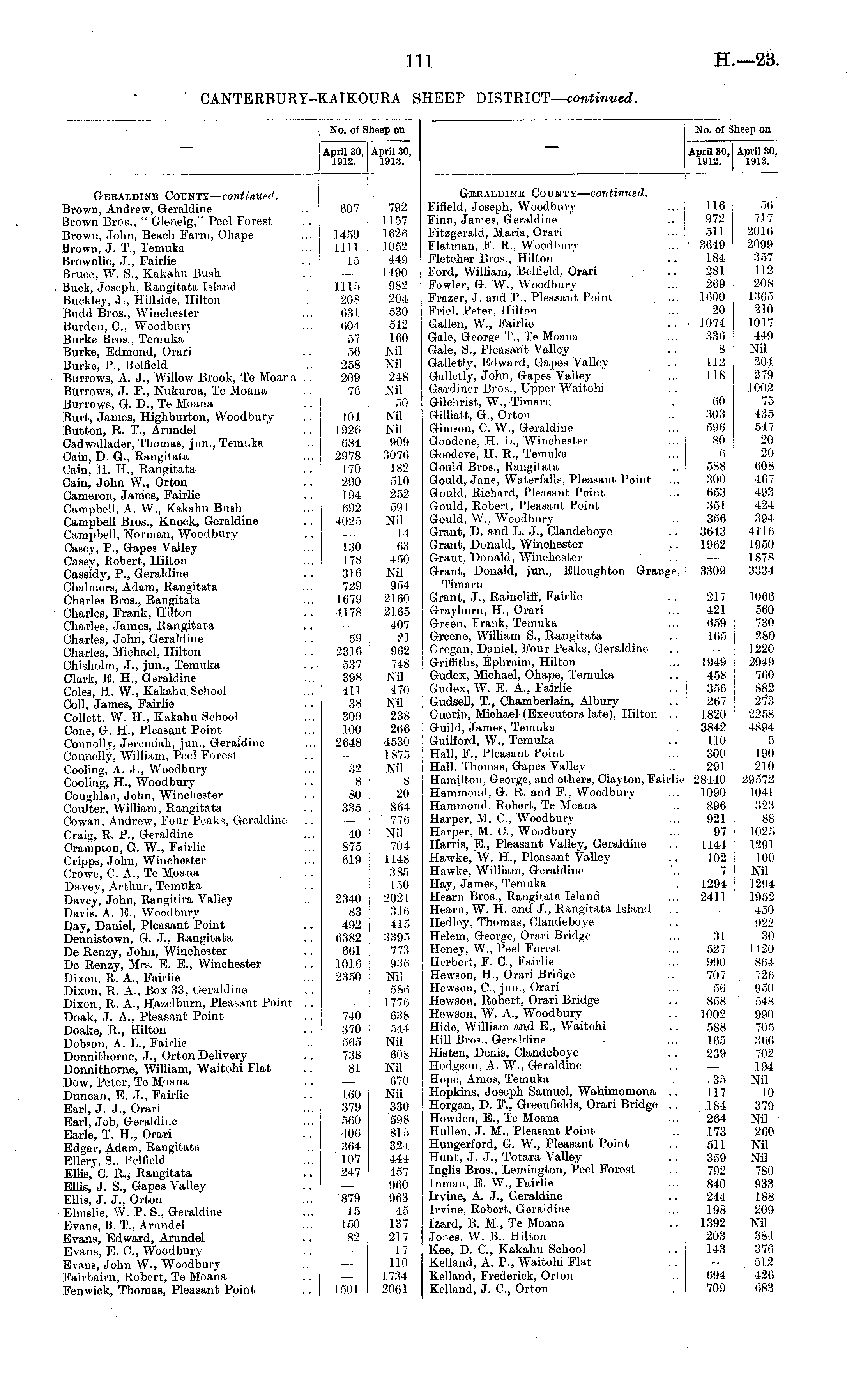No. of Sheep on April 30, April 30, 1912. 1913. Geraldine County— continued. Brown, Andrew, Geraldine Brown Bros., " Glenelg," Peel Forest Brown, John, Beach Farm, Ohape Brown, J. T., Temuka Brownlie, J., Fairlie Bruce, W. S., Kakahu Bush Buck, Joseph, Rangitata Island Buckley, J,, Hillside, Hilton Budd Bros., Winchester Burden, C, Woodbury Burke Bros., Temuka Burke, Edmond, Orari Burke, P., Belfield Burrows, A. J., Willow Brook, Te Moana .. Burrows, J. F., Nukuroa, Te Moana Burrows, G. D., Te Moana Burt, James, Highburton, Woodbury Button, R. T., Arundel Cadwallader, Thomas, jun., Temuka Cain, D. G., Rangitata Cain, H. H., Rangitata Cain, John W., Orton Cameron, James, Fairlie Campbell. A. W., Kakahu Bush CampbeU Bros., Knock, Geraldine Campbell, Norman, WoodburyCasey, P., Gapes Valley Casey, Robert, Hilton Cassidy, P., Geraldine Chalmers, Adam, Rangitata Charles Bros., Rangitata Charles, Frank, Hilton Charles, James, Rangitata Charles, John, Geraldine Charles, Michael, Hilton Chisholm, J., jun., Temuka Clark, E. H., Geraldine Coles, H. W., Kakabu.School Coll, James, Fairlie Collett, W. H., Kakahu School Cone, G. II., Pleasant Point Connolly, Jeremiah, jun., Geraldine Connelly, William, Peel Forest Cooling, A. J., Woodbury Cooling, H., Woodbury Coughlan, John, Winchester . . Coulter, WUliam, Rangitata Cowan, Andrew, Four Peaks, Geraldine Craig, R. P., Geraldine Crampton, G. W., Fairlie Cripps, John, Winchester Crowe, C. A., Te Moana Davey, Arthur, Temuka Davey, John, Rangitira Valley Davis. A. E., Woodbury Day, Daniel, Pleasant Point Dennistown, G. J., Rangitata De Renzy, John, Winchester De Renzy, Mrs. E. E., Winchester Dixon, R. A., Fairlie Dixon, R. A., Box 33, Geraldine Dixon, R. A., Hazelburn, Pleasant Point . . Doak, J. A., Pleasant Point Doake, R., Hilton Dobson, A. L., Fairlie Donnithorne, J., Orton Delivery Donnithorne, WiUiam, Waitohi Flat Dow, Peter, Te Moana Duncan, E. J., Fairlie Earl, J. J., Orari Earl, Job, Geraldine Earle, T. H., Orari Edgar, Adam, Rangitata Ellery, S., Pelfield EUis, C. R., Rangitata EUis, J. S., Gapes ValleyEllis, J. J., Orton Elmslie, W. P. S., Geraldine Evans, B. T., Arundel Evans, Edward, Arundel Evans, E. C, Woodbury Evans, John W., Woodbury Fairbairn, Robert, Te Moana Fenwick, Thomas, Pleasant Point 607 1459 111.1 15 1115 208 631 604 57 56 258 209 76 104 1926 684 2978 170 290 194 692 4025 130 178 316 729 1679 4178 59 2316 537 398 411 38 309 100 2648 32 8 80 335 40 875 619 2340 83 492 6382 661 1016 2350 740 370 565 738 81 160 379 560 406 364 107 247 879 15 150 82 1501 792 1157 1626 1052 449 1490 982 204 530 542 160 Nil Nil 248 Nil 50 Nil Nil 909 3076 182 510 252 591 Nil 14 63 450 Nil 954 2160 2165 407 21 962 748 Nil 470 Nil 238 266 4530 1875 Nil 8 20 864 776 Nil 704 1148 385 150 2021 316 415 3395 773 936 Nil 586 1776 638 544 Nil 608 Nil 670 Nil 330 598 815 324 444 457 960 963 45 137 217 17 110 1.734 2061