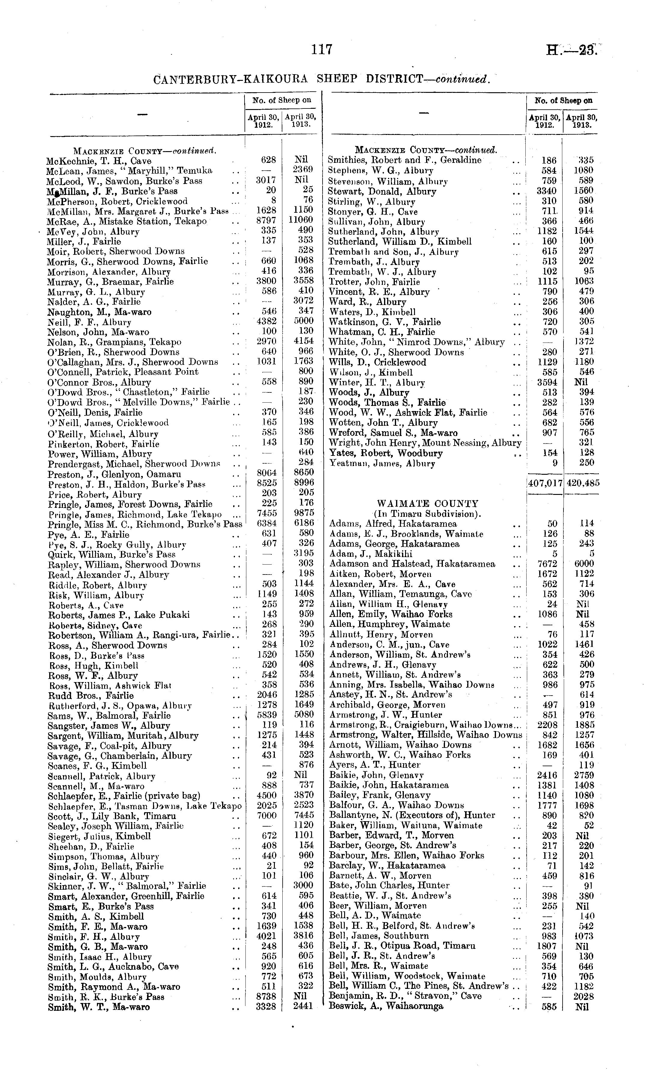 No. of Sheep on April 30, April 30, 1912. 1913. Mackenzie County— continued. Smithies, Robert and F., Geraldine .. | 186 Stephens, W. G., Albury ... 584 Stevenson, William, Albury ... ! 759 Stewart, Donald, Albury ' .. 3340 Stirling, W., Albury ... I 310 Stonyer, G. H., Cave ... ! 711. Sullivan, John, Albury 366 Sutherland, John, Albury ... 1182 Sutherland, William D.,' Kimbell .. 160 Trembath and Son, J., Albury 615 Trembath, J.. Albury 513 Trembath, W. J., Albury 102 Trotter, John, Fairlie ... 1115 Vincent, R. E., Albury ' 790 Ward, R., Albury .. 256 Waters, D., Kimbell ... 306 Watkinson, G. V., Fairlie .. 720 Whatman, C. H., Fairlie .. - 570 White, John, " Nimrod Downs," Albury .. j — White, 0. J., Sherwood Downs .. 280 Wills, D., Cricklewood .. 1129 Wilson, ,J..Kimbell ... 585 Winter, H. T., Albury ... ! 3594 Woods, J., Albury ' .. I 513 Woods, Thomas S., Fairlie .. ! 282 j Wood, W. W., Ashwick Flat, Fairlie .. 564 Wotten, John T., Albury .. 682 Wreford, Samuel S., Ma-waro .. 907 Wright, John Henry, Mount Nessing, Albury Yates, Robert, Woodbury ,. 154 Yeatman, James, Albury 9 335 1080 589 1560 580 914 466 1544 100 297 202 95 1063 479 306 400 305 541 1372 27.1 1180 546 Nil 394 139 576 556 765 321 128 250 407,017 WAIMATE COUNTY (In Timaru Subdivision). Adams, Alfred, Hakataramea .. 50 Adams, E. J., Brooklands, Waimate ... ! 126 Adams, George, Hakataramea .. j 125 Adam, J., Makikihi ... 5 Adamson and Halstead, Hakataramea .. 7672 Aitken, Robert, Morven ... ! 1672 Alexander, Mrs. E. A., Cave ... \ 562 Allan, William, Temaunga, Cave .. 153 Allan, William H., Glenavy ... 24 Allen, Emily, Waihao Forks .. 1086 Allen, Humphrey, Waimate .. — Allnutt, Henry, Morven ... 76 Anderson, C. M., jun., Cave ... 1022 Anderson, William, St. Andrew's ... 354 Andrews, J. H., Glenavy ... , 622 Annett, William, St. Andrew's ... ! 363 Anning, Mrs. Isabella, Waihao Downs 986 Anstey, H. N., St. Andrew's .. | — Archibald, George, Morven .. j 497 Armstrong, J. W., Hunter ... 851 Armstrong, R., Craigieburn, Waihao Downs... 2208 Armstrong, Walter, Hillside, Waihao Downs , 842 Arnott, YVUliam, Waihao Downs .. ! 1682 Ashworth, W. C, Waihao Forks .. 169 Ayers, A. T., Hunter .. — Baikie, John, Glenavy ... 2416 Baikie, John, Hakataramea .. 1381 Bailey, Frank, Glenavy .. i 1140 Balfour, G. A., Waihao Downs .. ! 1777 Ballantyne, N. (Executors of), Hunter .. 890 Baker, William, Waituna, Waimate 42 Barber, Edward, T., Morven .. 203 Barber, George, St. Andrew's . . 217 Barbour, Mrs. Ellen, Waihao Forks .. 112 Barclay, W., Hakataramea .. 71 Barnett, A. W., Morven ... 459 Bate, John Charles, Hunter .. — Beattie, W. J., St. Andrew's ... j 398 Beer, William, Morven ..'. i 255 Bell, A. D., Waimate Bell, H. R., Belford, St. Andrew's ... 231 Bell, James, Southburn ... 983 Bell, J. R., Otipua Road, Timaru ... 1807 Bell, J. R., St. Andrew's ... 569 Bell, Mrs. R., Waimate ... 354 Bell, William, Woodstock, Waimate ... 710 BeU, WUliam G, The Pines, St. Andrew's .. 422 Benjamin, R. D., " Stravon," Cave .. — Beswick, A., Waihaorunga .. I 585 420,485 114 88 243 6000 1122 714 306 Nil Nil 458 117 1461 426 500 279 975 614 919 976 1885 1257 1656 401 119 2759 1408 1080 1698 820 52 Nil 220 201 142 816 91 380 Nil 140 542 1073 Nil 130 646 705 1182 2028 Nil