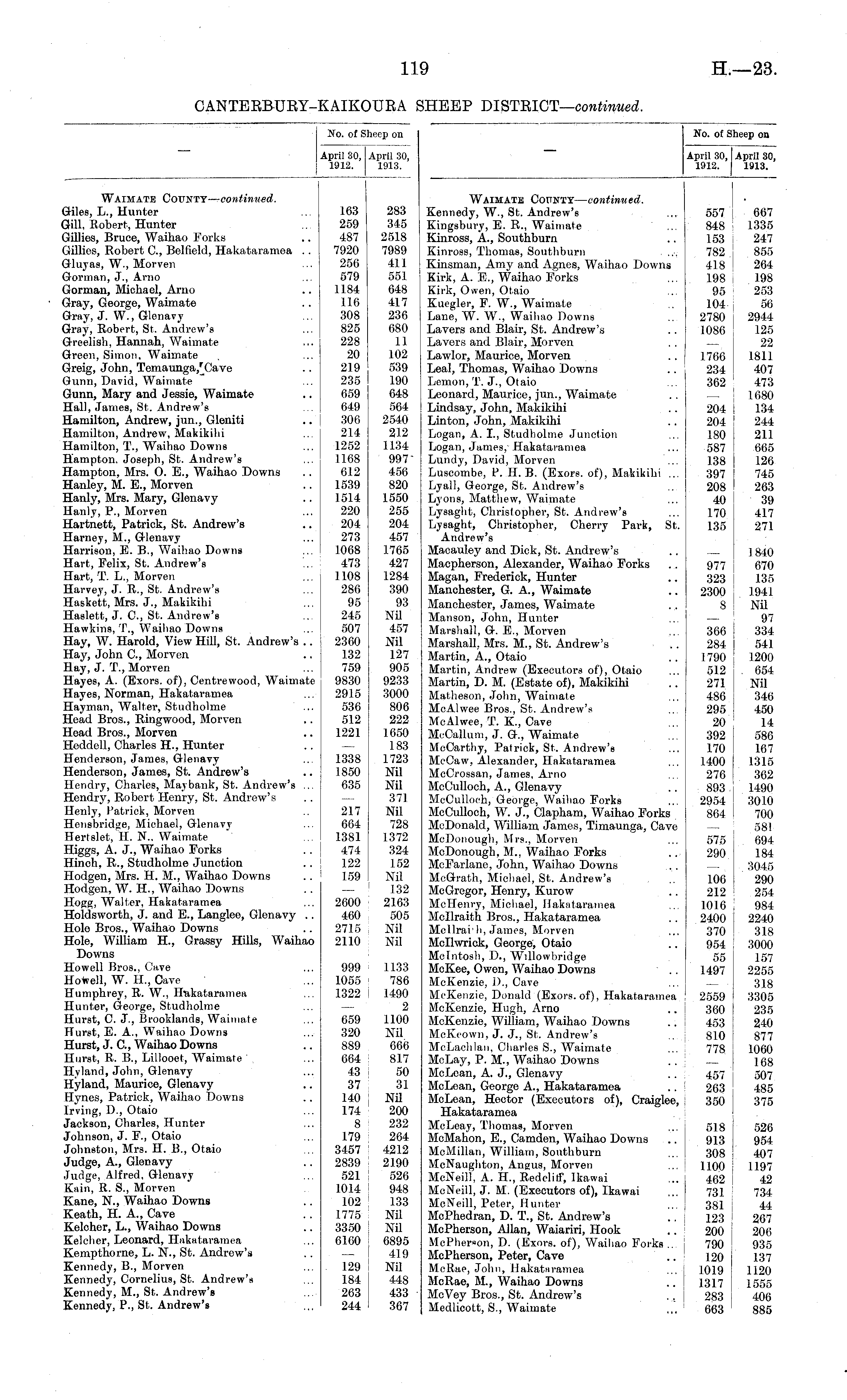 No. of Sheep on April 30, April 30, 1912. 1913. Waimate County— continued. Kennedy, W., St. Andrew's ... 557 Kingsbury, E. R., Waimate ... 848 Kinross, A., Southburn .. 153 Kinross, Thomas, Southburn ... 782 Kinsman, Amy and Agnes, Waihao Downs 418 Kirk, A. E., Waihao Forks ... 198 Kirk, Owen, Otaio ... 95 Kuegler, F. W., Waimate .. ' 104 Lane, W. W., Waihao Downs .. 2780 Lavers and Blair, St. Andrew's .. 1086 Lavers and Blair, Morven . . — Lawlor, Maurice, Morven .. 1766 Leal, Thomas, Waihao Downs .. 234 Lemon, T. J., Otaio ... 362 Leonard, Maurice, jun., Waimate . . — Lindsay, John, Makikihi .. 204 Linton, John, Makikihi .. 204 Logan, A. I., Studholme Junction ... 180 Logan, James, Hakataramea ... 587 Lundy, David, Morven ... 138 Luscombe, P. H.B. (Exors. of), Makikihi ... 397 Lyall, George, St. Andrew's ... 208 Lyons, Matthew, Waimate ... 40 Lysaght, Christopher, St. Andrew's ... 170 Lysaght, Christopher, Cherry Park, St. 135 Andrew's Macauley and Dick, St. Andrew's .. Macpherson, Alexander, Waihao Forks .. 977 Magan, Frederick, Hunter .. 323 Manchester, G. A., Waimate .. 2300 Manchester, James, Waimate ., 8 Manson, John, Hunter ... — Marshall, G. E., Morven ... 366 Marshall, Mrs. M., St. Andrew's .. 284 Martin, A., Otaio .. 1790 Martin, Andrew (Executors of), Otaio ... 5i2 Martin, D. M. (Estate of), Makikihi .. 271 Matheson, John, Waimate ... 486 McAlwee Bros., St. Andrew's ... 295 Mc Al wee, T. K., Cave ... 20 McCallum, J. G., Waimate ... 392 McCarthy, Patrick, St.. Andrew's ... 170 McCaw, Alexander, Hakataramea ... 1400 McCrossan, James, Arno ... 276 McCulloch, A., Glenavy .. 893. McCulloch, George, Waihao Forks ... 2954 McCulloch, W. J., Clapham, Waihao Forks 864 McDonald, William James, Timaunga, Cave — McDonough, Mrs., Morven ... 575 MoDonough, M., Waihao Forks .. 290 McFarlane, John, Waihao Downs ,. — McGrath, Michael, St. Andrew's .. 106 McGregor, Henry, Kurow .. 212 McHenry, Michael, Hakataramea ... 1016 Mcllraith Bros., Hakataramea .. 2400 Mcllrai'h, James, Morven ... 370 Mcllwrick, George, Otaio .. 954 Mcintosh, D., Wtllowbridge 55 McKee, Owen, Waihao Downs . . 1497 McKenzie, 1)., Cave ... — McKenzie, Donald (Exors. of), Hakataramea 2559 McKenzie, Hugh, Arno .. I 360 McKenzie, William, Waihao Downs .. I 453 McKeown, J. J., St. Andrew's .... 810 McLachlan, Charles S., Waimate ... ! 778 McLay, P. M., Waihao Downs . . McLean, A. J., Glenavy .. 457 McLean, George A., Hakataramea .. ! 263 McLean, Hector (Executors of), Craiglee, 350 Hakataramea McLeay, Thomas, Morven ... j 518 McMahon, E., Camden, Waihao Downs .. 913 McMillan, William, Southburn ... 308 McNaughton, Angus, Morven ... 1100 McNeill, A. H., Redelitf", Ikawai ... 462 McNeill, J. M. (Executors of), Ikawai ... 731 McNeill, Peter, Hunter ... 381 McPhedran, D. T., St. Andrew's .. 123 McPherson, Allan, Waiariri, Hook .. 1 200 McPher«on, D. (Exors. of), Waihao Forks ... j 790 McPherson, Peter, Cave .. ; 120 McRae, John, Hakataramea ... 1019 McRae, M., Waihao Downs .. 1317 McVey Bros., St. Andrew's ., 283 Medlicott, S., Waimate .,, 663 667 1335 247 855 264 198 253 56 2944 125 22 1811 407 473 1680 134 244 211 665 126 745 263 39 417 271 1840 670 135 1941 Nil 97 334 541 1200 . 654 Nil 346 450 14 586 167 1315 362 1490 3010 700 581 694 184 3045 290 254 984 2240 318 3000 157 2255 318 3305 235 240 877 1060 168 507 485 375 526 954 407 1197 42 734 44 267 206 935 137 1120 1555 406 885