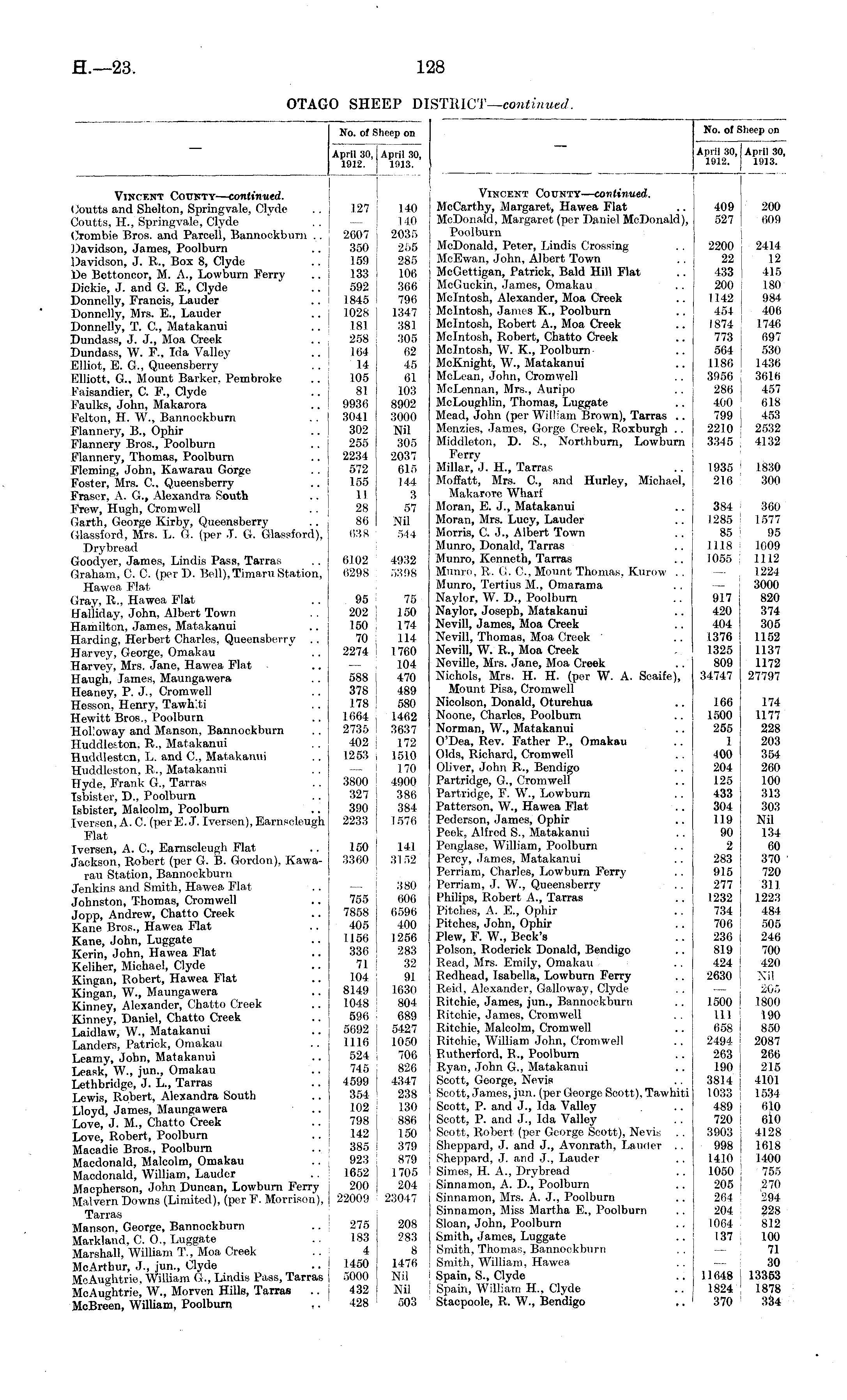 No. of Sheep on April 30, April 30, 1912. 1913. Vincent County— continued. McCarthy, Margaret, Hawea Flat McDonald, Margaret (per Daniel McDonald), Poolburn McDonald, Peter, Lindis Crossing McEwan, John, Albert Town McGettigan, Patrick, Bald Hill Flat McGuckin, James, Omakau Mcintosh, Alexander, Moa Creek Mcintosh, James K., Poolburn Mcintosh, Robert A., Moa Creek Mcintosh, Robert, Chatto Creek Mcintosh, W. K., Poolburn McKnight, W., Matakanui McLean, John, Cromwell McLennan, Mrs., Auripo McLoughlin, Thomas, Luggate Mead, John (per William Brown), Tarras .. Menzies, James, Gorge Creek, Roxburgh .. Middleton, D. S., Northburn, Lowburn Ferry Millar, J. H., Tarras Moffatt, Mrs. C, and Hurley, Michael, Makarore Wharf Moran, E. J., Matakanui Moran, Mrs. Lucy, Lauder Morris, C. J., Albert Town Munro, Donald, Tarras Munro, Kenneth, Tarras Munro, R. G. C, Mount Thomas. Kurow .. Munro, Tertius M., Omarama Naylor, W. D., Poolburn Naylor, Joseph, Matakanui Nevill, James, Moa Creek Nevill, Thomas, Moa Creek Nevill, W. R., Moa Creek Neville, Mrs. Jane, Moa Creek Nichols, Mrs. H. H. (per W. A. Scaife), Mount Pisa, Cromwell Nicolson, Donald, Oturehua Noone, Charles, Poolburn Norman, W., Matakanui O'Dea, Rev. Father P., Omakau Olds, Richard, Cromwell Oliver, John R., Bendigo Partridge, G, Cromwell Partridge, F. W., Lowburn Patterson, W., Hawea Flat Pederson, James, Ophir Peek, Alfred S., Matakanui Penglase, William, Poolburn Percy, James, Matakanui Perriam, Charles, Lowburn Ferry Perriam, J. W., Queensberry Philips, Robert A., Tarras Pitches, A. E., Ophir Pitches, John, Ophir Plew, F. W., Beck's Poison, Roderick Donald, Bendigo Read, Mrs. Emily, Omakau Redhead, Isabella, Lowburn Ferry Reid, Alexander, Galloway, Clyde Ritchie, James, jun., Bannockburn Ritchie, James, Cromwell Ritchie, Malcolm, Cromwell Ritchie, William John, Cromwell Rutherford, R., Poolburn Ryan, John G., Matakanui Scott, George, Nevis Scott, James, jun. (per George Scott). Tawhiti Scott, P. and J., Ida Valley Scott, P. and J., Ida Valley Scott, Robert (per George Scott), Nevis .. Sheppard, J. and J., Avonrath, Lauder .. Sheppard, J. and J., Lauder Simes, H. A., Drybread Sinnamon, A. D., Poolburn Sinnamon, Mrs. A. J., Poolburn Sinnamon, Miss Martha E., Poolburn Sloan, John, Poolburn Smith, James, Luggate Smith, Thomas, Bannockburn Smith, William, Hawea Spain, S., Clyde Spain, William H., Clyde Stacpoole, R. W., Bendigo 409 200 527 609 2200 ! 2414 22 | 12 433 415 200 180 1142 984 454 406 1874 1746 773 697 564 530 1186 1436 3956 ! 3616 286 I 457 400 ' 618 799 453 2210 ! 2532 3345 j 4132 1935 ■ 1830 216 ! 300 384 ! 360 1285 ! 1577 85 95 1118 i 1009 1055 ! 1112 — 1224 — 3000 917 820 420 374 404 305 1376 1152 1325 1137 809 1172 34747 27797 166 174 1500 1177 255 228 1 203 400 354 204 260 125 100 433 313 304 303 119 Nil 90 134 2 60 283 370 915 720 277 311 1232 1223 734 484 706 505 236 246 819 700 424 420 2630 Nil — 2i05 1500 1800 in ; 190 658 ! 850 2494 I 2087 263 1 266 190 215 3814 ! 4101 1033 I 1534 489 i 610 720 610 3903 ! 4128 998 | 1618 1410 : 1400 1050 ! 755 205 | 270 264 ! '294 204 ! 228 1064 812 137 ! 100 — 71 30 11648 13353 1824 i 1878 370 ! 334