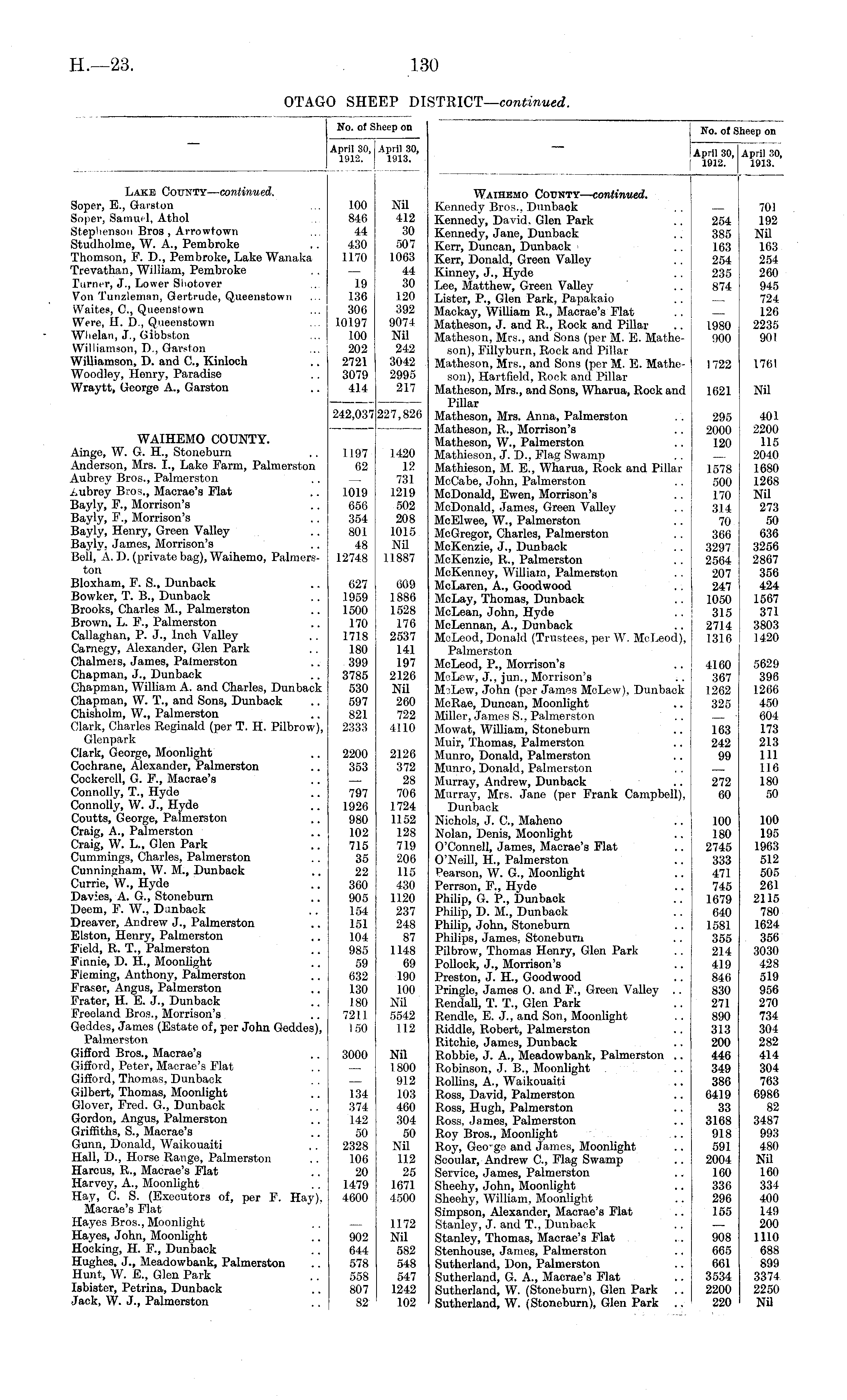No. of Sheep on April 30, j April 3( 1912. 1913. April 30, 1913. Lake County— continued. Soper, E., Garston Soper, Samuel, Athol Stephenson Bros, Arrowtown Studholme, W. A., Pembroke Thomson, F. D., Pembroke, Lake Wanaka Trevathan, William, Pembroke Turner, J., Lower Shotover Von Tunzleman, Gertrude, Queenstown Waites, G, Queenstown Were, H. D., Queenstown Whelan, J., Gibbston Williamson, D., Garston WiUiamson, D. and C, Kinloch Woodley, Henry, Paradise Wraytt, George A., Garston 100 846 44 430 1170 19 136 306 10197 100 202 2721 3079 414 Nil 412 30 507 1063 44 30 120 392 9074 Nil 242 3042 2995 217 242,037 227,826 WAIHEMO COUNTY. Ainge, W. G. H., Stoneburn Anderson, Mrs. I., Lake Farm, Palmerston Aubrey Bros., Palmerston Aubrey Bros., Macrae's Flat Bayly, F., Morrison's Bayly, F., Morrison's Bayly, Henry, Green Valley Bayly, James, Morrison's Bell, A. D. (private bag), Waihemo, Palmerston Bloxham, F. S., Dunback Bowker, T. B., Dunback Brooks, Charles M., Palmerston Brown. L. F., Palmerston Callaghan, P. J., Inch Valley Carnegy, Alexander, Glen Park Chalmei s, James, Palmerston Chapman, J., Dunback Chapman, William A. and Charles, Dunback Chapman, W. T., and Sons, Dunback Chisholm, W., Palmerston Clark, Charles Reginald (per T. H. Pilbrow), Glenpark Clark, George, Moonlight Cochrane, Alexander, Palmerston Cockerell, G. F., Macrae's Connolly, T., Hyde Connolly, W. J., Hyde Coutts, George, Palmerston Craig, A., Palmerston Craig, W. L, Glen Park Cummings, Charles, Palmerston Cunningham, W. M., Dunback Currie, W., Hyde Davies, A. G., Stoneburn Deem, F. W., Danback Dreaver, Andrew J., Palmerston Elston, Henry, Palmerston Field, R. T., Palmerston Finnie, D. H., Moonlight Fleming, Anthony, Palmerston Fraser, Angus, Palmerston Frater, H. E. J., Dunback Freeland Bros., Morrison's Geddes, James (Estate of, per John Geddes), Palmerston Gifford Bros., Macrae's Gifford, Peter, Macrae's Flat Gifford, Thomas, Dunback Gilbert, Thomas, Moonlight Glover, Fred. G, Dunback Gordon, Angus, Palmerston Griffiths, S., Macrae's Gunn, Donald, Waikouaiti Hall, D., Horse Range, Palmerston Harous, R., Macrae's Flat Harvey, A., MoonUght Hay, C. S. (Executors of, per F. Hay), Macrae's Flat Hayes Bros., Moonlight Hayes, John, Moonlight Hocking, H. F., Dunback Hughes, J., Meadowbank, Palmerston Hunt, W. E., Glen Park Isbister, Petrina, Dunback Jack, W. J., Palmerston 1197 62 1019 656 354 801 48 12748 627 1959 1500 170 1718 180 399 3785 530 597 821 2333 2200 353 797 1926 980 102 715 35 22 360 905 154 151 104 985 59 632 130 180 7211 150 1420 12 731 1219 502 208 1015 NU 11887 609 1886 1528 176 2537 141 197 2126 Nil 260 722 4110 2126 372 28 706 1724 1152 128 719 206 115 430 1120 237 248 87 1148 69 190 100 NU 5542 112 3000 134 374 142 50 2328 106 20 1479 4600 Nil 1800 912 103 460 304 50 Nil 112 25 1671 4500 902 644 578 558 807 82 1172 Nil 582 548 547 1242 102