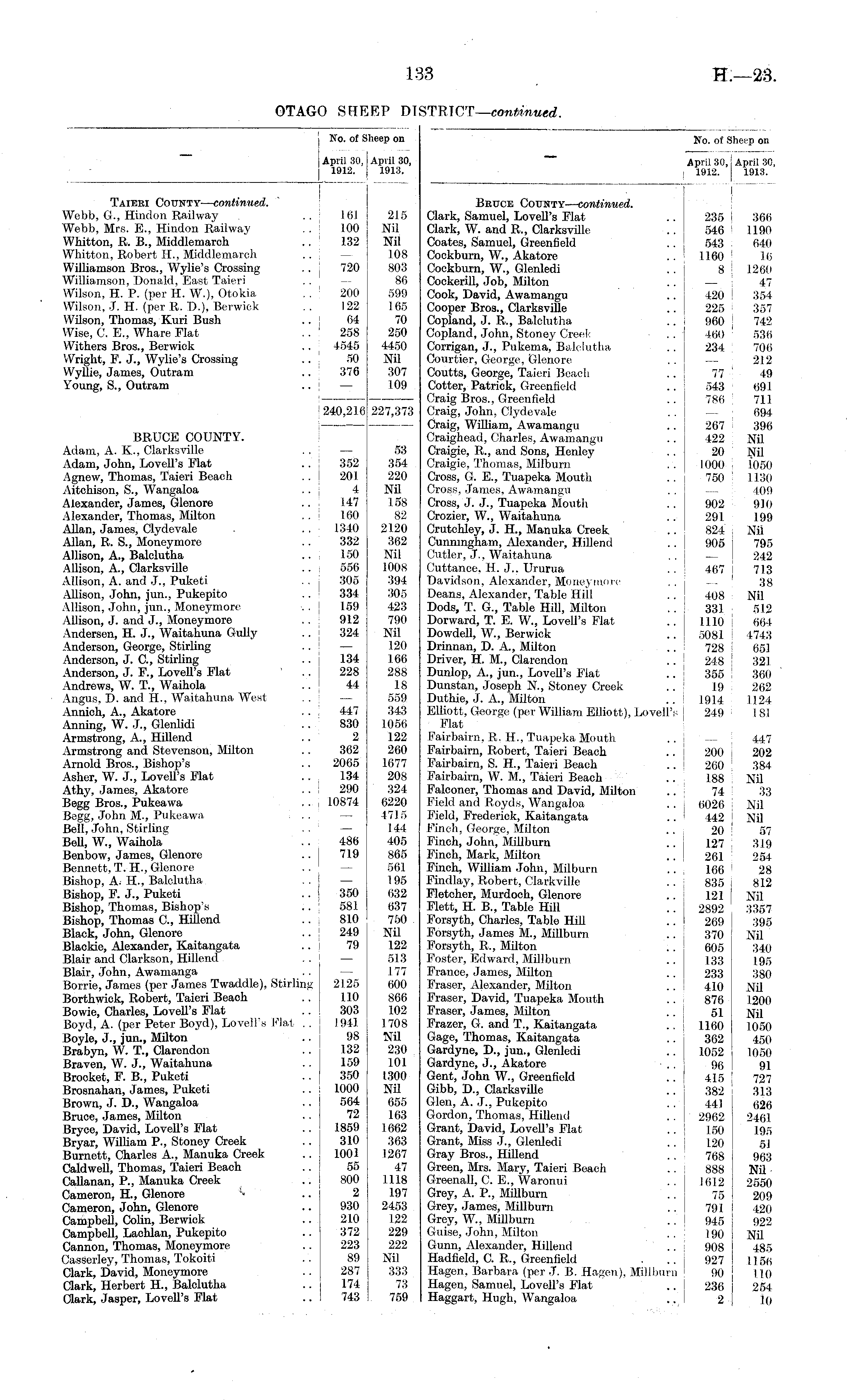 No. of S April 30, 1912. Sheep on S April 30, 1913. Taieri County— continued. Webb, G., Hindon Railway .. | 161 Webb, Mrs. E., Hindon Railway . . 100 Whitton, R. B., Middlemarch .. 132 Whitton, Robert H., Middlemarch .. — Williamson Bros., Wylie's Crossing .. 720 Williamson, Donald. East Taieri Wilson, H. P. (per H. W.), Otokia .. 200 Wilson, J. H. (per R. D.), Berwick . . 122 Wilson, Thomas, Kuri Bush .. j 64 Wise, C. E., Whare Flat . . 258 Withers Bros., Berwick .. 4545 Wright, F. J., Wylie's Crossing .. 50 Wyllie, James, Outram .. ; 376 Young, S., Outram 240,216 215 Nil Nil 108 803 86 599 165 70 250 4450 NU 307 109 227,373 BRUCE COUNTY. Adam, A. K., Clarksville Adam, John, Lovell's Flat .. 352 Agnew, Thomas, Taieri Beach .. 201 Aitchison, S., Wangaloa .. 4 Alexander, James, Glenore .. 147 Alexander, Thomas, MUton .. | 160 Allan, James, Clydevale . . 1340 Allan, R. S., Moneymore .. 332 Allison, A., Balclutha .. I 150 Allison, A., ClarksviUe .. 556 Allison, A. and J., Puketi .. 305 Allison, John, jun., Pukepito .. ! 334 Allison, John, jun., Moneymore . . 159 Allison, J. and J., Moneymore . . 912 Andersen, H. J., Waitahuna GuUy .. j 324 Anderson, George, Stirling .. j — Anderson, J. G, Stirling .. 134 Anderson, J. F, LoveU's Flat ' ... 228 Andrews, W. T., Waihola .. 44 Angus, D. and H., Waitahuna West Annioh, A., Akatore . . ! 447 Anning, W. J., Glenlidi .. 830 Armstrong, A., HUlend .. 2 Armstrong and Stevenson, Milton .. 362 Arnold Bros., Bishop's .. 2065 Asher, W. J., LoveU's Flat ... 134 Athy, James, Akatore .. ! 290 Begg Bros., Pukeawa .. 10874 Begg, John M., Pukeawa ... — Bell, John, Stirling BeU, W., Waihola .. 486 Benbow, James, Glenore 719 Bennett, T. H., Glenore Bishop, A. H., Balclutha. Bishop, F. J., Puketi .. 350 Bishop, Thomas, Bishop's .. ! 581 Bishop, Thomas G, HUlend ..' j 810 Black, John, Glenore .. j 249 Blackie, Alexander, Kaitangata .. J 79 Blair and Clarkson, HUlend .. — Blair, John, Awamanga Borrie, James (per James Twaddle), Stirling 2125 Borthwick, Robert, Taieri Beach .. 110 Bowie, Charles, LoveU's Flat .. 303 Boyd, A. (per Peter Boyd), Lovell's Flat .. 1941 Boyle, J., jun., MUton ... 98 Brabyn, W. T., Clarendon .. 132 Braven, W. J., Waitahuna .. 159 Brocket, F. B., Puketi .. 350 Brosnahan, James, Puketi .. 1000 Brown, J. D., Wangaloa .. 564 Bruce, James, MUton .. 72 Bryce, David, LoveU's Flat .. 1859 Bryar, William P., Stoney Creek .. 310 Burnett, Charles A., Manuka Creek .. 1001 Caldwell, Thomas, Taieri Beach .. 55 Callanan, P., Manuka Creek 800 Cameron, H, Glenore '• .. 2 Cameron, John, Glenore .. 930 CampbeU, Colin, Berwick .. 210 Campbell, Laohlan, Pukepito .. 372 Cannon, Thomas, Moneymore .. 223 Casserley, Thomas, Tokoiti .. 89 Clark, David, Moneymore .. 287 Clark, Herbert H, Balclutha .. 174 Clark, Jasper, LoveU's Flat .. 743 53 354 220 NU 158 82 2120 362 Nil 1008 394 305 423 790 Nil 120 166 288 18 559 343 1056 122 260 1677 208 324 6220 4715 144 405 865 561 195 632 637 750 . Nil 122 513 177 600 866 102 1708 Nil 230 101 1300 Nil 655 163 1662 363 1267 47 1118 197 2453 122 229 222 Nil 333 73 759