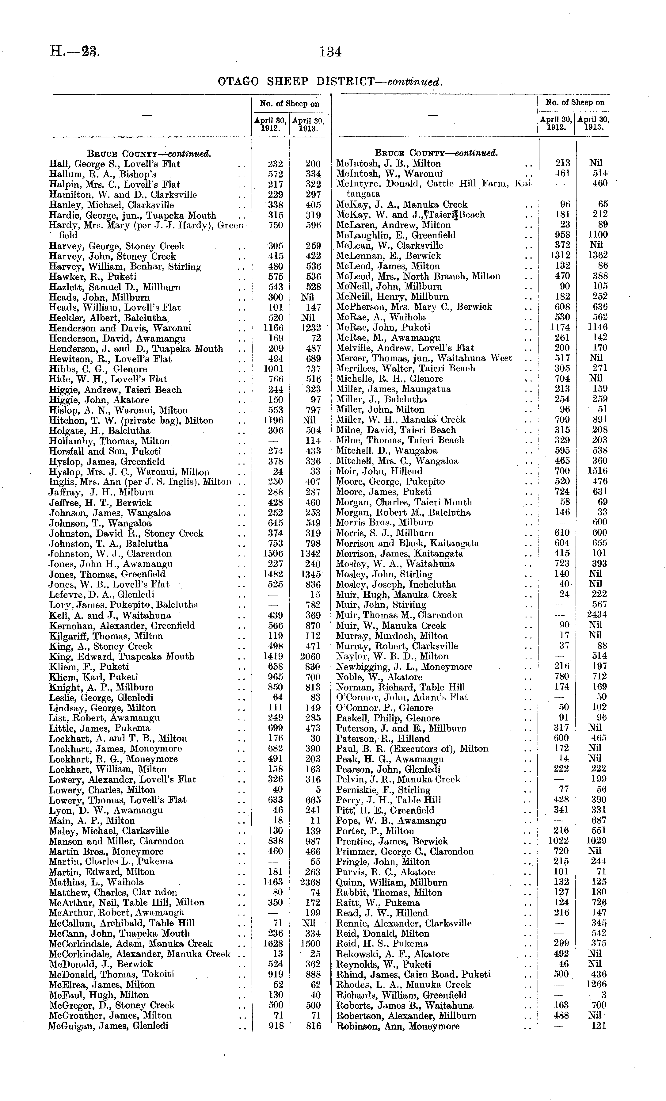 No. of Sheep on April 30, April 30, 1912. 1913. Bruce HaU, George S., LoveU's Flat HaUum, R. A., Bishop's Halpin, Mrs. G, Lovell's Flat Hamilton, W. and D., Clarksville Hanley, Michael, ClarksviUe Hardie, George, jun., Tuapeka Mouth Hardy, Mrs. Mary (per J. J. Hardv), Green- ' field 232 572 217 229 338 315 750 200 334 322 297 405 319 596 Harvey, George, Stoney Creek Harvey, John, Stoney Creek Harvey, William, Benhar, Stirling Hawker, R., Puketi Hazlett, Samuel D., MiUburn Heads, John, Millburn Heads, William, LoveU's Flat Heckler, Albert, Balclutha Henderson and Davis, Waronui Henderson, David, Awamangu Henderson, J. and D., Tuapeka Mouth Hewitson, R., Lovell's Flat Hibbs, G G., Glenore Hide, W. H., LoveU's Flat Higgie, Andrew, Taieri Beach Higgie, John, Akatore Hislop, A. N., Waronui, MUton Hitchon, T. W. (private bag), Milton Holgate, H., Balclutha Hollamby, Thomas, Milton Horsfall and Son, Puketi Hyslop, James, Greenfield Hyslop, Mrs. J. C, Waronui, Milton Inglis, Mrs. Ann (per J. S. Inglis), Milton . . Jaffray, J. H., Milburn Jeffree, H. T., Berwick Johnson, James, Wangaloa Johnson, T., Wangaloa Johnston, David R., Stoney Creek Johnston, T. A., Balclutha Johnston, W. J., Clarendon Jones, John H., Awamangu Jones, Thomas, Greenfield Jones, W. B., LoveU's Flat Lefevre, D. A., Glenledi Lory, James, Pukepito, Balclutha Kelt, A. and J., Waitahuna Kernohan, Alexander, Greenfield Kilgariff, Thomas, Milton King, A., Stoney Creek King, Edward, Tuapeaka Mouth Kliem, F., Puketi Kliem, Karl, Puketi Knight, A. P., Millburn Leslie, George, Glenledi Lindsay, George, Milton List, Robert, Awamangu Little, James, Pukema Lockhart, A. and T. B., Milton Lockhart, James, Moneymore Lockhart, R. G., Moneymore Lockhart, William, Milton Lowery, Alexander, Lovell's Flat Lowery, Charles, Milton Lowery, Thomas, LoveU's Flat Lyon, D. W., Awamangu Main, A. P., Milton Maley, Michael, Clarksville Manson and Miller, Clarendon Martin Bros., Moneymore Martin, Charles L., Pukema Martin, Edward, Milton Mathias, L., Waihola Matthew, Charles, Clar ndon McArthur, Neil, Table Hill, Milton McArthur, Robert, Awamangu McCallum, Archibald, Table Hill McCann, John, Tuapeka Mouth McCorkindale, Adam, Manuka Creek McCorkindale, Alexander, Manuka Creek .. McDonald, J., Berwick McDonald, Thomas, Tokoiti McElrea, James, Milton MeFaul, Hugh, MUton McGregor, D., Stoney Creek McGrouther, James, Milton McGuigan, James, Glenledi 305 415 480 575 543 300 101 520 1166 169 209 494 1001 766 244 150 553 1196 306 259 422 536 536 528 NU 147 Nil 1232 72 487 689 737 516 323 97 797 Nil 504 114 433 336 33 407 287 460 253 549 319 798 1342 240 1345 836 15 782 369 870 112 471 2060 830 700 813 83 149 285 473 30 390 203 163 316 5 665 241 11 139 987 466 55 263 2368 74 172 199 NU 334 1500 25 362 888 62 40 500 71 816 274 378 24 250 288 428 252 645 374 753 1506 227 1482 525 439 566 119 498 1419 658 965 850 64 111 249 699 176 682 491 158 326 40 633 46 18 130 838 460 181 1463 80 350 71 236 1628 13 524 919 52 130 500 71 918