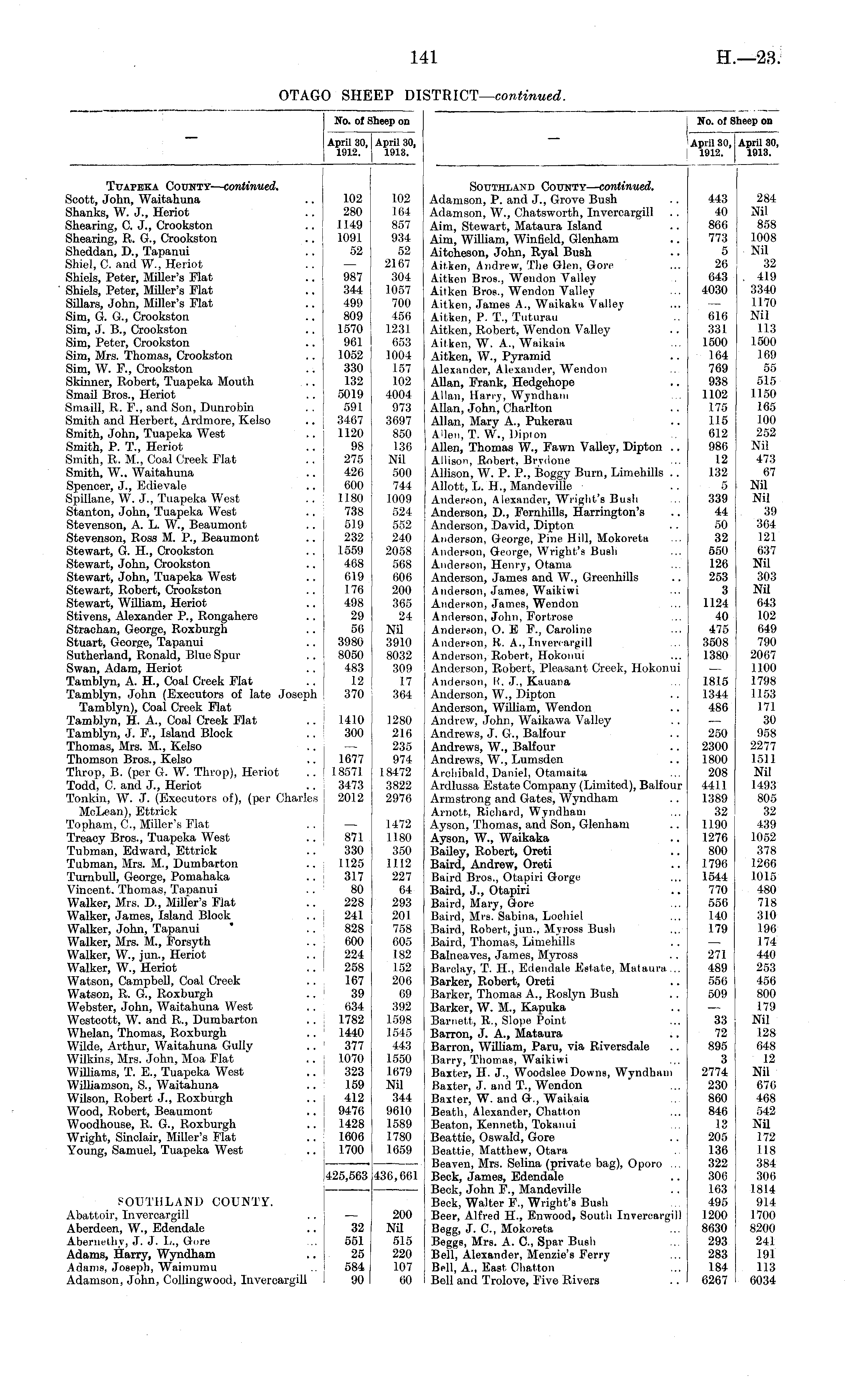 No. of Sheep on April 30, April 30, 1912. 1913. Tuapeka County— continued. Scott, John, Waitahuna Shanks, W. J., Heriot Shearing, C. J., Crookston Shearing, R. G., Crookston Sheddan, D., Tapanui Shiel, G and W., Heriot Shiels, Peter, Miller's Flat Shiels, Peter, MiUer's Flat SUlars, John, MUler's Flat Sim, G. G, Crookston Sim, J. B., Crookston Sim, Peter, Crookston Sim, Mrs. Thomas, Crookston Sim, W. F, Crookston Skinner, Robert, Tuapeka Mouth SmaU Bros., Heriot SmaiU, R. F., and Son, Dunrobin Smith and Herbert, Ardmore, Kelso Smith, John, Tuapeka West Smith, P. T., Heriot Smith, R. M., Coal Creek Flat Smith, W.. Waitahuna Spencer, J., Edievale Spillane, W. J., Tuapeka West Stanton, John, Tuapeka West Stevenson, A. L. W., Beaumont Stevenson, Ross M. P., Beaumont Stewart, G. H, Crookston Stewart, John, Crookston Stewart, John, Tuapeka West Stewart, Robert, Crookston Stewart, WiUiam, Heriot Stivens, Alexander P., Rongahere Strachan, George, Roxburgh Stuart, George, Tapanui Sutherland, Ronald, Blue Spur Swan, Adam, Heriot Tamblyn, A. H., Coal Creek Flat Tamblyn, John (Executors of late Josenh Tamblyn), Coal Creek Flat Tamblyn, H. A., Coal Creek Flat Tamblyn, J. F., Island Block Thomas, Mrs. M., Kelso Thomson Bros., Kelso Throp, B. (per G. W. Throp), Heriot Todd, G and J., Heriot Tonkin, W. J. (Executors of), (per Charles McLean), Ettrick Topham, C, Miller's Flat Treacy Bros., Tuapeka West Tubman, Edward, Ettrick Tubman, Mrs. M., Dumbarton TurnbuU, George, Pomahaka Vincent. Thomas. Tananui Walker, Mrs. D., MiUer's Fiat Walker, James, Island Block Walker, John, Tapanui Walker, Mrs. M., Forsyth Walker, W., jun., Heriot Walker, W., Heriot Watson, Campbell, Coal Creek Watson, R. G., Roxburgh Webster, John, Waitahuna West Westcott, W. and R., Dumbarton Whelan, Thomas, Roxburgh WUde, Arthur, Waitahuna Gully Wilkins, Mrs. John, Moa Flat Williams, T. E., Tuapeka West WiUiamson, S., Waitahuna Wilson, Robert J., Roxburgh Wood, Robert, Beaumont Woodhouse, R. G., Roxburgh Wright, Sinclair, Miller's Flat Young, Samuel, Tuapeka West 102 280 1149 1091 52 987 344 499 809 1570 961 1052 330 132 5019 591 3467 1120 98 275 426 600 1180 738 519 232 1559 468 619 176 498 29 56 3980 8050 483 12 370 102 164 857 934 52 2167 304 1057 700 456 1231 653 1004 157 102 4004 973 3697 850 136 Nil 500 744 1009 524 552 240 2058 568 606 200 365 24 NU 3910 8032 309 17 364 1410 300 1677 18571 3473 2012 1280 216 235 974 18472 3822 2976 871 330 1125 317 80 228 241 828 600 224 258 167 39 634 1782 1440 377 1070 323 159 412 9476 1428 1606 1700 1472 1180 350 1112 227 64 293 201 758 605 182 152 206 69 392 1598 1545 443 1550 1679 NU 344 9610 1589 1780 1659 425,563 436,66! SOUTHLAND COUNTY. Abattoir, Invercargill Aberdeen, W., Edendale Abernelhv, J. J. L., Gore Adams, Harry, Wyndham Adams, Joseph, Waimumu Adamson, John, Collingwood, Invercargill 32 551 25 584 90 200 NU 515 220 107 00