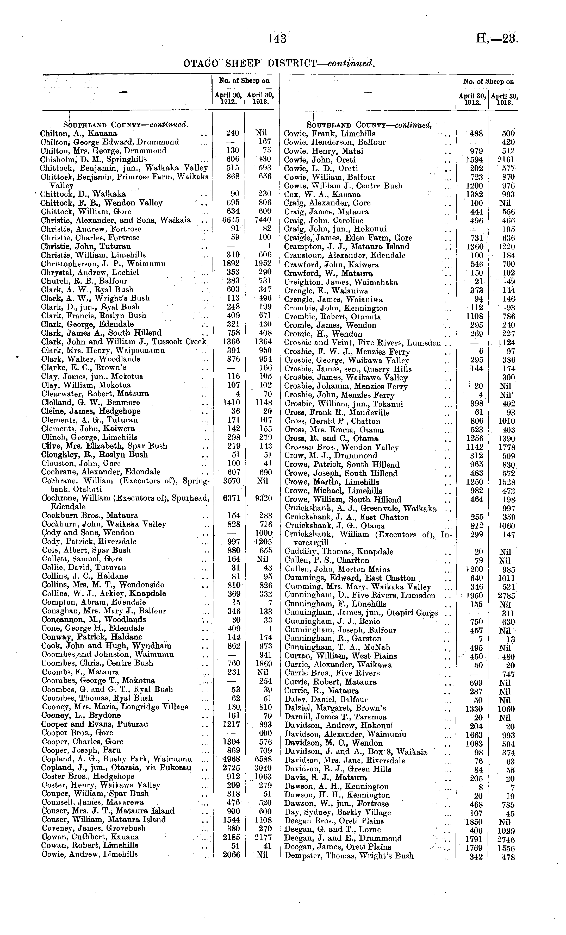 No. of Sheep on April 30, April 30, 1912. 1913. Southland County— continued. ChUton, A., Kauana Chilton, George Edward, Drummond Chilton, Mrs. George, Drummond Chisholm, D. M., Springhills Chittock, Benjamin, jun., Waikaka Valley Chittock, Benjamin, Primrose Farm, Waikaka Valley Chittock, D., Waikaka Chittock, F. B., Wendon Valley ... Chittock, William, Gore Christie, Alexander, and Sons, Waikaia Christie, Andrew, Fortrose Christie, Charles, Fortrose Christie, John, Tuturau Christie, William, Limehills Christopherson, J. P., Waimumu Chrystal, Andrew, Lochiel Church, R. B., Balfour Clark, A. W., Ryal Bush Clark, A. W., Wright's Bush Clark, D., jun., Ryal Bush Clark, Francis, Roslyn Bush Clark, George, Edendale Clark, James A., South HiUend Clark, John and WiUiam J., Tussock Creek Clark, Mrs. Henry, Waipounamu Clark, Walter, Woodlands Clarke, E. G, Brown's Clay, James, jun., Mokotua Clay, William, Mokotua Clearwater, Robert, Mataura CleRand, G. W., Benmore Cleine, James, Hedgehope Clements, A. G., Tuturau Clements, John, Kaiwera Clinch, George, Limehills Clive, Mrs. Elizabeth, Spar Bush Cloughley, R., Roslyn Bush Clouston, John, Gore Cochrane, Alexander, Edendale Cochrane, William (Executors of), Springbank, Otahuti Cochrane, WiUiam (Executors of), Spurhead, Edendale Cockburn Bros., Mataura Cockburn, John, Waikaka Valley Cody and Sons, Wendon Cody, Patrick, Riversdale Cole, Albert, Spar Bush Collett, Samuel, Gore Collie, David, Tuturau CoUins, J. G, Haldane CoUins, Mrs. M. T., Wendonside Collins, W. J., Arkley, Knapdale Compton, Abram, Edendale Conaghan, Mrs. Mary J., Balfour Concannon, M., Woodlands Cone, George H., Edendale Conway, Patrick, Haldane Cook. John and Hugh, Wyndham Coombes and Johnston, Waimumu Coombes, Chris., Centre Bush Coombs, F., Mataura Coombes, George T., Mokotua Coombes, G. and G. T., Ryal Bush Coombes, Thomas, Ryal Bush Cooney, Mrs. Maria, Longridge Village Cooney, L., Brydone Cooper and Evans, Puturau Cooper Bros., Gore Cooper, Charles, Gore Cooper, Joseph, Paru Copland, A. G., Bushy Park, Waimumu Copland, J., jun., Otaraia, via Pukerau Coster Bros., Hedgehope Coster, Henry, Waikawa Valley Couper, WUliam, Spar Bush Counsell, James, Makarewa Couser, Mrs. J. T., Mataura Island Couser, WUliam, Mataura Island Coveney, James, Grovebush Cowan, Cuthbert, Kauana ... Cowan, Robert, LimehUls Cowie, Andrew, Limehills ... 240 130 606 515 868 90 695 634 6615 91 59 319 1892 353 283 603 113 248 409 321 758 1366 394 876 116 107 4 1410 36 171 142 298 219 51 100 - 607 3570 Nil 167 75 430 593 656 230 806 600 7440 82 100 1 606 1952 290 731 347 496 199 671 430 408 1364 950 954 166 105 102 70 1148 20 107 155 279 143 51 41 690 Nil 6371 9320 154 828 283 716 1000 1205 655 NU 43 95 826 332 7 133 33 1 174 973 941 1869 NU 254 39 51 810 70 893 600 576 709 6588 3040 1063 279 51 520 600 1108 270 2177 41 NU 997 880 164 31 81 810 369 15 346 30 409 144 862 760 231 53 62 130 161 1217 1304 869 4968 2725 912 209 318 476 900 1544 380 2185 51 2066