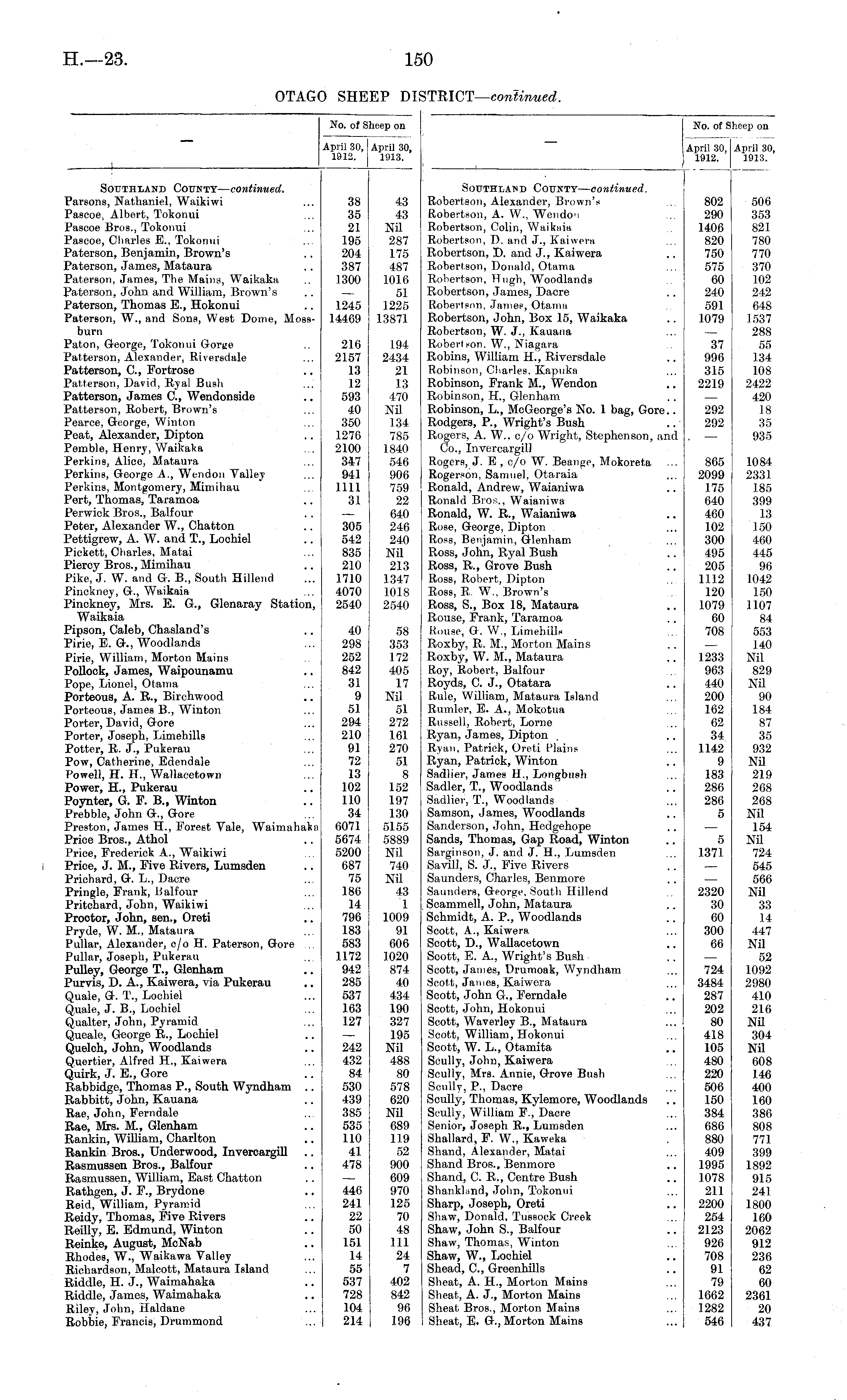 No. of Sheep on April 30, April 30, 1912. 1913. Southland County— continued. Parsons, Nathaniel, Waikiwi Pascoe, Albert, Tokonui Pascoe Bros., Tokonui Pascoe, Charles E., Tokonui Paterson, Benjamin, Brown's Paterson, James, Mataura Paterson, James, The Mains, Waikaka Paterson, John and William, Brown's Paterson, Thomas E., Hokonui Paterson, W., and Sons, West Dome, Mossburn Paton, George, Tokonui Gorge Patterson, Alexander, Riversdale Patterson, G, Fortrose Patterson, David, Ryal Bush Patterson, James G, Wendonside Patterson, Robert, Brown's Pearce, George, Winton Peat, Alexander, Dipton Pemble, Henry, Waikaka Perkins, Alice, Mataura Perkins, George A., Wendon Valley Perkins, Montgomery, Mimihau Pert, Thomas, Taramoa Perwick Bros., Balfour Peter, Alexander W., Chatton Pettigrew, A. W. and T., Lochiel Pickett, Charles, Matai Piercy Bros., Mimihau Pike, J. W. and G. B., South Hillend Pinckney, G., Waikaia Pinckney, Mrs. E. G., Glenaray Station, Waikaia Pipson, Caleb, Chasland's Pirie, E. G., Woodlands Pirie, William, Morton Mains PoUock, James, Waipounamu Pope, Lionel, Otama Porteous, A. R., Birchwood Porteous, James B., Winton Porter, David, Gore Porter, Joseph, Limehills Potter, R. J., Pukerau Pow, Catherine, Edendale Powell, H. H., Wallacetown Power, H., Pukerau Poynter, G. F. B., Winton Prebble, John G., Gore Preston, James H., ForeBt Vale, Waimahaka Price Bros., Athol Price, Frederick A., Waikiwi Price, J. M., Five Rivers, Lumsden Prichard, G. L., Dacre Pringle, Frank, Balfour Pritehard, John, Waikiwi Proctor, John, sen., Oreti Pryde, W. M., Mataura Pullar, Alexander, c/o H. Paterson, Gore ... Pullar, Joseph, Pukerau PuUey, George T., Glenham Purvis, D. A., Kaiwera, via Pukerau Quale, G. T., Lochiel Quale, J. B., Lochiel Qualter, John, Pyramid Queale, George R., Lochiel Quelch, John, Woodlands Quertier, Alfred H., Kaiwera Quirk, J. E., Gore Rabbidge, Thomas P., South Wyndham .. Rabbitt, John, Kauana Rae, John, Ferndale Rae, Mrs. M., Glenham Rankin, WiUiam, Charlton Rankin Bros., Underwood, InvercargUl Rasmussen Bros., Balfour Rasmussen, William, East Chatton Rathgen, J. F., Brydone Reid, William, Pyramid Reidy, Thomas, Five Rivers ReiUy, E. Edmund, Winton Reinke, August, McNab Rhodes, W., Waikawa Valley Richardson, Malcott, Mataura Island Riddle, H. J., Waimahaka Riddle, James, Waimahaka Riley, John, Haldane Robbie, Francis, Drummond 38 35 21 195 204 387 1300 1245 14469 216 2157 13 12 593 40 350 1276 2100 347 941 1111 31 305 542 835 210 1710 4070 2540 40 298 252 842 31 9 51 294 210 91 72 13 102 110 34 6071 5674 5200 687 75 186 14 796 183 583 1172 942 285 537 163 127 43 43 Nil 287 175 487 1016 51 1225 13871 194 2434 21 13 470 Nil 134 785 1840 546 906 759 22 640 246 240 Nil 213 1347 1018 2540 58 353 172 405 17 Nil 51 272 161 270 51 8 152 197 130 5155 5889 Nil 740 Nil 43 1 1009 91 606 1020 874 40 434 190 327 195 Nil 488 80 578 620 NU 689 119 52 900 609 970 125 70 48 111 24 7 402 842 96 196 242 432 84 530 439 385 535 110 41 478 446 241 22 50 151 14 55 537 728 104 214