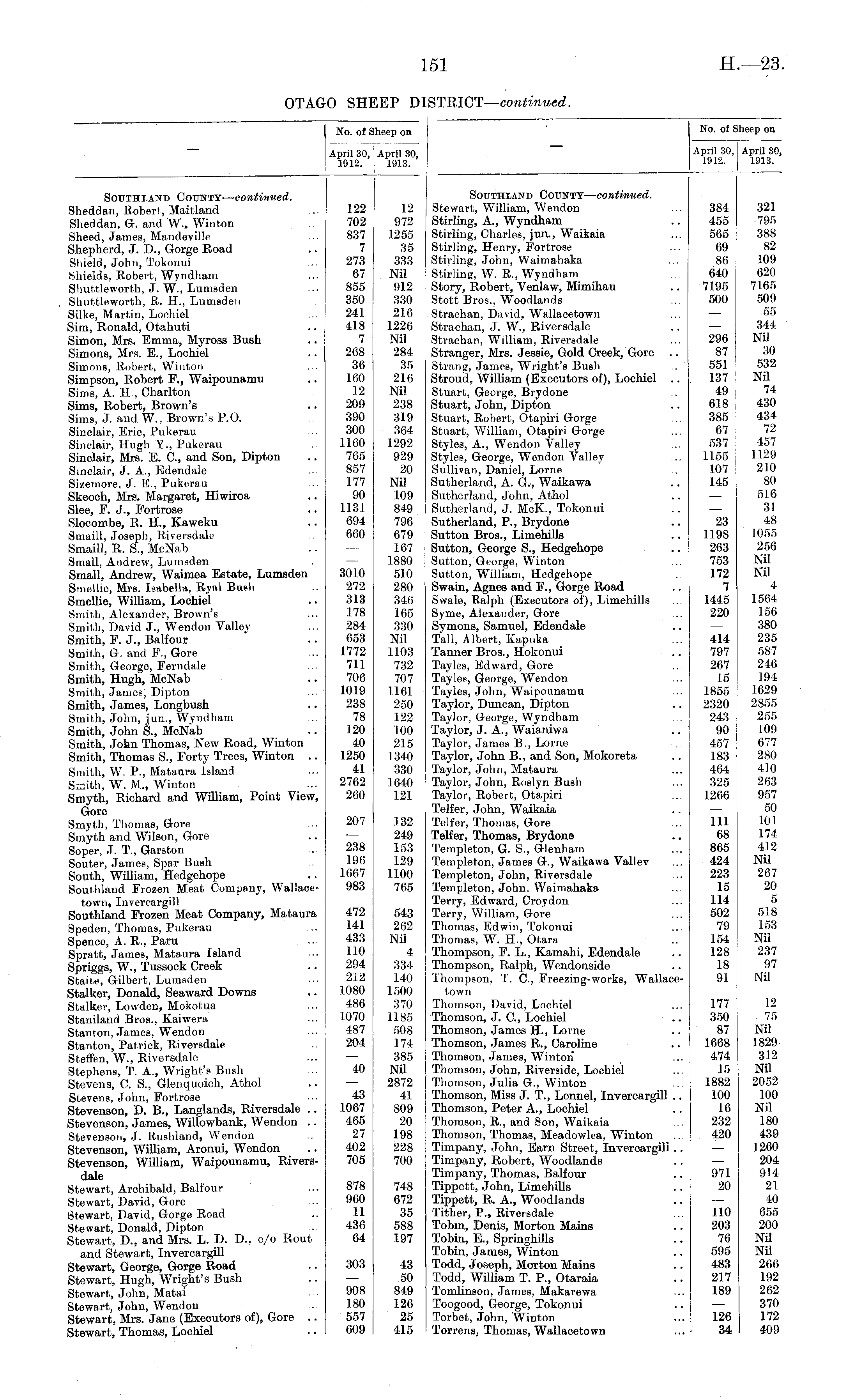 No. of Sheep on April 30, April 30, 1912. 1913. Southland County— continued. Stewart, William, Wendon Stirling, A., Wyndham Stirling, Charles, jun., Waikaia Stirling, Henry, Fortrose Stirling, John, Waimahaka Stirling, W. R., Wyndham Story, Robert, Venlaw, Mimihau Stott Bros., Woodlands Strachan, David, Wallacetown Strachan, J. W., Riversdale Strachan, William, Riversdale Stranger, Mrs. Jessie, Gold Creek, Gore .. Strang, James, Wright's Bush Stroud, WiUiam (Executors of), Lochiel .. Stuart, George, Brydone Stuart, John, Dipton Stuart, Robert, Otapiri Gorge Stuart, William, Otapiri Gorge Styles, A., Wendon Valley Styles, George, Wendon Valley Sullivan, Daniel, Lome Sutherland, A. G.,, Waikawa Sutherland, John, Athol Sutherland, J. McK., Tokonui Sutherland, P., Brydone Sutton Bros., LimehUls Sutton, George S., Hedgehope Sutton, George, Winton Sutton, William, Hedgehope Swain, Agnes and F., Gorge Road Swale, Ralph (Executors of), Limehills Syme, Alexander, Gore Symons, Samuel, Edendale Tall, Albert, Kapuka Tanner Bros., Hokonui Tayles, Edward, Gore Tayles, George, Wendon Tayles, John, Waipounamu Taylor, Duncan, Dipton Taylor, George, Wyndham Taylor, J. A., Waianiwa Taylor, James B., Lome Taylor, John B., and Son, Mokoreta Taylor, John, Mataura Taylor, John, Roslyn Bush Taylor, Robert, Otapiri Telfer, John, Waikaia Telfer, Thomas, Gore Telfer, Thomas, Brydone Templeton, G. S., Glenham Templeton, James G., Waikawa Vallev Templeton, John, Riversdale Templeton, John, Waimahaka Terry, Edward, Croydon Terry, William, Gore Thomas, Edwin, Tokonui Thomas, W. H., Otara Thompson, F. L., Kamahi, Edendale Thompson, Ralph, Wendonside Thompson, T. G, Freezing-works, Wallacetown Thomson, David, Lochiel Thomson, J. G, Lochiel Thomson, James H., Lome Thomson, James R., Caroline Thomson, James, Winton Thomson, John, Riverside, Lochiel Thomson, Julia G., Winton Thomson, Miss J. T., Lennel, InvercargUl .. Thomson, Peter A., Lochiel Thomson, R., and Son, Waikaia Thomson, Thomas, Meadowlea, Winton Timpany, John, Earn Street, Invercargill .. Timpany, Robert, Woodlands Timpany, Thomas, Balfour Tippett, John, Limehills Tippett, R. A., Woodlands Tither, P., Riversdale Tobm, Denis, Morton Mains Tobin, E., SpringhiUs Tobin, James, Winton Todd, Joseph, Morton Mains Todd, WUliam T. P., Otaraia Tomlinson, James, Makarewa Toogood, George, Tokonui Torbet, John, Winton Torrens, Thomas, Wallacetown 384 455 565 69 86 640 7195 500 296 87 551 137 49 618 385 67 537 1155 107 145 23 1198 263 753 172 7 1445 220 414 797 267 15 1855 2320 243 90 457 183 464 325 1266 321 795 388 82 109 620 7165 509 55 344 Nil 30 532 NU 74 430 434 72 457 1129 210 80 516 31 48 1055 256 Nil Nil 4 1564 156 380 235 587 246 194 1629 2855 255 109 677 280 410 263 957 50 101 174 412 Nil 267 20 5 518 153 Nil 237 97 Nil 111 68 865 424 223 15 114 502 79 154 128 18 91 177 350 87 1668 474 15 1882 100 16 232 420 971 20 12 75 Nil 1829 312 Nil 2052 100 Nil 180 439 1260 204 914 21 40 655 200 Nil NU 266 192 262 370 172 409 110 203 76 595 483 217 189 126 34