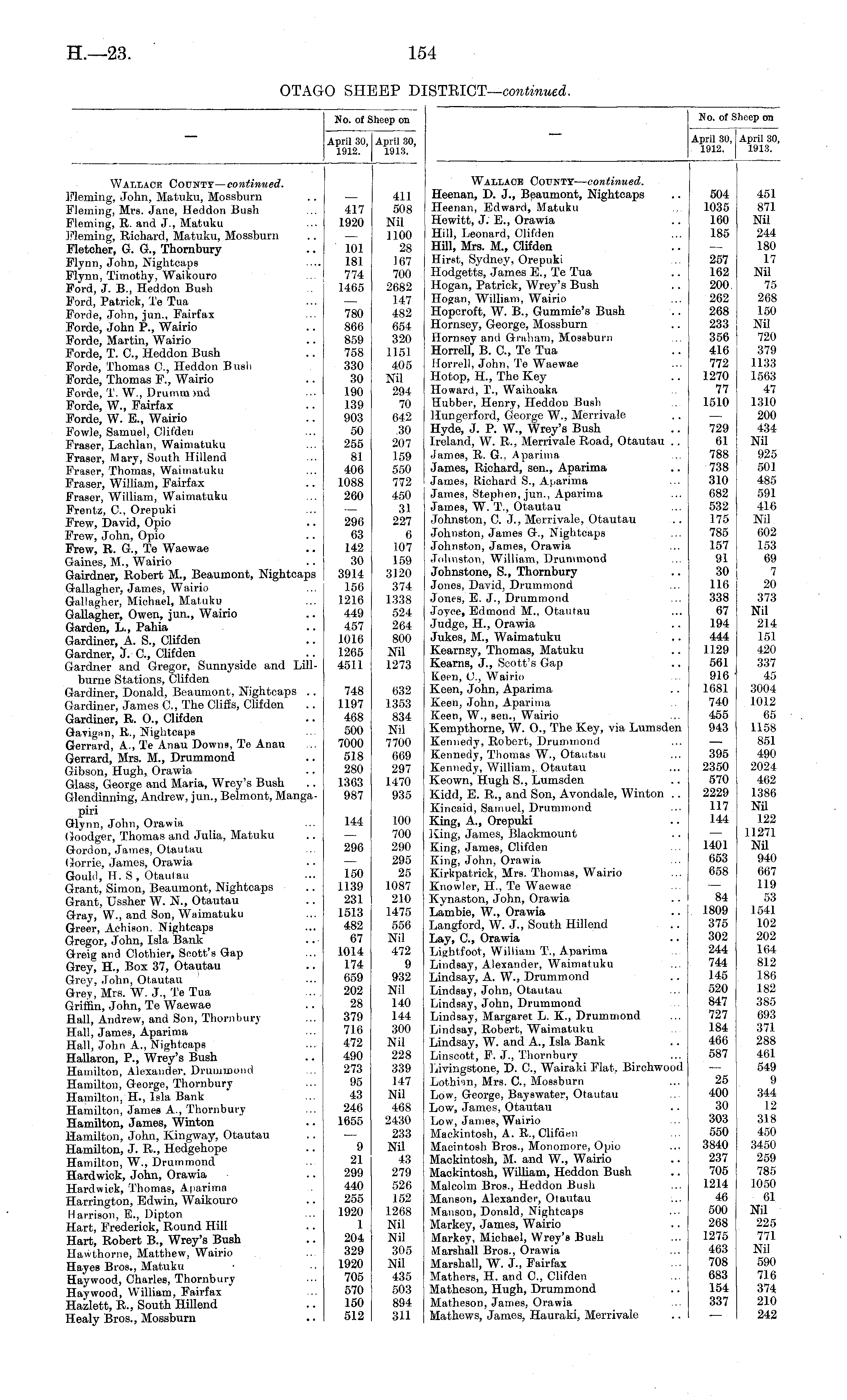 No. of Sheep on April 30, April 30, 1912. 1913. Wallace County— continued. Fleming, John, Matuku, Mossburn Fleming, Mrs. Jane, Heddon Bush Fleming, R. and J., Matuku Fleming, Richard, Matuku, Mossburn Fletcher, G. G., Thornbury Flynn, John, Nightcaps Flynn, Timothy, Waikouro Ford, J. B., Heddon Bush Ford, Patrick, Te Tua Forde, John, jun., Fairfax Forde, John P., Wairio Forde, Martin, Wairio Forde, T. C, Heddon Bush Forde, Thomas G, Heddon Bush Forde, Thomas F., Wairio Forde, T. W., Drumm >nd Forde, W., Fairfax Forde, W. E., Wairio Fowle, Samuel, Clifden Fraser, Lachlan, Waimatuku Fraser, Mary, South Hillend Fraser, Thomas, Waimatuku Fraser, William, Fairfax Eraser, William, Waimatuku Frentz, C, Orepuki Frew, David, Opio Frew, John, Opio Frew, R. G., Te Waewae Gaines, M., Wairio Gairdner, Robert M., Beaumont, Nightcaps Gallagher, James, Wairio Gallagher, Michael, Matuku GaUagher, Owen, jun., Wairio Garden, L., Pahia Gardiner, A. S., Clifden Gardner, J. G, Clifden Gardner and Gregor, Sunnyside and Lillburne Stations, Clifden Gardiner, Donald, Beaumont, Nightcaps .. Gardiner, James C, The Cliffs, Clifden Gardiner, R. 0., Clifden Gavigan, R., Nightcaps Gerrard, A., Te Anau Downs, Te Anau Gerrard, Mrs. M., Drummond Gibson, Hugh, Orawia Glass, George and Maria, Wrey's Bush Glendinning, Andrew, jun., Belmont, Mangapiri Glynn, John, Orawia Goodger, Thomas and Julia, Matuku Gordon, Janies, Otautau I Jorrie, James, Orawia Gould, H. S, Otautau Grant, Simon, Beaumont, Nightcaps Grant, Ussher W. N., Otautau Gray, W., and Son, Waimatuku Greer, Achison. Nightcaps Gregor, John, Isla Bank Greig and Clothier, Scott's Gap Grey, H., Box 37, Otautau Grey, John, Otautau Grey, Mrs. W. J., Te Tua Griffin, John, Te Waewae Hall, Andrew, and Son, Thornbury Hall, James, Aparima Hall, John A., Nightcaps HaUaron, P., Wrey's Bush Hamilton, Alexander, Drummond Hamilton, George, Thornbury Hamilton, H., Isla Bank Hamilton, James A., Thornbury HamUton, James, Winton Hamilton, John, Kingway, Otautau HamUton, J. R., Hedgehope Hamilton, W., Drummond Hardwick, John, Orawia Hardwick, Thomas, Aparima Harrington, Edwin, Waikouro Harrison, E., Dipton Hart, Frederick, Round Hill Hart, Robert B., Wrey's Bush Hawthorne, Matthew, Wairio Hayes Bros., Matuku Haywood, Charles, Thornbury Haywood, William, Fairfax Hazlett, R., South Hillend Healy Bros., Mossburn 417 1920 101 181 774 1465 780 866 859 758 330 30 190 139 903 50 255 81 406 1088 260 296 63 142 30 3914 156 1216 449 457 1016 1265 4511 748 1197 468 500 7000 518 280 1363 987 411 508 Nil 1100 28 .167 700 2682 147 482 654 320 1151 405 Nil 294 70 642 .30 207 159 550 772 450 31 227 6 107 159 3120 374 1338 524 264 800 Nil 1273 632 1353 834 Nil 7700 669 297 1470 935 144 100 700 290 295 25 1087 210 1475 556 Nil 472 9 932 Nil 140 144 300 Nil 228 339 147 Nil 468 2430 233 Nil 43 279 526 152 1268 Nil Nil 305 Nil 435 503 894 311 296 150 1139 231 1513 482 67 1014 174 659 202 28 379 716 472 490 273 95 43 246 1655 9 21 299 440 255 1920 1 204 329 1920 705 570 150 512