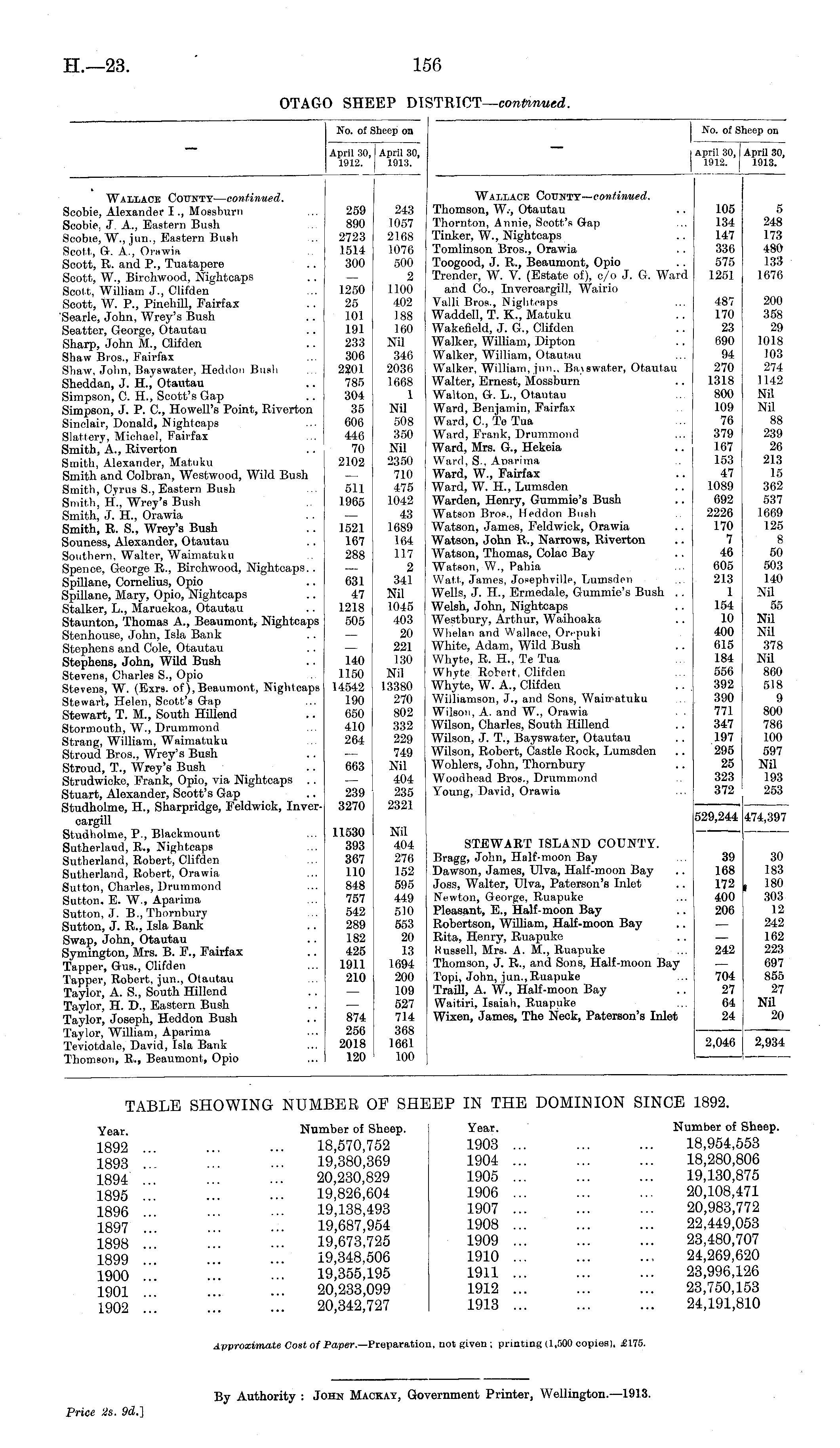 No. of Sheep on April 30, April 30, 1912. 1913. Wallace County— continued. Scobie, Alexander I., Mossburn Scobie, J. A., Eastern Bush Scobie, W., jun., Eastern Bush Scott, G. A., Orawia Scott, R. and P., Tuatapere Scott, W., Birchwood, Nightcaps Scott, William J., Clifden Scott, W. P., Pinehill, Fairfax Searle, John, Wrey's Bush Seatter, George, Otautau Sharp, John M., Clifden Shaw Bros., Fairfax Shaw, John, Bayswater, Heddon Bush Sheddan, J. H, Otautau Simpson, C. H., Scott's Gap Simpson, J. P. G, Howell's Point, Riverton Sinclair, Donald, NightcapB Slattery, Michael, Fairfax Smith, A., Riverton Smith, Alexander, Matuku Smith and Colbran, Westwood, Wild Bush Smith, Cyrus S., Eastern BubIi Smith, H., Wrey's Bush Smith, J. H., Orawia Smith, R. S., Wrey's Bush Souness, Alexander, Otautau Southern, Walter, Waimatuku Spence, George R., Birchwood, Nightcaps.. Spillane, Cornelius, Opio Spillane, Mary, Opio, Nightcaps Stalker, L., Maruekoa, Otautau Staunton, Thomas A., Beaumont, Nightcaps Stenhouse, John, Isla Bank Stephens and Cole, Otautau Stephens, John, WUd Bush Stevens, Charles S., Opio Stevens, W. (Exrs. of), Beaumont, Nightcaps Stewart, Helen, Scott's Gap Stewart, T. M., South Hillend Stormouth, W., Drummond Strang, William, Waimatuku Stroud Bros., Wrey's Bush Stroud, T., Wrey's Bush Strudwicke, Frank, Opio, via Nightcaps .. Stuart, Alexander, Scott's Gap Studholme, H., Sharpridge, Feldwick, Invercargill Studholme, P., Blackmount Sutherland, R., Nightcaps Sutherland, Robert, Clifden Sutherland, Robert, Orawia Sutton, Charles, Drummond Sutton. E. W., Aparima Sutton, J. B., Thornbury Sutton, J. R., Isla Bank Swap, John, Otautau Symington, Mrs. B. F., Fairfax Tapper, Gus., Clifden Tapper, Robert, jun., Otautau Taylor, A. S., South Hillend Taylor, H. D., Eastern Bush Taylor, Joseph, Heddon Bush Taylor, William, Aparima Teviotdale, David, Isla Bank Thomson, R., Beaumont, Opio 259 890 2723 1514 300 1250 25 101 191 233 306 2201 785 304 35 606 446 70 2102 511 1965 1521 167 288 631 47 1218 505 243 1057 2168 1076 500 2 1100 402 188 160 Nil 346 2036 1668 1 Nil 508 350 Nil 2350 710 475 1042 43 1689 164 117 2 341 Nil 1045 403 20 221 130 Nil 13380 270 802 332 229 749 Nil 404 235 2321 140 1150 14542 190 650 410 264 663 239 3270 11530 393 367 110 848 757 542 289 182 425 1911 210 Nil 404 276 152 595 449 510 553 20 13 1694 200 109 527 714 368 1661 100 874 256 2018 120
