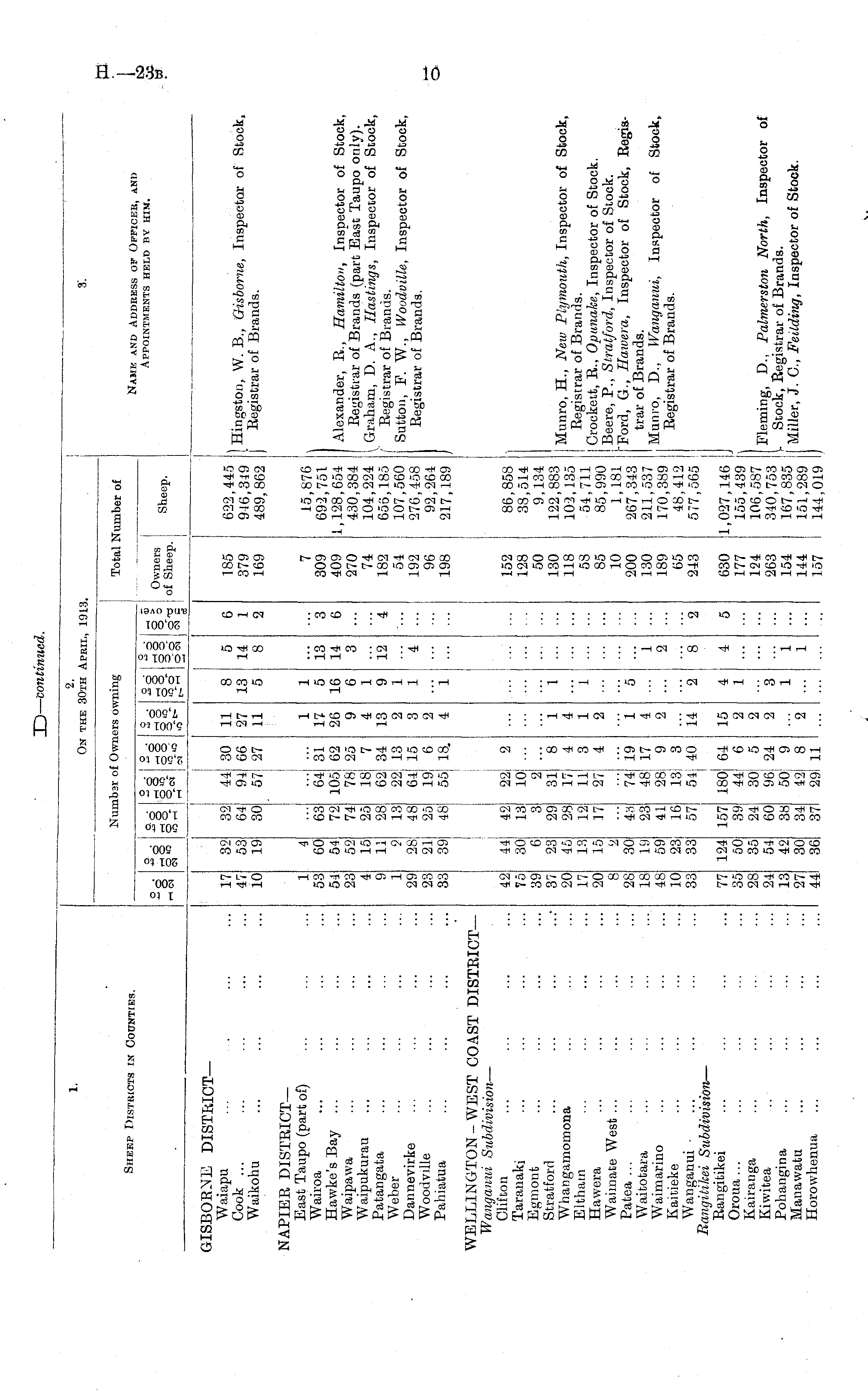 1. 2. On the 30th April, 1913. 3. Sheep Districts in Counties. Number of Owners owning Total Number of Name and Address op Officer, and Appointments held by him. 2d O O CM LO rH tH O o " d •t o o o CM o ISo ■H ° iO O t-TrH " d o est CM S cS Owners of Sheep. Sheep. GISBORNE DISTRICT— Waiapu Cook ... Waikohu 17 ■47 10 32 53 19 32 64 30 44 94 57 30 66 27 11 27 11 8 13 5 5 14 8 6 1 2 185 379 169 622,445 946,319 489, 862 [Hingston, W. B., Gisborne, Inspector of Stock, j" Eegistrar of Brands. NAPIEE DISTRICT— East Taupo (part of) Wairoa Hawke's Bay Waipawa W T aipukurau Patangata Weber Dannevirke Woodville Pahiatua 1 53 54 23 4 9 1 29 23 33 4 60 54 52 15 11 2 28 21 39 63 72 74 25 28 13 48 25 48 64 31 105 62 78 25 18 7 62 34 22 13 64 15 19 6 55 18. 1 17 26 9 4 13 2 3 2 4 1 5 16 6 1 9 1 1 13 14 3 12 3 6 4 7 309 409 270 74 182 54 192 96 198 15,876 692,751 1,128,654 430,384 104,224 655,185 107,560 276,458 92,264 217,189 Alexander, E., Hamilton, Inspector of Stock, Eegistrar of Brands (part East Taupo only). \ Graham, D. A., Hastings, Inspector of Stock, Registrar of Brands. Sutton, F. W., Woodville, Inspector of Stock, Registrar of Brands. 4 1 WELLINGTON - WEST COAST DISTRICT— Wanganui Subdivision — Clifton Taranaki ... ... Egmont Stratford Whangamoinona Eltham Hawera Waiinate West ... Patea ... Waitotara Waimarino Kaitieke Wanganui ■ Bangitikei Subdivision — Eangitikei Oroua... Kairanga Kiwitea ... Pohangina Manawatu Horowhenua 42 75 39 37 20 17 20 8 28 18 48 10 33 44 30 23 45 13 15 30 19 59 23 33 42 13 29 28 12 .17 43 23 41 16 57 22 2 10 ... 2 ... 31 8 17 4 11 3 27 4 74 19 48 17 28 9 13 3 54j 40 1 4 1 2 1 4 2 i i "5 1 2 152 128 50 130 118 53 85 10 200 130 189 65 243 86,858 38,514 9,134 122,883 102,135 54,711 85,990 1,181 267,343 211,537 170,389 48,412 577,565 Munro, H., New Plymouth, Inspector of Stock, Registrar of Brands. Crockett, R., Opunake, Inspector of Stock. Beere, P., Stratford, Inspector of Stock. "Ford, G., Hawera, Inspector of Stock, Registrar of Brands. Munro, D., Wanganui, Inspector of Stock, Registrar of Brands. 14 2 "8 "2 77 35 28 24 13 27 44 124 50 35 54 42 30 36 157 39 24 60 38 34 37 180 64 44 6 30 5 96 24 50 9 42 8 29 11 15 2 2 2 4 1 4 5 630 177 124 263 154 144 157 1,027,146 155,439 106,587 310,753 167,835 151,289 144,019 Fleming, D., Palmerston North, Inspector of - Stock, Registrar of Brands. I Miller, J. C, Feilding, Inspector of Stock. 3 1 i 1 2
