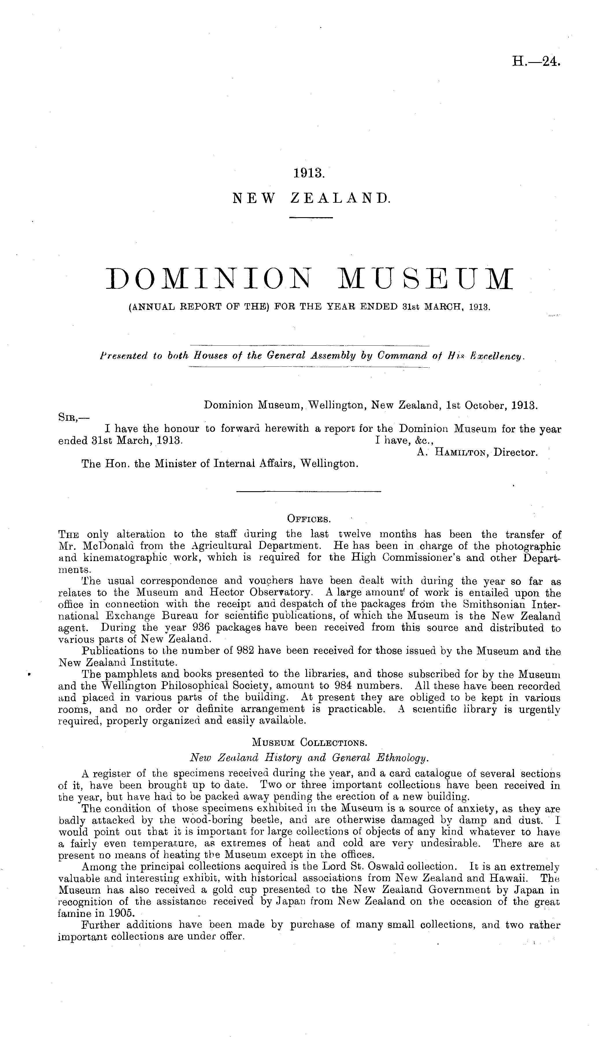 Dominion Museum, Wellington, New Zealand, Ist October, 1913. Sir, — I have the honour to forward herewith a report for the Dominion Museum for the year ended 31st March, 1913. I have, &c, A. Hamilton, Director. The Hon. the Minister of Internal Affairs, Wellington.