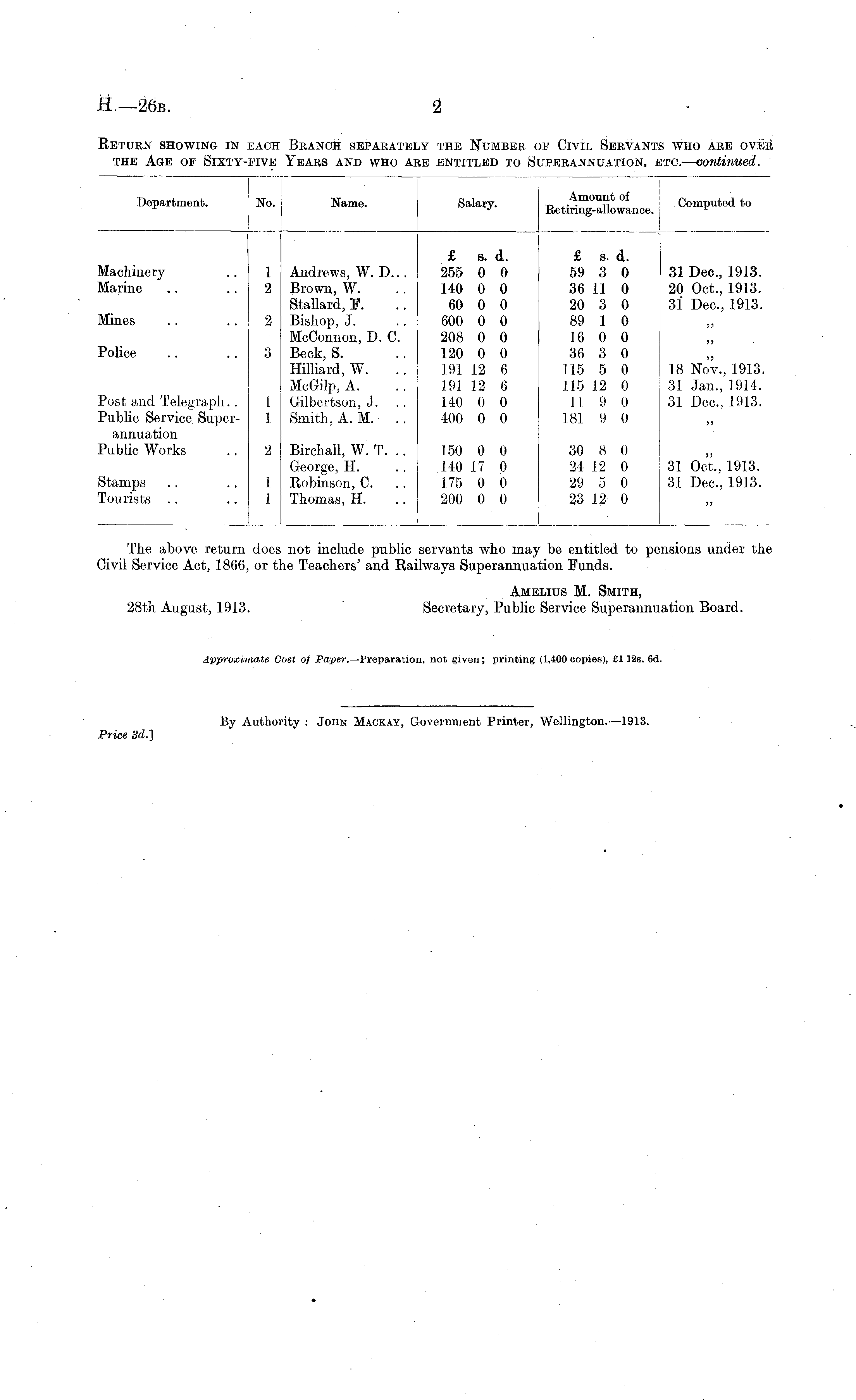The above return does not include public servants who may be entitled to pensions under the Civil Service Act, 1866, or the Teachers' and Railways Superannuation Funds. Amelius M. Smith, 28th August, 1913. Secretary, Public Service Superannuation Board.