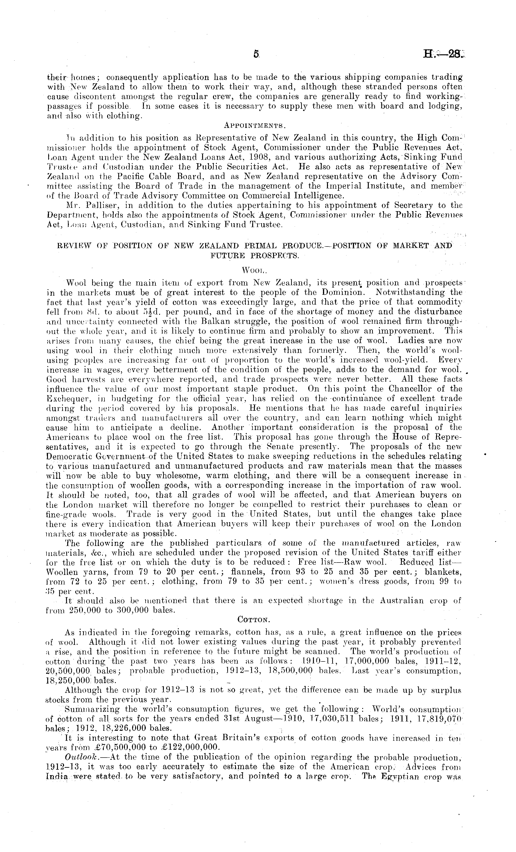 their homes ; consequently application has to be made to the various shipping companies trading with New Zealand to allow them to work their way, and, although these stranded persons often cause discontent amongst the regular crew, the companies are generally ready to find workingpassages if possible In some cases it is necessary to supply these men with board and lodging, and also with clothing. Appointments. In addition to his position as Representative of New Zealand in this country, the High Commissioner holds the appointment of Stock Agent, Commissioner under the Public Revenues Act, Loan Agent under the New Zealand Loans Act, 1908, and various authorizing Acts, Sinking Fund Trustee and Custodian under the Public Securities Act. He also acts as representative of New Zealand on the Pacific Cable Board, and as New Zealand representative on the Advisory Committee assisting the Board of Trade in the management of the Imperial Institute, and member of the Board of Trade Advisory Committee on Commercial Intelligence. Mi-. Palliser, in addition to the duties appertaining to his appointment of Secretary to the Department, holds also the appointments of Stock Agent, Commissioner under the Public Revenues Act, Loan Agent, Custodian, and Sinking Fund Trustee. REVIEW OK POSITION OF NEW ZEALAND PRIMAL PRODUCE.- POSITION OP MARKET AND FUTURE PROSPECTS. Wool.. Wool being the main item of export from New Zealand, its present position and prospects in the markets must be of great interest to the people of the Dominion. Notwithstanding the fact that last year's yield of cotton was exceedingly large, and that the price of that commodity fell from Bd. to about .">|d. per pound, and in face of the shortage of money and the disturbance and uncertainty connected with the Balkan struggle, the position of wool remained firm throughout the whole year, and it is likely to continue firm and probably to show an improvement. This arises from many causes, the chief being the great increase in the use of wool. Ladies -are now using wool in their clothing much more extensively than, formerly. Then, the world's woolusing peoples are increasing far out of proportion to the world's increased wool-yield. Every increase in. wages, every betterment of the condition of the people, adds to the demand for wool. Good harvests are everywhere reported, and trade prospects were never better. All these facts influence the value of our most important staple product. On this point the Chancellor of the Exchequer, in budgeting for the official year, has relied on the-continuance of excellent trade during the period covered by his proposals. He mentions that he has made careful inquiries amongst traders and manufacturers all over the country, and can learn nothing which might cause him to anticipate a decline. Another important consideration is the proposal of the Americans to place wool on the free list. This proposal has gone through the House of Representatives, and it is expected to go through the Senate presently. The proposals of the new Democratic Government of the United States to make sweeping reductions in the schedules relating to various manufactured and unmanufactured products and raw materials mean that the masses will now be able to buy wholesome, warm clothing, and there will be a consequent increase in the consumption of woollen goods, with a corresponding increase in the importation of raw wool. It should be noted, too, that all grades of wool will be affected, and that American buyers on the London market will therefore no longer be compelled to restrict their purchases to clean or fine-grade wools. Trade is very good in the United States, but until the changes take place there is every indication that American buyers will keep their purchases of wool on the London market as moderate as possible. The following are the published particulars of some of the manufactured articles, raw materials, <fee, which are scheduled under the proposed revision of the United States tariff either for the free list or on which the duty is to be reduced : Free list—Raw wool. Reduced listWoollen yarns, from 79 to 20 per cent.; flannels, from 93 to 25 and 35 per cent.; blankets, from 72 to 25 per cent. ; clothing, from 79 to 35 per cent. ; women's dress goods, from 99 to 35 per cent. It should also be mentioned that there is an expected shortage in the Australian crop of from 250,000 to 300,000 bales. Cotton. As indicated in the foregoing remarks, cotton has, as a rule, a great influence on the prices of wool. Although it did not lower existing values during the past year, it probably prevented ;i rise, and the position in reference to the future might be scanned. The world's production of cotton during "the past two years has been as follows: 1910-11, 17,000,000 bales, 1911-12, 20,500,000 bales; probable production, 1912-13, 18,500,000 bales. Last year's consumption, 18,250,000 bales. Although the crop for 1912-13 is not so great, yet the difference can be made up by surplus stocks from the previous year. Summarizing the world's consumption figures, we get the following : World's consumption of cotton of all sorts for the years ended 31st August—l9lo, 17,030,511 bales; 1911, 17,819,070 bales; 1912, 18,226,000 bales'. It is interesting to note that Great Britain's exports of cotton goods have increased in ten years from £70,500,000 to £122,000,000. Outlook. —At the time of the publication of the opinion regarding the probable production, 1912-13, it was too early accurately to estimate the size of the American crop. Advices from India were stated to be very satisfactory, and pointed to a large crop. The Egyptian crop was