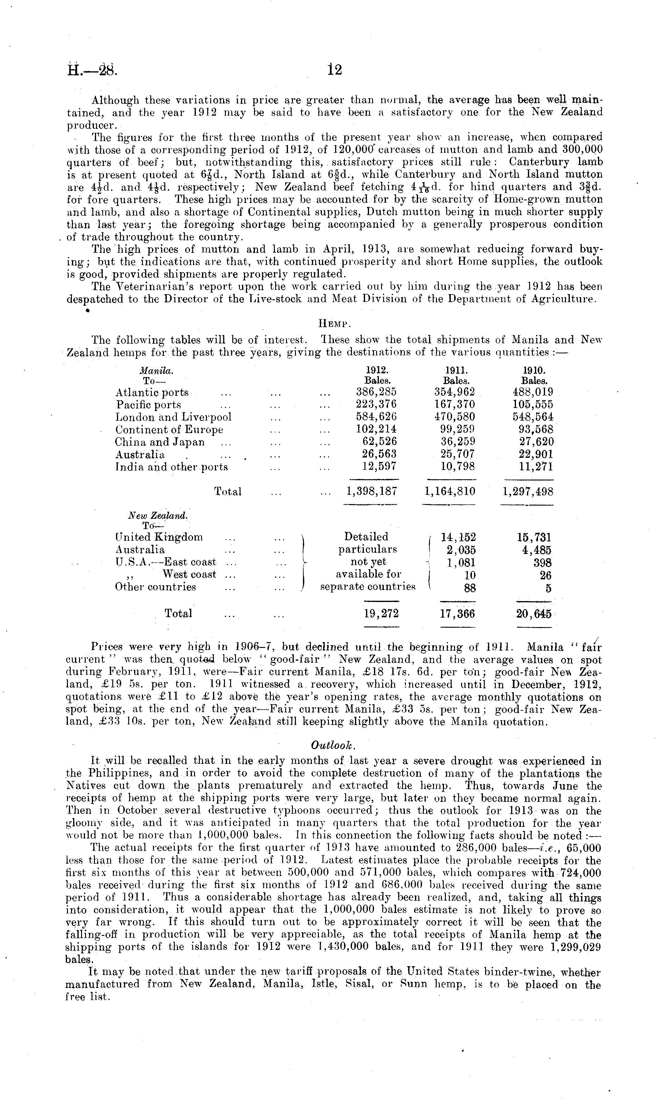 Although these variations in price are greater than normal, the average has been well maintained, and the year 1912 may be said to have been a satisfactory one for the New Zealand producer. The figures for the first three months of the present year show an increase, when compared with those of a corresponding period of 1912, of 120,000' carcases of mutton and lamb and 300,000 quarters of beef; but, notwithstanding this, satisfactory prices still rule: Canterbury lamb is at present quoted at 6|d., North Island at 6§d., while Canterbury and North Island mutton are 4|d. and 4Jd. respectively; Neyv Zealand beef fetching 4 J J j t '- ' or hind quarters and 3§d. for fore quarters. These high prices may be accounted for by the scarcity of Home-grown mutton and lamb, and also a shortage of Continental supplies, Dutch mutton being in much shorter supply than last year; the foregoing shortage being accompanied by a generally prosperous condition of trade throughout the country. The high prices of mutton and lamb in April, 1913, are somewhat reducing forward buying; but the indications are that, with continued prosperity and short Home supplies, the outlook is good, provided shipments are properly regulated. The Veterinarian's report upon the work carried out by him during the year 1912 has been despatched to the Director of the Live-stock and Meat Division of the Department of Agriculture. « Hemp. The following tables will be of interest. Ihese shoyv the total shipments of Manila and New Zealand hemps for the past three years, giving the destinations of the various quantities :— Manila. 1912. 1911. 1910. To— Bales. Bales. Bales. Atlantic ports ... ... ... 386,285 354,962 488,019 Pacific ports ... ... ... 223,376 167,370 105,555 London and Liverpool ... ... 584,626 470,580 548,564 Continent of Europe ... ... 102,214 99,259 93,568 China and Japan ... ... ... 62,526 36,259 27,620 Australia ... . ... ... 26,563 25,707 22,901 India and other ports ... ... 12,597 10,798 11,271 Total ... ... 1,398,187 1,164,810 1,297,498 New Zealand. ToUnited Kingdom ... ... \ Detailed i 14,152 15,731 Australia ... ... particulars j 2,035 4,485 U.S.A. —East coast ... ... [ not yet 4 1,081 398 ~ West coast ... ... I available for 10 26 Other countries ... ... ,' separate countries \ 88 5 Total ... ... 19,272 17,366 20,645 Prices were very high in 1906-7, but declined until the beginning of 1911. Manila " fair current " was then quoted below " good-fair " New Zealand, and the average values on spot during February, 1911, were —Fair current Manila, £18 17s. 6d. per ton; good-fair New Zealand, £19 ss. per ton. 1911 witnessed a recovery, yvhich increased until in December, 1912, quotations, were £11 to £12 above the year's opening rates, the average monthly quotations on spot being, at the end of the year —Fair current Manila, £33 ss. per ton; good-fair New Zealand, £33 10s. per ton, New Zealand still keeping slightly above the Manila quotation. Outlook. It will be recalled that in the early months of last year a severe drought was experienced in the Philippines, and in order to avoid the complete destruction of many of the plantations the Natives cut down the plants prematurely and extracted the hemp. Thus, toyvards June the receipts of hemp at the shipping ports were very large, but later on they became normal again. Then in October several destructive typhoons occurred; thus the outlook for 1913 was on the gloomy side, and it was anticipated in many quarters that the total production for the year would not be more than 1,000,000 bales. In this connection the following facts should be noted : — The actual receipts for the first quarter of 1.913 have amounted to 286,000 bales — i.e., 65,000 less than those for the same period of 1912. Latest estimates place the probable receipts for the first six months of this year at between 500,000 and 571,000 bales, which compares with 724,000 bales received during the first six months of 1912 and 686,000 bales received during the same period of 1911. Thus a considerable shortage has already been realized, and, taking all things into consideration, it would appear that the 1,000,000 bales estimate is not likely to prove so very far wrong. If this should turn out to be approximately correct it will be seen that the falling-off in production will be very appreciable, as the total receipts of Manila hemp at the shipping ports of the islands for 1912 were 1,430,000 bales, and for 1911 they yvere 1,299,029 bales. It may be noted.that under the new tariff proposals of the United States binder-twine, whether manufactured from New Zealand, Manila, Istle, Sisal, or Sunn hemp, is to be placed on the free list.