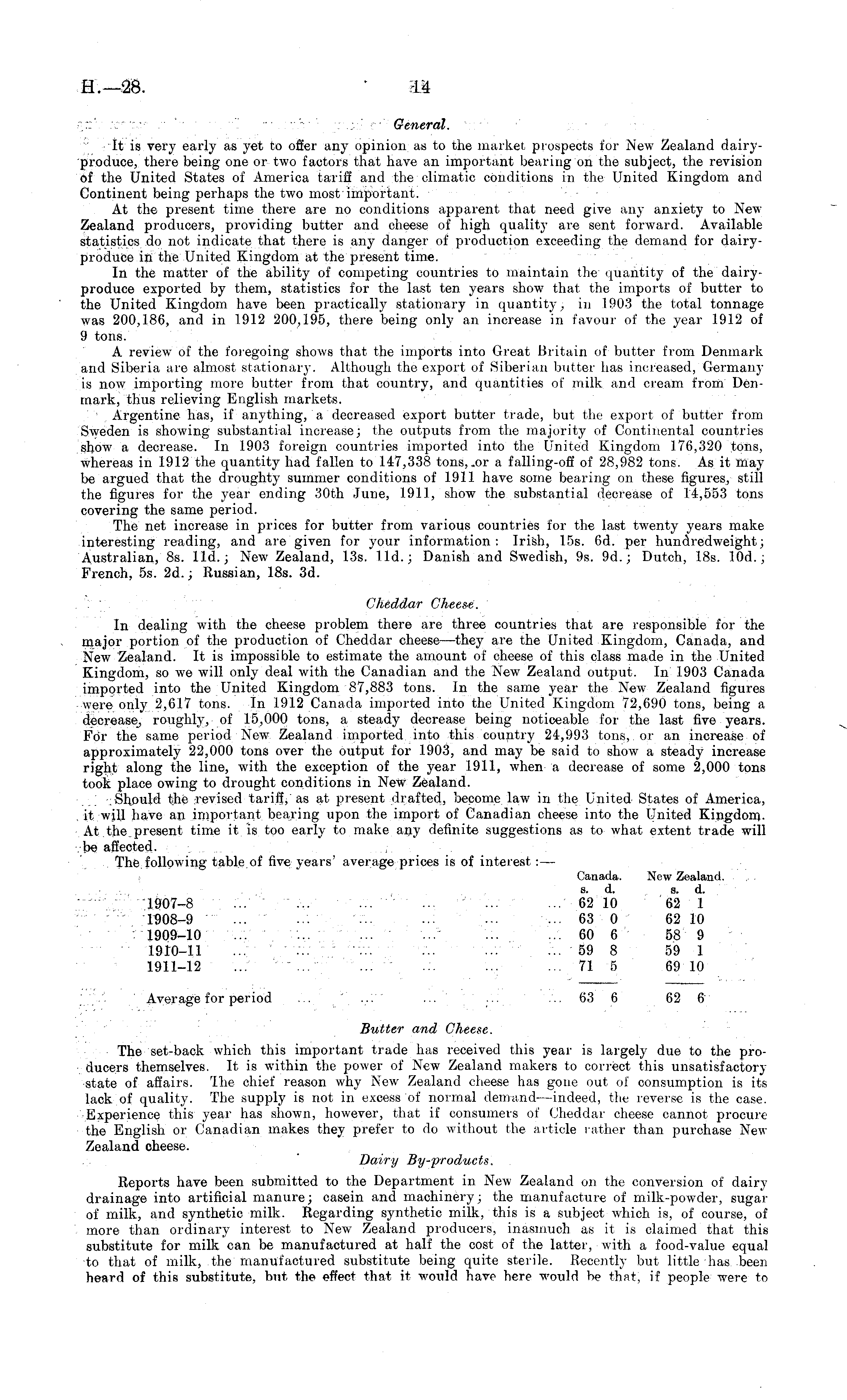 General. It is very early as yet to offer any opinion as to the market prospects for New Zealand dairyproduce, there being one or two factors that have an important bearing on the subject, the revision of the United States of America tariff and the climatic conditions in the United Kingdom and Continent being perhaps the two most important. At the present time there are no conditions apparent that need give any anxiety to NewZealand producers, providing butter and cheese of high quality are sent forward. Available statistics do not indicate that there is any danger of production exceeding the demand for dairyproduce in the United Kingdom at the present time. In the matter of the ability of competing countries to maintain the quantity of the dairyproduce exported by them, statistics for the last ten years show that the imports of butter to the United Kingdom have been practically stationary in quantity, in 1903 the total tonnage was 200,186, and in 1912 200,195, there being only an increase in favour of the year 1912 of 9 tons. A review of the foregoing shows that the imports into Great Britain of butter from Denmark and Siberia are almost stationary. Although the export of Siberian butter has increased, Germany is noyv importing more butter from that country, and quantities of milk and cream from Denmark, thus relieving English markets. Argentine has, if anything,' a decreased export butter trade, but the export of butter from Svyeden is showing substantial increase; the outputs from the majority of Continental countries show a decrease. In 1903 foreign countries imported into the United Kingdom 176,320 tons, whereas in 1912 the quantity had fallen to 147,338 tons, ..or a falling-off of 28,982 tons. As it maybe argued that the droughty summer conditions of 1911 have some bearing on these figures, still the figures for the year ending 30th June, 1911, show the substantial decrease of 14,553 tons covering the same period. The net increase in prices for butter from various countries for the last twenty years make interesting reading, and are given for your information: Irish, 15s. 6d. per hundredweight; Australian, Bs. lid.; New Zealand, 13s. lid.; Danish and Swedish, 9s. 9d.; Dutch, 18s. lOd.; French, ss. 2d.; Russian, 18s. 3d. Cheddar Cheese. In dealing with the cheese problem there are three countries that are responsible for the major portion of the production of Cheddar cheese—they are the United Kingdom, Canada, and New Zealand. It is impossible to estimate the amount of cheese of this class made in the United Kingdom, so we will only deal with the Canadian and the New Zealand output. In 1903 Canada imported into the United Kingdom 87,883 tons. In the same year the New Zealand figures were only 2,617 tons. In 1912 Canada imported into the United Kingdom 72,690 tons, being a decrease, roughly, of 15,000 tons, a steady decrease being noticeable for the last five years. For the same period New Zealand imported into this country 24,993 tons, or an increase of approximately 22,000 tons over the output for 1903, and may be said to show a steady increase right along the line, with the exception of the year 1911, when a decrease of some 2,000 tons took place owing to drought conditions in New Zealand. ..:.; Should the revised tariff, as at present drafted, become law in the United States of America, it will have an important bearing upon the import of Canadian cheese into the United Kingdoni. At the.present time it is too early to make any definite suggestions as to what extent trade will be affected. The following table of five years' average prices is of interest: — Canada. New Zealand. s. d. s. d. ' 1907-8 ... "... ... ... ... ... 62 10 62 1 1908-9 ... ... .. ... ... ... 63 0 62 10 1909-10 ... ... ../ ... ... 60 6 58 9 1910-11 ... ' ... " ... ... ... ... 59 8 59 1 1911-12 ... ' ... ... ... ... 71 5 69 10 Average for period ... ' ... ... ... ... 63 6 62 6 ' Butter and Cheese. The set-back which this important trade has received this year is largely due to the producers themselves. It is within the power of New Zealand makers to correct this unsatisfactory state of affairs. Ihe chief reason why New Zealand cheese has gone out of consumption is its lack of quality. The supply is not in excess of normal demand—indeed, the reverse is the case. ■Experience this year has shown, however, that if consumers of Cheddar cheese cannot procure the English or Canadian makes they prefer to do without the article rather than purchase New Zealand cheese. Dairy By-products. Reports have been submitted to the Department in New Zealand on the conversion of dairy drainage into artificial manure; casein and machinery; the manufacture of milk-poyvder, sugar of milk, and synthetic milk. Regarding synthetic milk, this is a subject which is, of course, of more than ordinary interest to New Zealand producers, inasmuch as it is claimed that this substitute for milk can be manufactured at half the cost of the latter, with a food-value equal to that of milk, the manufactured substitute being quite sterile. Recently but little has been heard of this substitute, hut. th© effect that it would have here would be that, if people were to