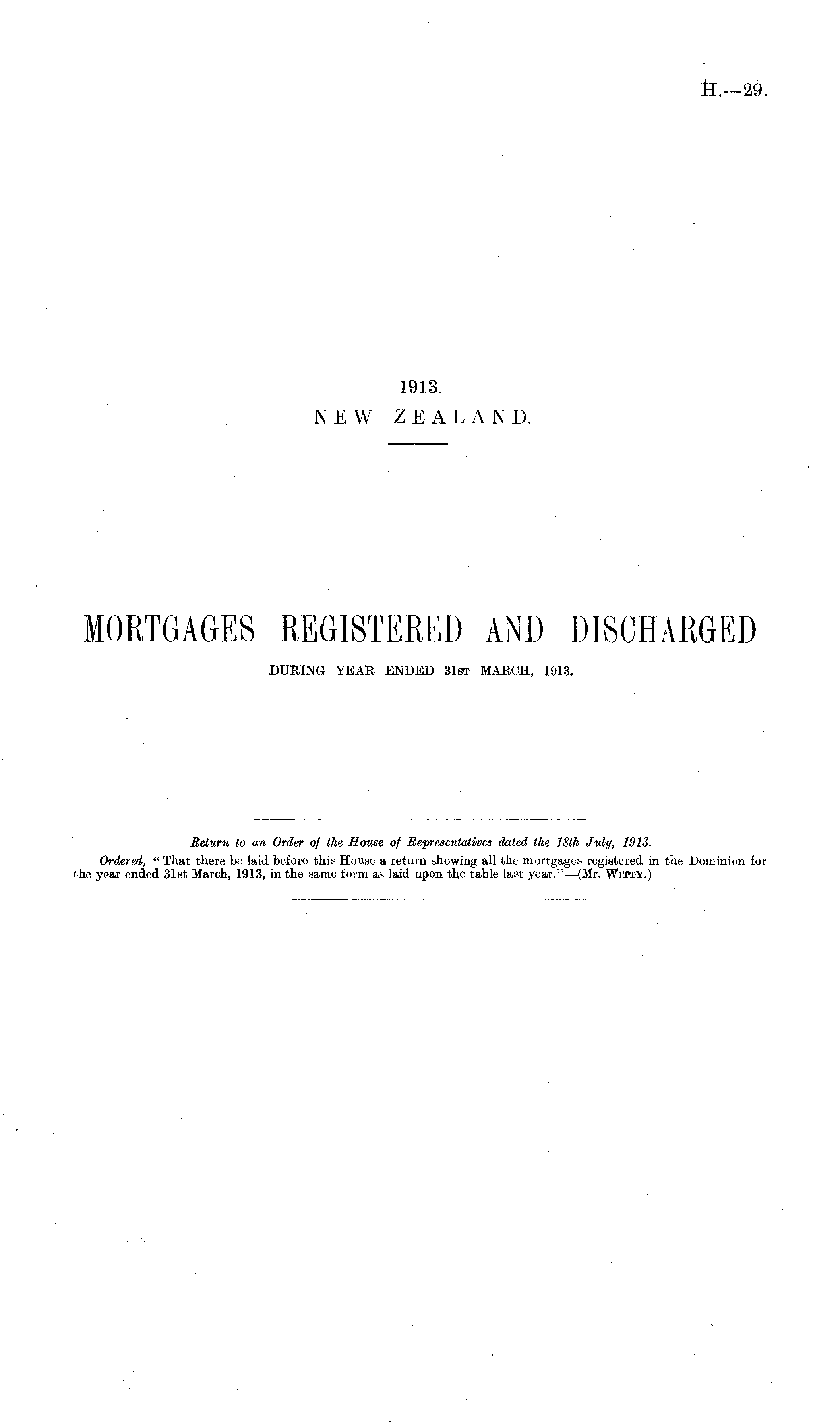 Return to an Order of the House of Representatives dated the 18th July, 1913. Ordered, "That there be laid before this House a return showing all the mortgages registered in the Dominion for the year ended 31st March, 1913, in the same form as laid upon the table last year."—(Mr. Witty.)