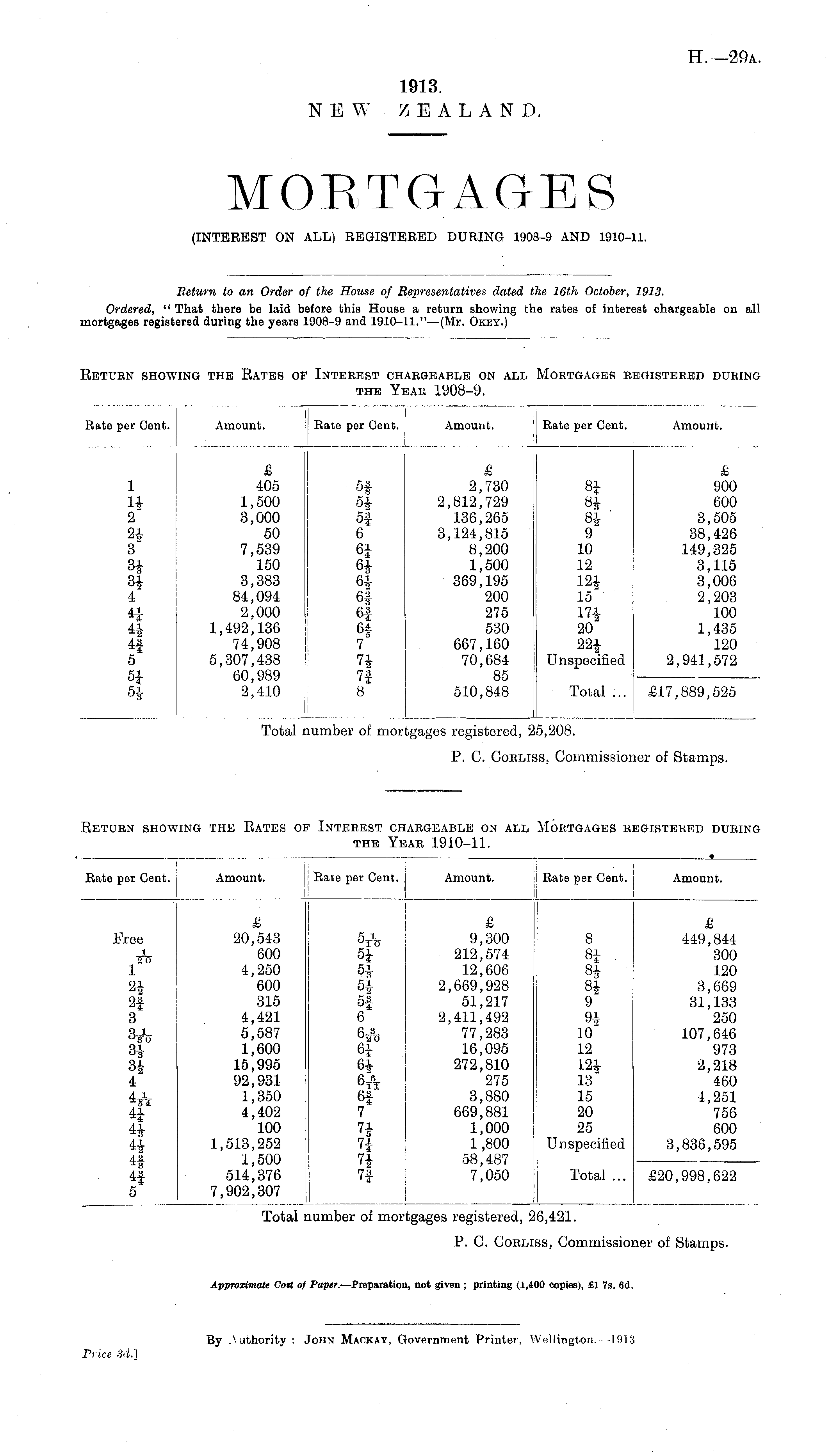 Return to an Order of the House of Representatives dated the 16th October, 1913. Ordered, " That there be laid before this House a return showing the rates of interest chargeable on all mortgages registered during the years 1908-9 and 1910-11." —(Mr. Okey.)