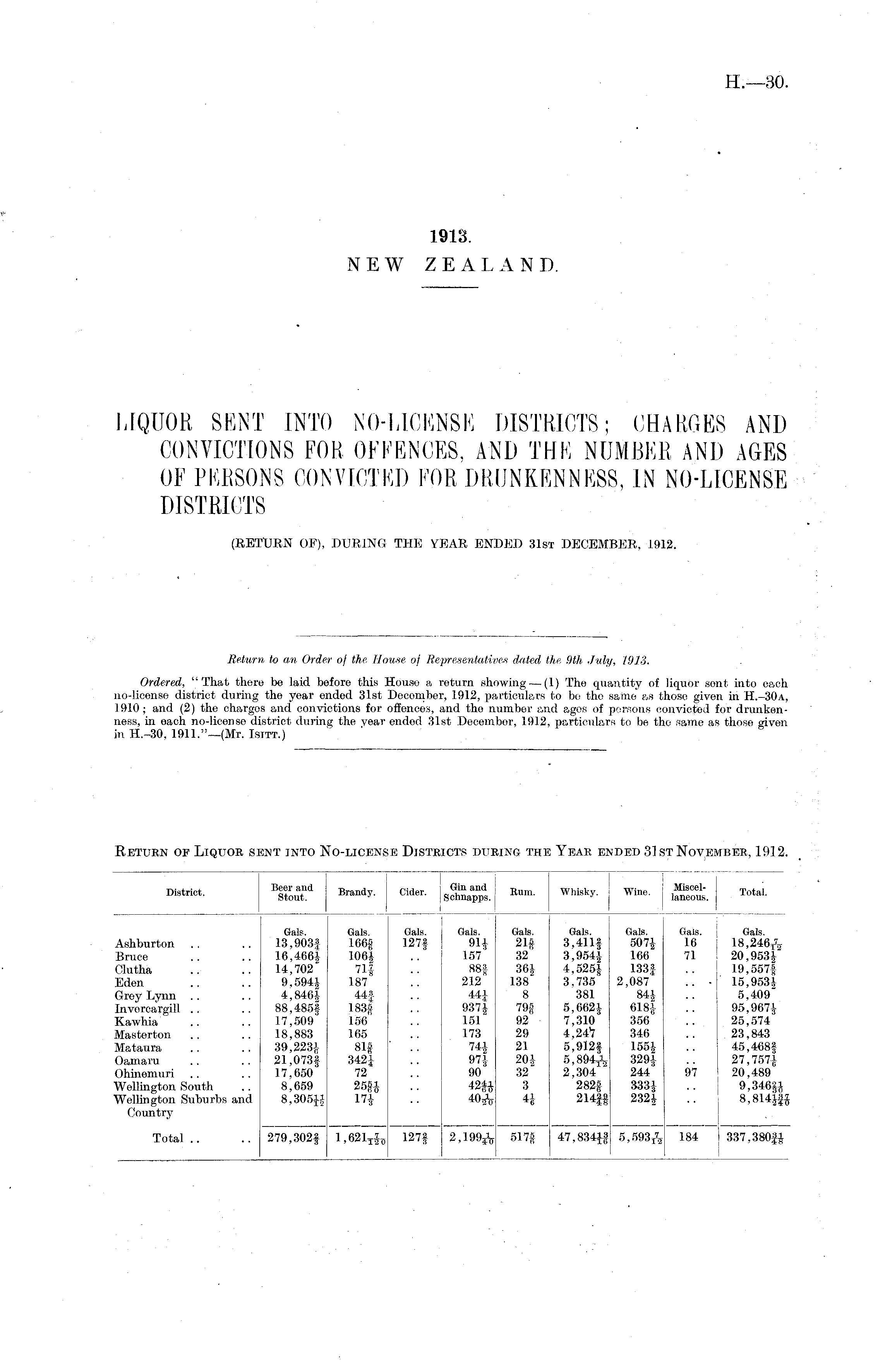 Return to an Order 0/ the House of Representatives dated the 9th July, 1913. Ordered, "That there be laid before this House a return showing — (1) The quantity of liquor sont into each no-license district during the year ended 31st December, 1912, particulars to bo the satno as those given in H.-30A, 1910; and (2) the charges and convictions for offences, and the number and ages of porsons convicted for drunkenness, in each no-license district during the year ended 31st Decembor, 1912, particulars to be the same as those given in H.-30, 1911."—(Mr. Isitt.)