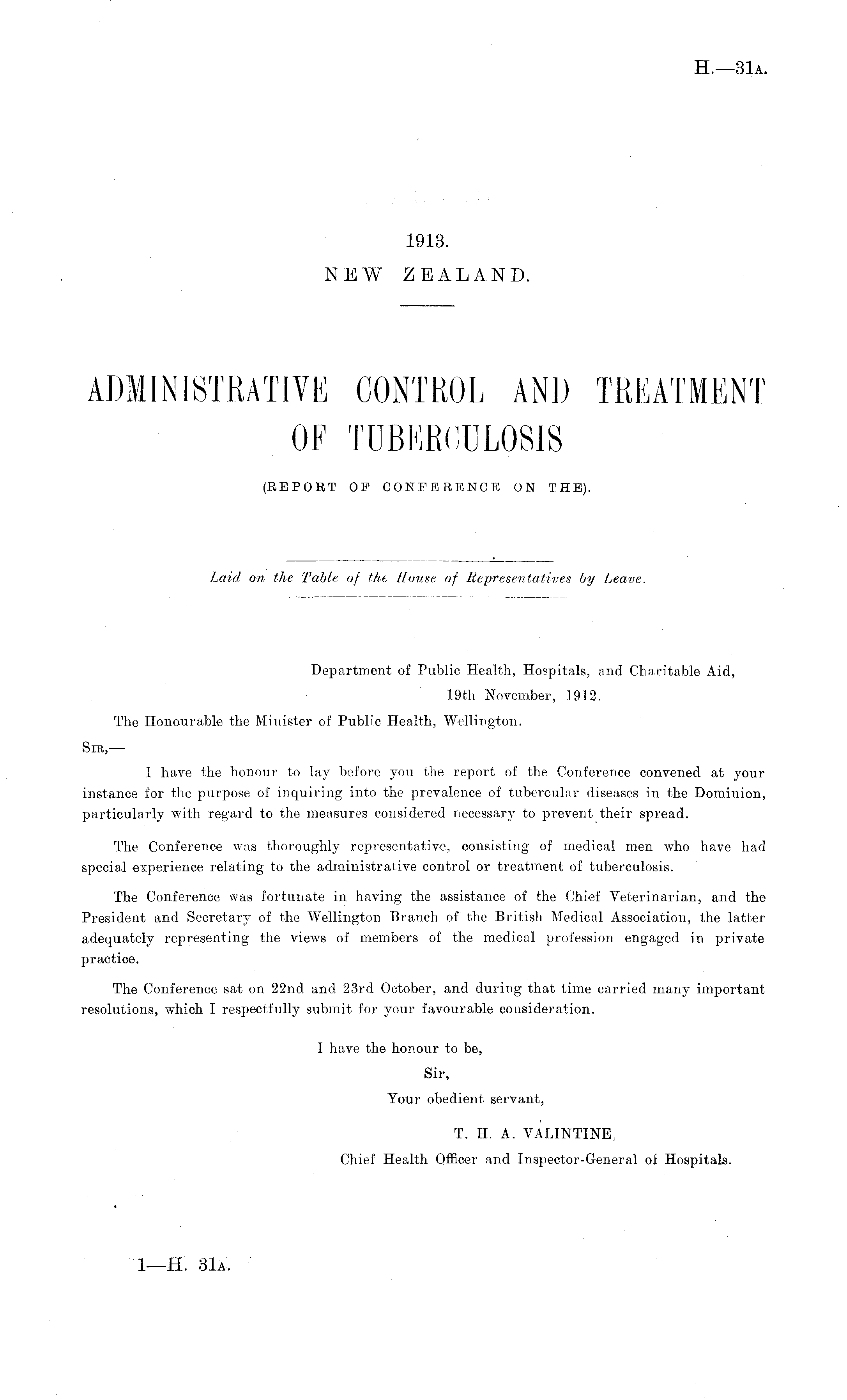 Department of Public Health, Hospitals, and Charitable Aid, 19th November, 1912. The Honourable the Minister of Public Health, Wellington. Sir,— I have the honour to lay before you the report of the Conference convened at your instance for the purpose of inquiring into the prevalence of tubercular diseases in the Dominion, particularly with regard to the measures considered necessary to prevent their spread. The Conference was thoroughly representative, consisting of medical men who have had special experience relating to the administrative control or treatment of tuberculosis. The Conference was fortunate in having the assistance of the Chief Veterinarian, and the President and Secretary of the Wellington Branch of the British Medical Association, the latter adequately representing the views of members of the medical profession engaged in private practice. The Conference sat on 22nd and 23rd October, and during that time carried many important resolutions, which I respectfully submit for your favourable consideration. I have the honour to be, Sir, Your obedient servant, T. H. A. VALINTINE, Chief Health Officer and Inspector-General of Hospitals.