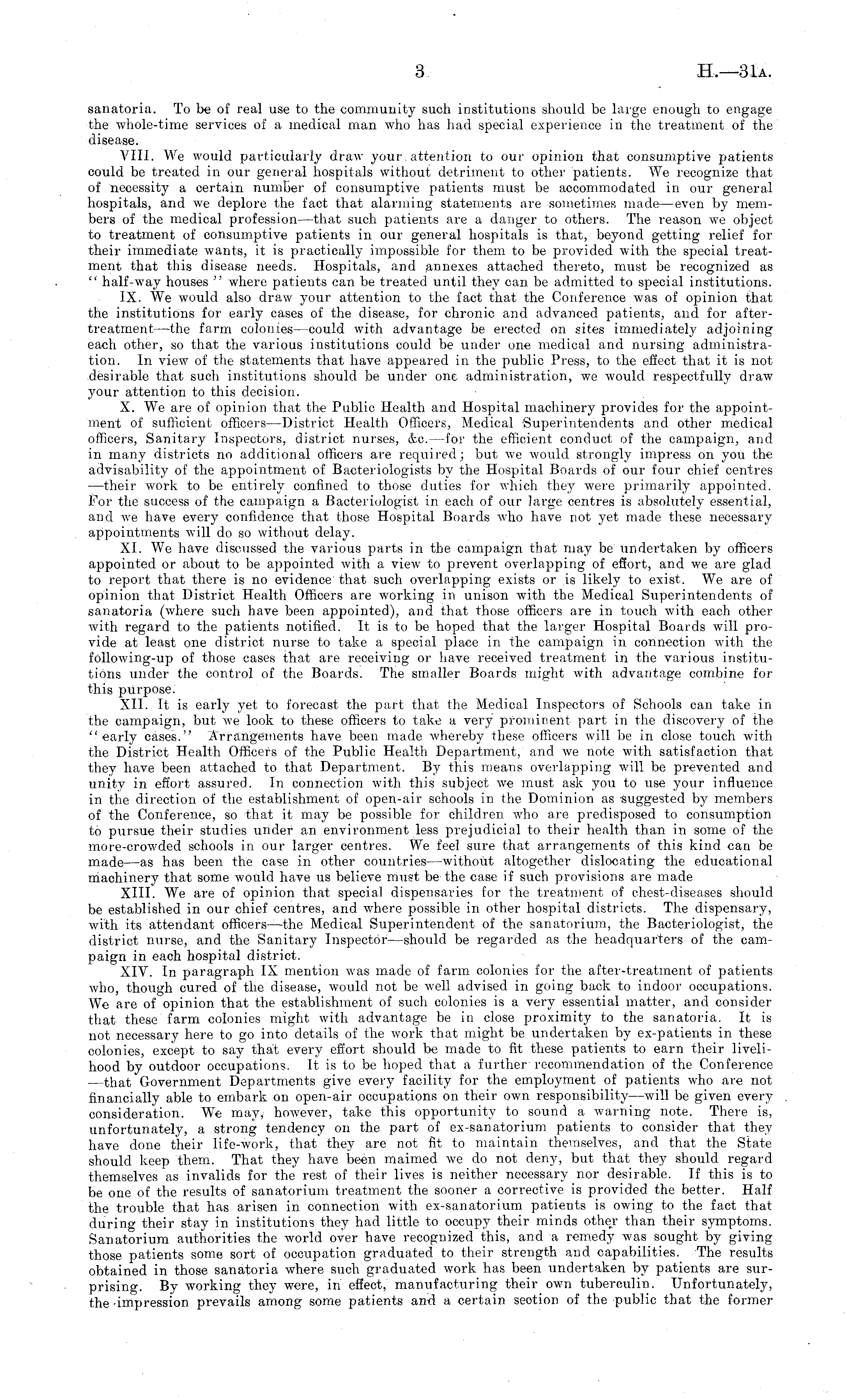 sanatoria. To be of real use to the community such institutions should be large enough to engage the whole-time services of a medical man who has had special experience in the treatment of the disease. VIII. We would particularly draw your, attention to our opinion that consumptive patients could be treated in our general hospitals without detriment to other patients. We recognize that of necessity a certain number of consumptive patients must be accommodated in our general hospitals, and we deplore the fact that alarming statements are sometimes made—even by members of the medical profession —that such patients are a danger to others. The reason we object to treatment of consumptive patients in our general hospitals is that, beyond getting relief for their immediate wants, it is practically impossible for them to be provided with the special treatment that this disease needs. Hospitals, and annexes attached thereto, must be recognized as " half-way houses " where patients can be treated until they can. be admitted to special institutions. IX. We would also draw your attention to the fact that the Conference was of opinion that the institutions for early cases of the disease, for chronic and advanced patients, and for aftertreatment —the farm colonies —could with advantage be erected on sites immediately adjoining each other, so that the various institutions could be under one medical and nursing administration. In view of the statements that have appeared in the public Press, to the effect that it is not desirable that such institutions should be under one administration, we would respectfully draw your attention to this decision. X. We are of opinion that the Public Health and Hospital machinery provides for the appointment of sufficient officers —District Health Officers, Medical Superintendents and other medical officers, Sanitary Inspectors, district nurses, &c. —for the efficient conduct of the campaign, and in many districts no additional officers are required; but we would strongly impress on you the advisability of the appointment of Bacteriologists by the Hospital Boards of our four chief centres —their work to be entirely confined to those duties for which they were primarily appointed. For the success of the campaign a Bacteriologist in each of our large centres is absolutely essential, and we have every confidence that those Hospital Boards who have not yet made these necessary appointments will do so without delay. XI. We have discussed the various parts in the campaign that may be undertaken by officers appointed or about to be appointed with a view to prevent overlapping of effort, and we are glad to report that there is no evidence that such overlapping exists or is likely to exist. We are of opinion that District Health Officers are working in unison with the Medical Superintendents of sanatoria (where such have been appointed), and that those officers are in touch with each other with regard to the patients notified. It is to be hoped that the larger Hospital Boards will provide at least one district nurse to take a special place in the campaign in connection with the following-up of those cases that are receiving or have received treatment in the various institutions under the control of the Boards. The smaller Boards might with advantage combine for this purpose. XII. It is early yet to forecast the part that the Medical Inspectors of Schools can take in the campaign, but we look to these officers to take a very prominent part in the discovery of the "early cases." Arrangements have been made whereby these officers will be in close touch with the District Health Officers of the Public Health Department, and we note with satisfaction that they have been attached to that Department. By this means overlapping will be prevented and unity in effort assured. In connection with this subject we must ask you to use your influence in the direction of the establishment of open-air schools in the Dominion as suggested by members of the Conference, so that it may be possible for children who are predisposed to consumption to pursue their studies under an environment less prejudicial to their health than in some of the more-crowded schools in our larger centres. We feel sure that arrangements of this kind can be made —as has been the case in other countries—without altogether dislocating the educational machinery that some would have us believe must be the case if such provisions are made XIII. We are of opinion that special dispensaries for the treatment of chest-diseases should be established in our chief centres, and where possible in other hospital districts. The dispensary, with its attendant officers —the Medical Superintendent of the sanatorium, the Bacteriologist, the district nurse, and the Sanitary Inspector—should be regarded as the headquarters of the campaign in each hospital district. XIV. In paragraph IX mention was made of farm colonies for the after-treatment of patients who, though cured of the disease, would not be well advised in going back to indoor occupations. We are of opinion that the establishment of such colonies is a very essential matter, and consider that these farm colonies might with advantage be in close proximity to the sanatoria. It is not necessary here to go into details of the work that might be undertaken by ex-patients in these colonies, except to say that every effort should be made to fit these patients to earn their livelihood by outdoor occupations. It is to be hoped that a further recommendation of the Conference —that Government Departments give every facility for the employment of patients who are not financially able to embark on open-air occupations on their own responsibility—will be given every consideration. We may, however, take this opportunity to sound a warning note. There is, unfortunately, a strong tendency on the part of ex-sanatorium patients to consider that they have done their life-work, that 