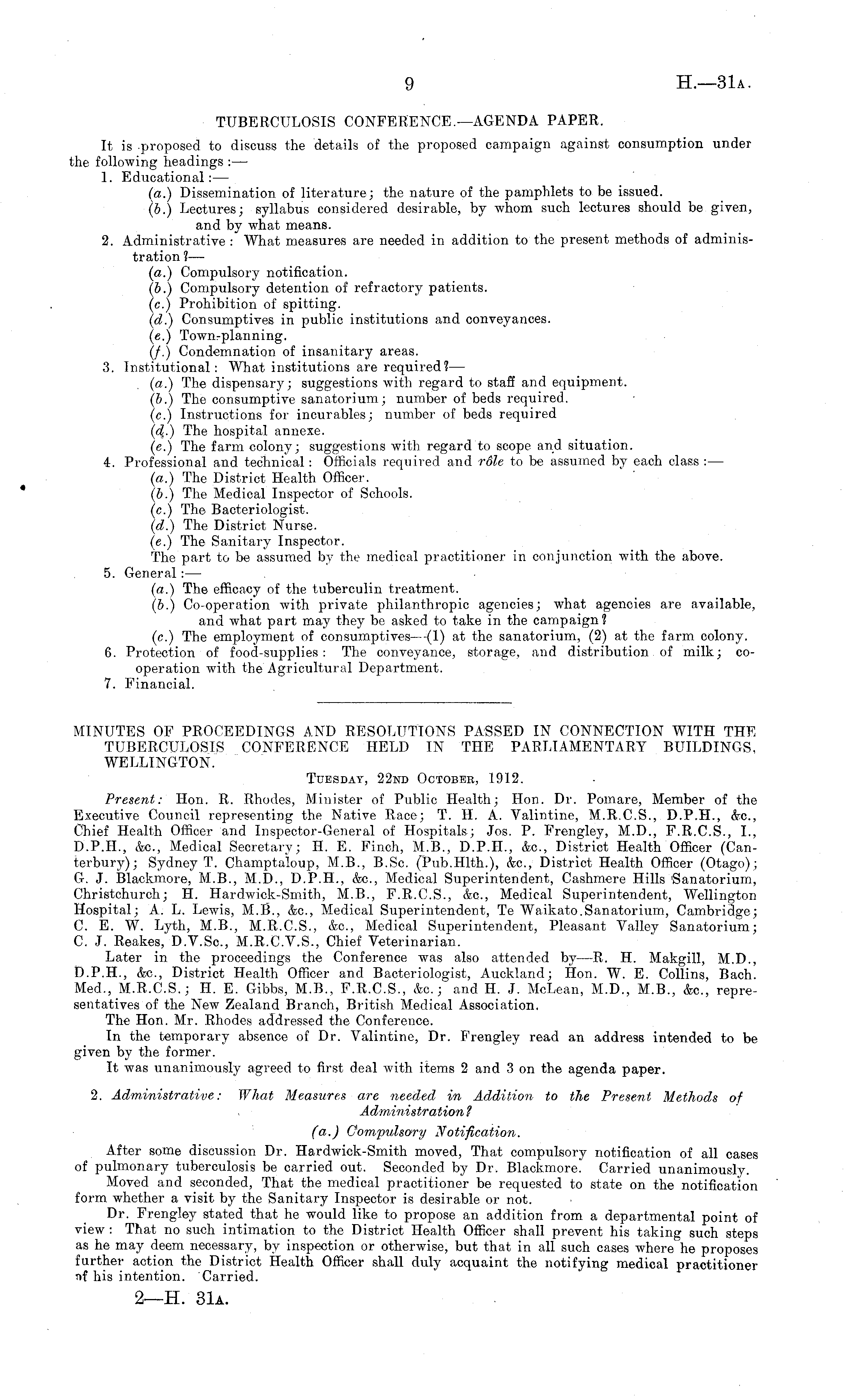 MINUTES OF PROCEEDINGS AND RESOLUTIONS PASSED IN CONNECTION WITH THE TUBERCULOSIS CONFERENCE HELD IN THE PARLIAMENTARY BUILDINGS, WELLINGTON. Tuesday, 22nd October, 1912. Present: Hon. R. Rhodes, Minister of Public Health; Hon. Dr. Pomare, Member of the Executive Council representing the Native Race; T. H. A. Valintine, M.R.C.S., D.P.H., &c, Chief Health Officer and Inspector-General of Hospitals; Jos. P. Frengley, M.D., F.R.C.S., 1., D.P.H., &c, Medical Secretary; H. E. Finch, M.8., D.P.H., &c, District Health Officer (Canterbury); Sydney T. Champtaloup, M.8., B.Sc. (Pub.Hlth.), &c, District Health Officer (Otago); G. J. Blackmore, M.8., M.D., D.P.H., &c, Medical Superintendent, Cashmere Hills Sanatorium, Christchurch; H. Hardwick-Smith, M.8., F.R.C.S., &c, Medical Superintendent, Wellington Hospital; A. L. Lewis, M.8., &c, Medical Superintendent, Te Waikato.Sanatorium, Cambridge; C. E. W. Lyth, M.8., M.R.C.S., &c, Medical Superintendent, Pleasant Valley Sanatorium; C. J. Reakes, D.V.Sc, M.R.C.V.S., Chief Veterinarian. Later in the proceedings the Conference was also attended by—R. H. Makgill, M.D., D.P.H., &c, District Health Officer and Bacteriologist, Auckland; Hon. W. E. Collins, Bach. Med., M.R.C.S.; H. E. Gibbs, M.8., F.R.C.S., &c.; and H. J. McLean, M.D., M.8., &c, representatives of the New Zealand Branch, British Medical Association. The Hon. Mr. Rhodes addressed the Conference. In the temporary absence of Dr. Valintine, Dr. Frengley read an address intended to be given by the former. It was unanimously agreed to first deal with items 2 and 3 on the agenda paper. 2. Administrative: What Measures are needed in Addition to the Present Methods of Administration 1 (a.) Compulsory Notification. After some discussion Dr. Hardwick-Smith moved, That compulsory notification of all cases of pulmonary tuberculosis be carried out. Seconded by Dr. Blackmore. Carried unanimously. Moved and seconded, That the medical practitioner be requested to state on the notification form whether a visit by the Sanitary Inspector is desirable or not. Dr. Frengley stated that he would like to propose an addition from a departmental point of view : That no such intimation to the District Health Officer shall prevent his taking such steps as he may deem necessary, by inspection or otherwise, but that in all such cases where he proposes further action the District Health Officer shall duly acquaint the notifying medical practitioner nf his intention. Carried.