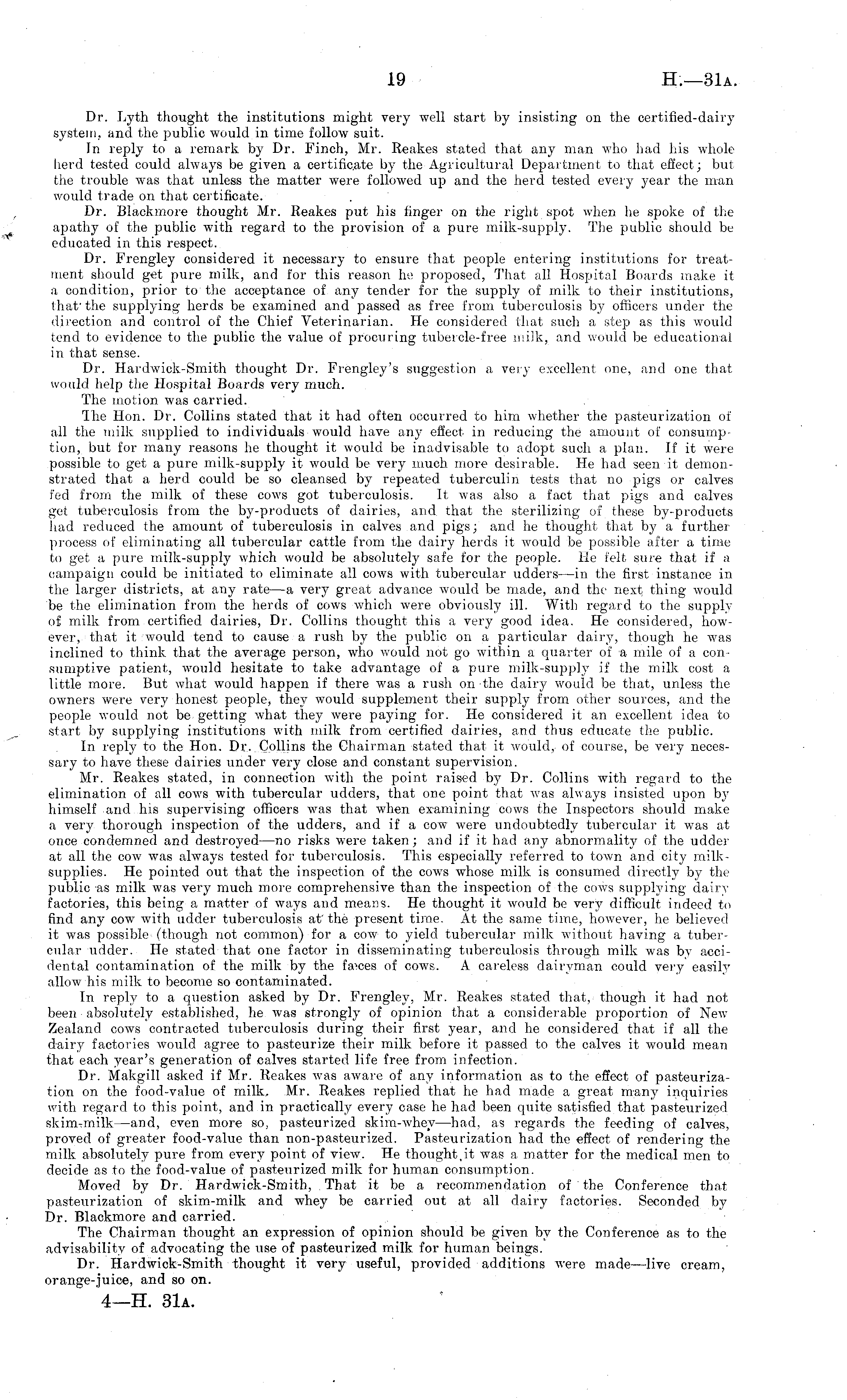 Dr. Lyth thought the institutions might very well start by insisting on the certified-dairy system, and the public would in time follow suit. In reply to a remark by Dr. Finch, Mr. Reakes stated that any man who had his whole herd tested could always be given a certificate by the Agricultural Department to that effect; but tiie trouble was that unless the matter were followed up and the herd tested every year the man would trade on that certificate. Dr. Blackmore thought Mr. Reakes put his finger on the right spot when he spoke of the apathy of the public with regard to the provision of a pure milk-supply. The public should be educated in this respect. Dr. Frengley considered it necessary to ensure that people entering institutions for treatment should get pure milk, and for this reason he proposed, That all Hospital Boards make it a condition, prior to the acceptance of any tender for the supply of milk to their institutions, that'the supplying herds be examined and passed as free from tuberculosis by officers under the direction and control of the Chief Veterinarian. He considered that such a step as this would tend to evidence to the public the value of procuring tubercle-free milk, and would be educational in that sense. Dr. Hardwick-Smith thought Dr. Frengley's suggestion a very excellent one, and one that would help the Hospital Boards very much. The motion was carried. The Hon. Dr. Collins stated that it had often occurred to him whether the pasteurization of all the milk supplied to individuals would have any effect in reducing the amount of consumption, but for many reasons he thought it would be inadvisable to adopt such a plan. If it were possible to get a pure milk-supply it would be very much more desirable. He had seen it demonstrated that a herd could be so cleansed by repeated tuberculin tests that no pigs or calves fed from the milk of these cows got tuberculosis. It was also a fact that pigs and calves get tuberculosis from the by-products of dairies, and that the sterilizing of these by-products had reduced the amount of tuberculosis in calves and pigs; and he thought that by a further process of eliminating all tubercular cattle from the dairy herds it would be possible after a time to get a pure milk-supply which would be absolutely safe for the people. He felt sure that if a campaign could be initiated to eliminate all cows with tubercular udders —in the first instance in the larger districts, at any rate —a Very great advance would be made, and the next thing would be the elimination from the herds of cows which were obviously ill. With regard to the supply of milk from certified dairies, Dr. Collins thought this a very good idea. He considered, however, that it would tend to cause a rush by the public on a particular dairy, though he was inclined to think that the average person, who would not go within a quarter of a mile of a consumptive patient, would hesitate to take advantage of a pure milk-supply if the milk cost a little more. But what would happen if there was a rush on the dairy would be that, unless the owners were very honest people, they would supplement their supply from other sources, and the people would not be getting what they were paying for. He considered it an excellent idea to start by supplying institutions with milk from certified dairies, and thus educate the public. In reply to the Hon. Dr. Collins the Chairman stated that it would, of course, be very necessary to have these dairies under very close and constant supervision. Mr. Reakes stated, in connection with the point raised by Dr. Collins with regard to the elimination of all cows with tubercular udders, that one point that was always insisted upon by himself and his supervising officers was that when examining cows the Inspectors should make a very thorough inspection of the udders, and if a cow were undoubtedly tubercular it was at once condemned and destroyed—no risks were taken; and if it had any abnormality of the udder at all the cow was always tested for tuberculosis. This especially referred to town and city milksupplies. He pointed out that the inspection of the cows whose milk is consumed directly by the public as milk was very much more comprehensive than the inspection of the cows supplying dairy factories, this being a matter of ways and means. He thought it would be very difficult indeed to find any cow with udder tuberculosis at' the present time. At the same time, however, he believed it was possible (though not common) for a cow to yield tubercular milk without having a tubercular udder. He stated that one factor in disseminating tuberculosis through milk was by accidental contamination of the milk by the faeces of cows. A careless dairyman could very easily allow his milk to become so contaminated. In reply to a question asked by Dr. Frengley, Mr. Reakes stated that, though it had not been absolutely established, he was strongly of opinion that a considerable proportion of New Zealand cows contracted tuberculosis during their first year, and he considered that if all the dairy factories would agree to pasteurize their milk before it passed to the calves it would mean that each year's generation of calves started life free from infection. Dr. Makgill asked if Mr. Reakes was aware of any information as to the effect of pasteurization on the food-value of milk, Mr. Reakes replied that he had made a great many inquiries with regard to this point, and in practically every case he had been quite satisfied that pasteurized skim-milk —and, even more so, pasteurized skim-whey —had, as regards the feeding of calves, proved of greater food-value than non-pasteurized. Pasteurization had the effect of rendering the milk absolutely pure from every point of view. He thought.it was a matter for the medical men to decide as to the food-value of pasteurized milk for human consumption. Moved by Dr. Hardwick-Smith, That it be a recommendation of the Conference that pasteurizat