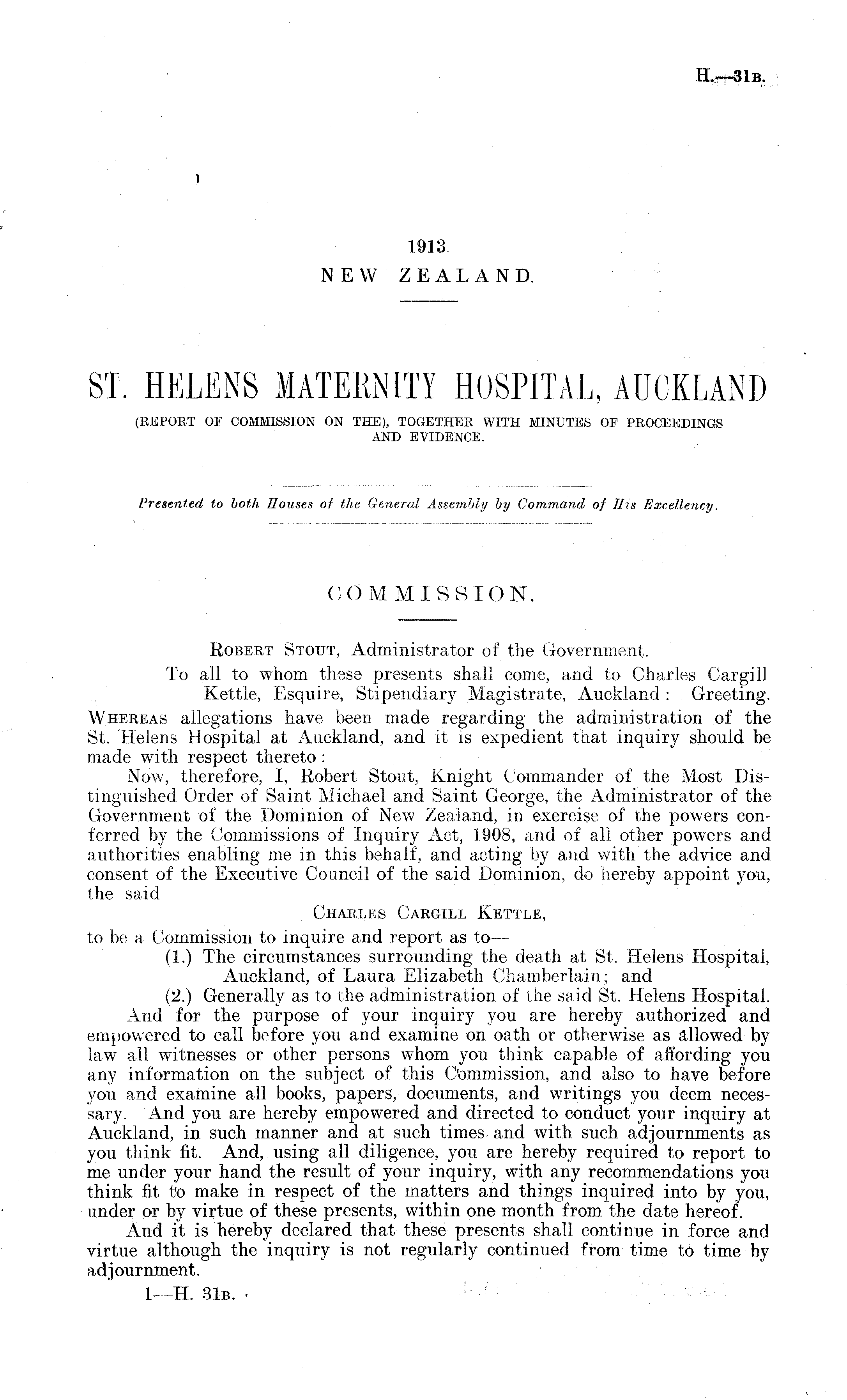 COMMISSION. Robert Stout. Administrator of the Government. To all to whom these presents shall come, and to Charles Cargill Kettle, Esquire, Stipendiary Magistrate, Auckland : Greeting. Whereas allegations have been made regarding the administration of the St. Helens Hospital at Auckland, and it is expedient that inquiry should be made with respect thereto: Now, therefore, I, Robert Stout, Knight Commander of the Most Distinguished Order of Saint Michael and Saint George, the Administrator of the Government of the Dominion of New Zealand, in exercise of the powers conferred by the Commissions of Inquiry Act, 1908, and of all other powers and authorities enabling me in this behalf, and acting by and with the advice and consent of the Executive Council of the said Dominion, do hereby appoint you, the said Charles Cargill Kettle, to be a Commission to inquire and report as to — (1.) The circumstances surrounding the death at St. Helens Hospital, Auckland, of Laura Elizabeth Chamberlain; and (2.) Generally as to the administration of the said St. Helens Hospital. Arid for the purpose of your inquiry you are hereby authorized and empowered to call before you and examine on oath or otherwise as allowed by law all witnesses or other persons whom you think capable of affording you any information on the subject of this Commission, and also to have before you and examine all books, papers, documents, and writings you deem necessary- And you are hereby empowered and directed to conduct your inquiry at Auckland, in such manner and at such times and with such adjournments as you think fit. And, using all diligence, you are hereby required to report to me under your hand the result of your inquiry, with any recommendations you think fit to make in respect of the matters and things inquired into by you, under or by virtue of these presents, within one month from the date hereof. And it is hereby declared that these presents shall continue in force and virtue although the inquiry is not regularly continued from time to time by adjournment.