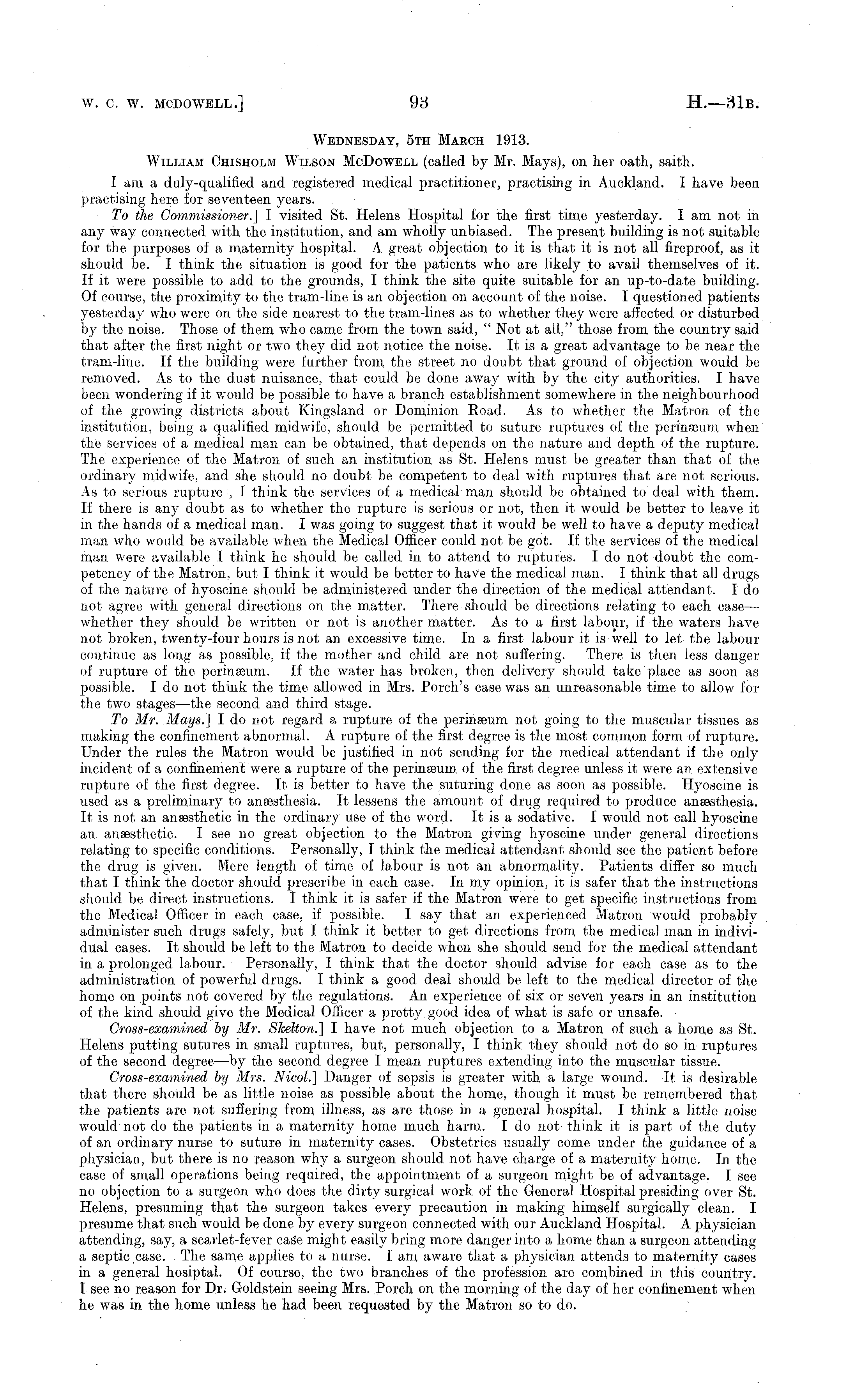 Wednesday, sth March 1913. William Chisholm Wilson McDowell (called by Mr. Mays), on her oath, saith. I am a duly-qualified and registered medical practitioner, practising in Auckland. I have been practising here for seventeen years. To the Commissioner.] I visited St. Helens Hospital for the first time yesterday. I am not in any way connected with the institution, and am wholly unbiased. The present building is not suitable for the purposes of a maternity hospital. A great objection to it is that it is not all fireproof, as it should be. I think the situation is good for the patients who are likely to avail themselves of it. If it were possible to add to the grounds, I think the site quite suitable for an up-to-date building. Of course, the proximity to the tram-line is an objection on account of the noise. I questioned patients yesterday who were on the side nearest to the tram-lines as to whether they were affected or disturbed by the noise. Those of them who came from the town said, " Not at all," those from the country said that after the first night or two they did not notice the noise. It is a great advantage to be near the tram-line. If the building were further from the street no doubt that ground of objection would bo removed. As to the dust nuisance, that could be done away with by the city authorities. I have been wondering if it would be possible to have a branch establishment somewhere in the neighbourhood of the growing districts about Kingsland or Dominion Road. As to whether the Matron of the institution, being a qualified midwife, should be permitted to suture ruptures of the perinaeum when the services of a medical man can be obtained, that depends on the nature and depth of the rupture. The experience of the Matron of such an institution as St. Helens must be greater than that of the ordinary niidw 7 ife, and she should no doubt be competent to deal with ruptures that are not serious. As to serious rupture , I think the services of a medical man should be obtained to deal with them. If there is any doubt as to whether the rupture is serious or not, then it would be better to leave it in the hands of a medical man. I w 7 as going to suggest that it would be well to have a deputy medical man who would be available when the Medical Officer could not be got. If the services of the medical man, were available I think he should be called in to attend to ruptures. Ido not doubt the competency of the Matron, but I think it would be better to have the medical man. I think that all drugs of the nature of hyoscine should be administered under the direction of the medical attendant. Ido not agree with general directions on the matter. There should be directions relating to each case — whether they should be written or not is another matter. As to a first labour, if the waters have not broken, twenty-four hours is not an excessive time. In a first labour it is well to let the labour continue as long as possible, if the mother and child are not suffering. There is then less danger of rupture of the perinaeum. If the water has broken, then delivery should take place as soon as possible. Ido not think the time allowed in Mrs. Porch's case was an unreasonable time to allow for the two stages —the second and third stage. To Mr. Mays.] I do not regard a rupture of the perinaeum not going to the muscular tissues as making the confinement abnormal. A rupture of the first degree is the most common form of rupture. Under the rules the Matron would be justified in not sending for the medical attendant if the only incident of a confinement were a rupture of the perinaeum of the first degree unless it were an extensive rupture of the first degree. It is better to have the suturing done as soon as possible. Hyoscine is used as a preliminary to anaesthesia. It lessens the amount of drug required to produce anaesthesia. It is not an anaesthetic in the ordinary use of the w 7 ord. It is a sedative. I would not call hyoscine an anaesthetic. I see no great objection to the Matron giving hyoscine under general directions relating to specific conditions. Personally, I think the medical attendant should see the patient before the drug is given. Mere length of time of labour is not an abnormality. Patients differ so much that I think the doctor should prescribe in each case. In my opinion, it is safer that the instructions should be direct instructions. I think it is safer if the Matron were to get specific instructions from the Medical Officer in each case, if possible. 1 say that an experienced Matron would probably administer such drugs safely, but I think it better to get directions from the medical man in individual cases. It should be left to the Matron to decide when she should send for the medical attendant in a prolonged labour. Personally, I think that the doctor should advise for each case as to the administration of powerful drugs. I think a good deal should be left to the medical director of the home on points not covered by the regulations. An experience of six or seven years in an institution of the kind should give the Medical Officer a pretty good idea of what is safe or unsafe. Cross-examined by Mr. Skelton.] I have not much objection to a Matron of such a home as St. Helens putting sutures in small ruptures, but, personally, I think they should not do so in ruptures of the second degree —by the second degree I mean ruptures extending into the muscular tissue. Cross-examined by Mrs. Nicol.] Danger of sepsis is greater with a large wound. It is desirable that there should be as little noise as possible about the home, though it must be remembered that the patients are not suffering from illness, as are those in a general hospital. I think a little noise would not do the patients in a maternity home much harm. I do not think it is part of the duty of an ordinary nurse to suture in maternity cases. Obstetrics usually come under the guidance of a physician, but there is no reason why