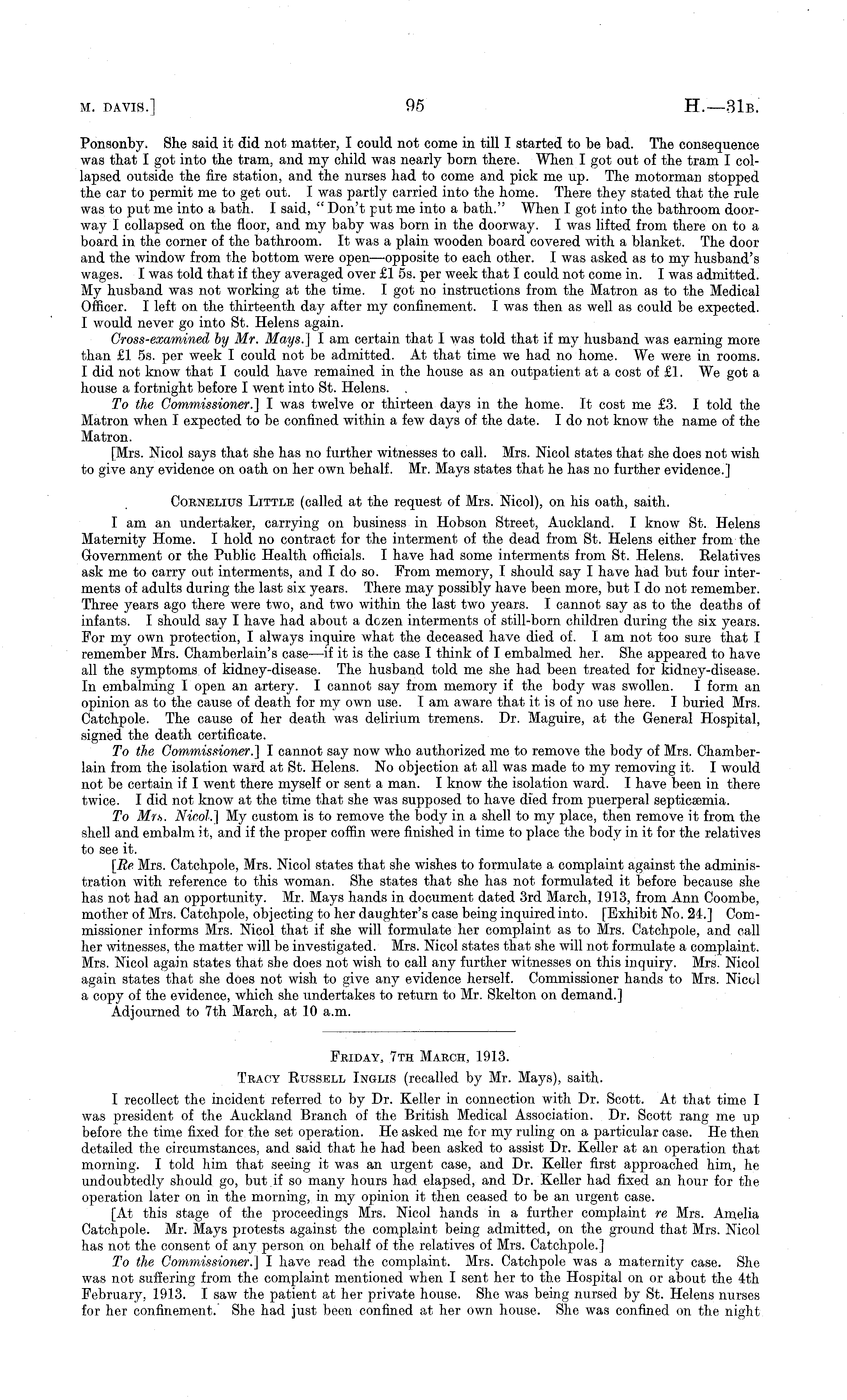 Ponsonby. She said it did not matter, I could not come in till I started to be bad. The consequence was that I got into the tram, and my child was nearly born there. When I got out of the tram I collapsed outside the fire station, and the nurses had to come and pick me up. The motorman stopped the car to permit me to get out. I was partly carried into the home. There they stated that the rule was to put me into a bath. I said, " Don't put me into a bath." When I got into the bathroom doorway I collapsed on the floor, and my baby was born in the doorway. I was lifted from there on to a board in the corner of the bathroom. It was a plain wooden board covered with a blanket. The door and the window from the bottom were open —opposite to each other. I was asked as to my husband's wages. I was told that if they averaged over £1 ss. per week that I could not come in. I was admitted. My husband was not working at the time. I got no instructions from the Matron as to the Medical Officer. I left on the thirteenth day after my confinement. I was then as well as could be expected. I w 7 ould never go into St. Helens again. Cross-examined by Mr. Mays.] I am certain that I was told that if my husband was earning more than £1 ss. per week I could not be admitted. At that time w 7 e had no home. We were in rooms. I did not know that I could have remained in the house as an outpatient at a cost of £1. We got a house a fortnight before I went into St. Helens. . To the Commissioner.] I was twelve or thirteen days in the home. It cost me £3. I told the Matron when I expected to be confined within a few days of the date. Ido not know the name of the Matron. [Mrs. Nicol says that she has no further witnesses to call. Mrs. Nicol states that she does not wish to give any evidence on oath on her own behalf. Mr. Mays states that he has no further evidence.] Cornelius Little (called at the request of Mrs. Nicol), on his oath, saith. I am an undertaker, carrying on business in Hobson Street, Auckland. I know St. Helens Maternity Home. I hold no contract for the interment of the dead from St. Helens either from the Government or the Public Health officials. I have had some interments from St. Helens. Relatives ask me to carry out interments, and Ido so. From memory, I should say I have had but four interments of adults during the last six years. There may possibly have been more, but Ido not remember. Three years ago there were two, and two within the last two years. I cannot say as to the deaths of infants. I should say I have had about a dozen interments of still-born children during the six years. For my own protection, I always inquire what the deceased have died of. lam not too sure that I remember Mrs. Chamberlain's case—if it is the case I think of I embalmed her. She appeared to have all the symptoms of kidney-disease. The husband told me she had been treated for kidney-disease. In embalming I open an artery. I cannot say from memory if the body was swollen. I form an opinion as to the cause of death for my own use. lam aware that it is of no use here. I buried Mrs. Catchpole. The cause of her death was delirium tremens. Dr. Maguire, at the General Hospital, signed the death certificate. To the Commissioner.] I cannot say now who authorized me to remove the body of Mrs. Chamberlain from the isolation ward at St. Helens. No objection at all was made to my removing it. I would not be certain if I went there myself or sent a man. I know the isolation ward. I have been in there twice. I did not know at the time that she was supposed to have died from puerperal septicaemia. To Mrs. Nicol.] My custom is to remove the body in a shell to my place, then remove it from the shell and embalm it, and if the proper coffin were finished in time to place the body in it for the relatives to see it. [Re Mrs. Catchpole, Mrs. Nicol states that she wishes to formulate a complaint against the administration with reference to this woman. She states that she has not formulated it before because she has not had an opportunity. Mr. Mays hands in document dated 3rd March, 1913, from Ann Coombe, mother of Mrs. Catchpole, objecting to her daughter's case being inquired into. [Exhibit No. 24.] Commissioner informs Mrs. Nicol that if she will formulate her complaint as to Mrs. Catchpole, and call her witnesses, the matter will be investigated. Mrs. Nicol states that she will not formulate a complaint. Mrs. Nicol again states that she does not wish to call any further witnesses on this inquiry. Mrs. Nicol again states that she does not wish to give any evidence herself. Commissioner hands to Mrs. Nicol a copy of the evidence, which she undertakes to return to Mr. Skelton on demand.] Adjourned to 7th March, at 10 a.m.